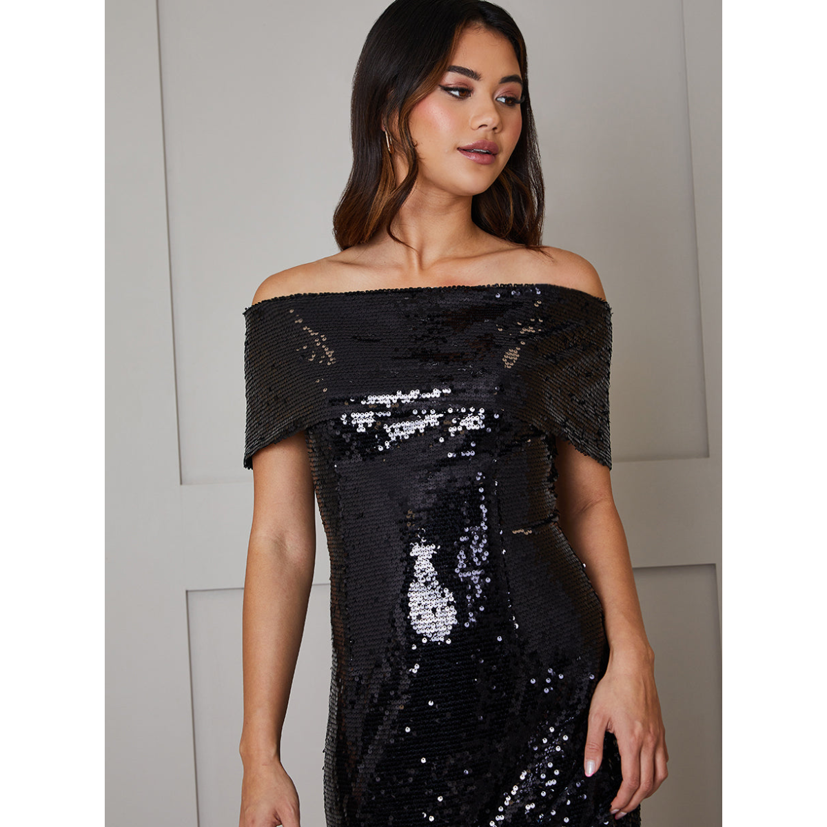 Fit: Main Collection. Designed and crafted to ensure you feel beautiful, confident and desired, each piece in our Chi Chi collection is uniquely designed in-house to complement you and your style. Length: Midi. Size 8 wearing length from side neck point = 115cm. I sit mid to upper shin of someone of average height. Fabrication: Sequin. I am a premium product, made of delicate sequin material, therefore please watch for sharp objects that could snag my sequins. I do not stretch. Fabric Composition: Shell: 100% Polyester Lining: 100% Polyester Lining: I am lined. Wash Care: Dry Clean Only. I am made from delicate fabrics that need a bit of extra care and are not suitable for the washing machine, so please Dry Clean me only. Fabric Care: I am a delicate material, therefore please watch for sharp objects that could snag my material. I do not stretch. Fastening: I fasten with a concealed back zip. Additional Benefits: I have been designed to add some sparkle to your wardrobe, in a all over black sequin fabric. My off the shoulder design is flattering whilst my bodycon shape gives that extra feminine look. Pair me with your favourite heels to complete the look. Perfect for: Party & Nights Out Product Code: EM23032403BK