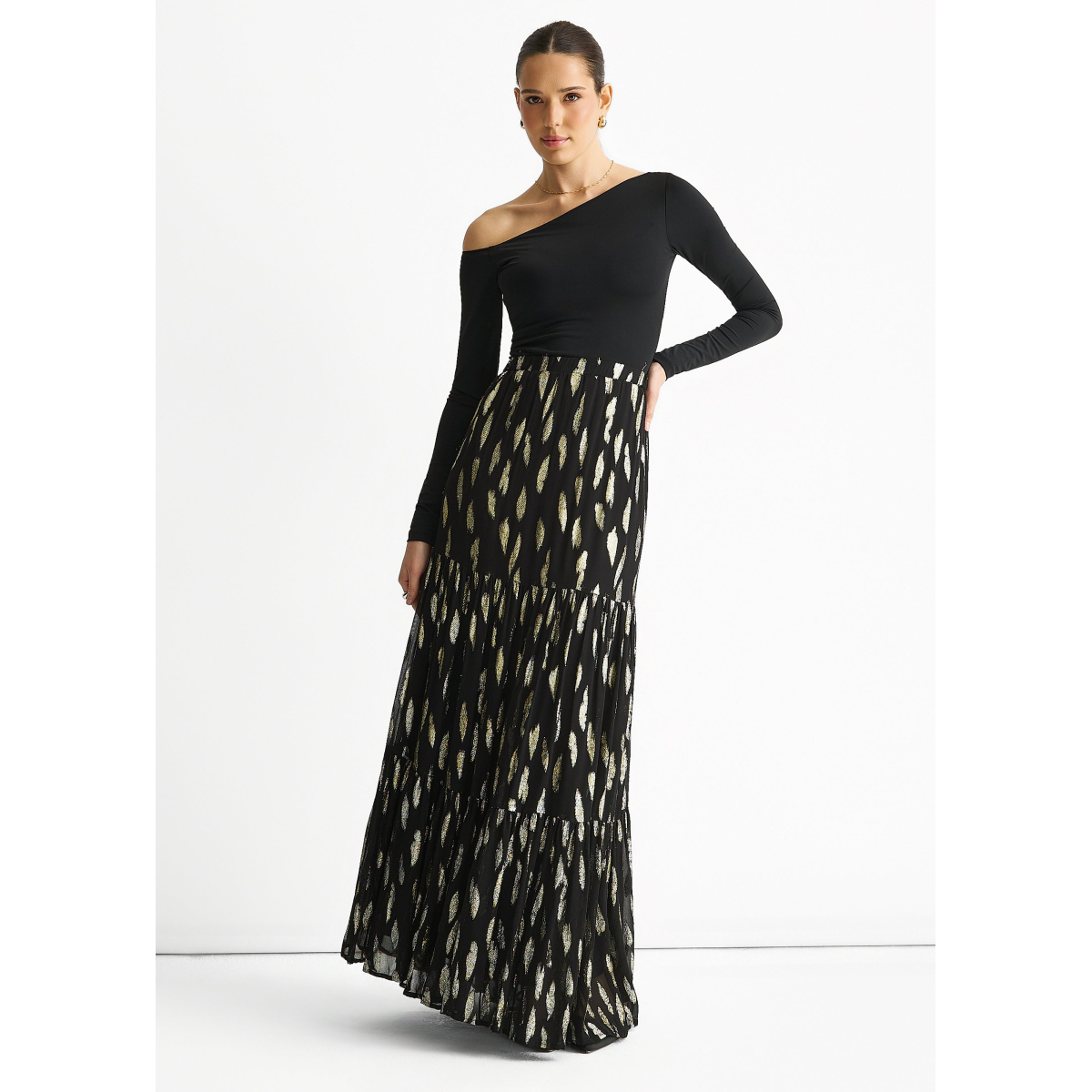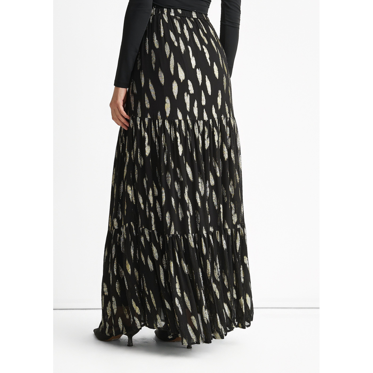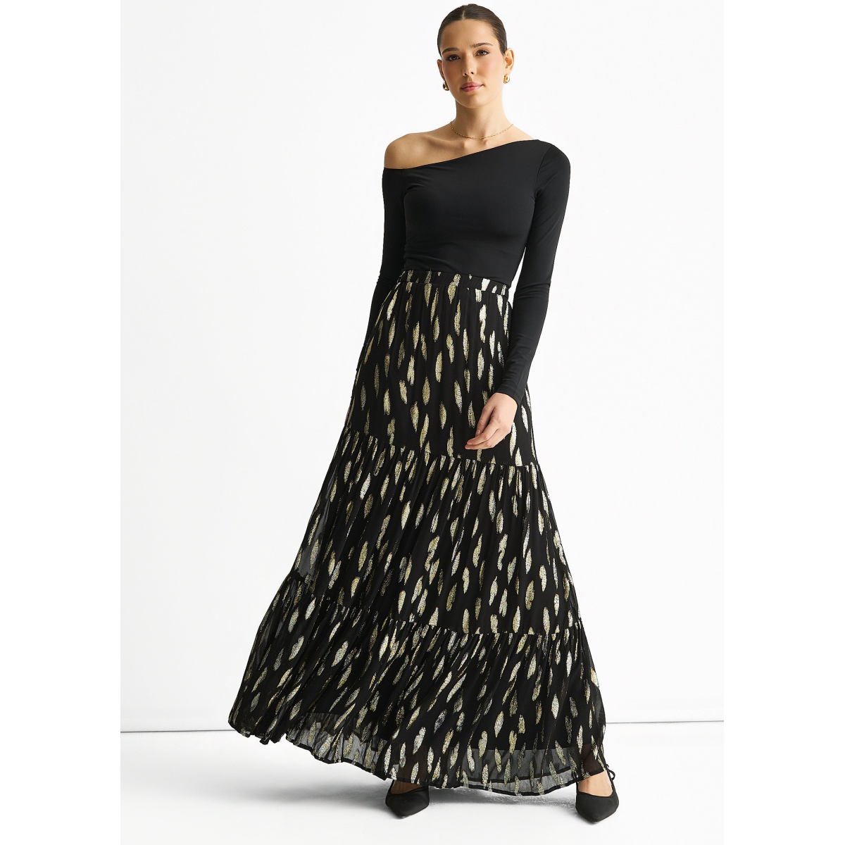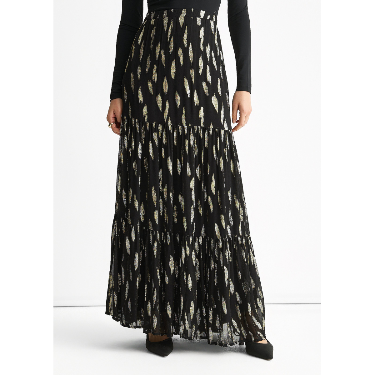 The Black Clipped Jacquard Tiered Maxi Skirt combines bold style with effortless comfort. Its tiered design adds movement and dimension, while the jacquard fabric offers a subtle textured pattern for a unique look. Perfect for casual days when you want to feel confident and comfortable in a standout piece.