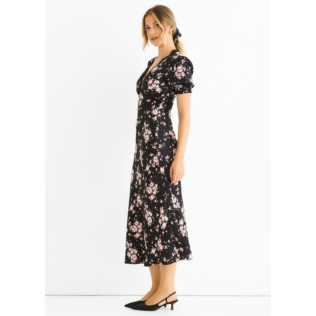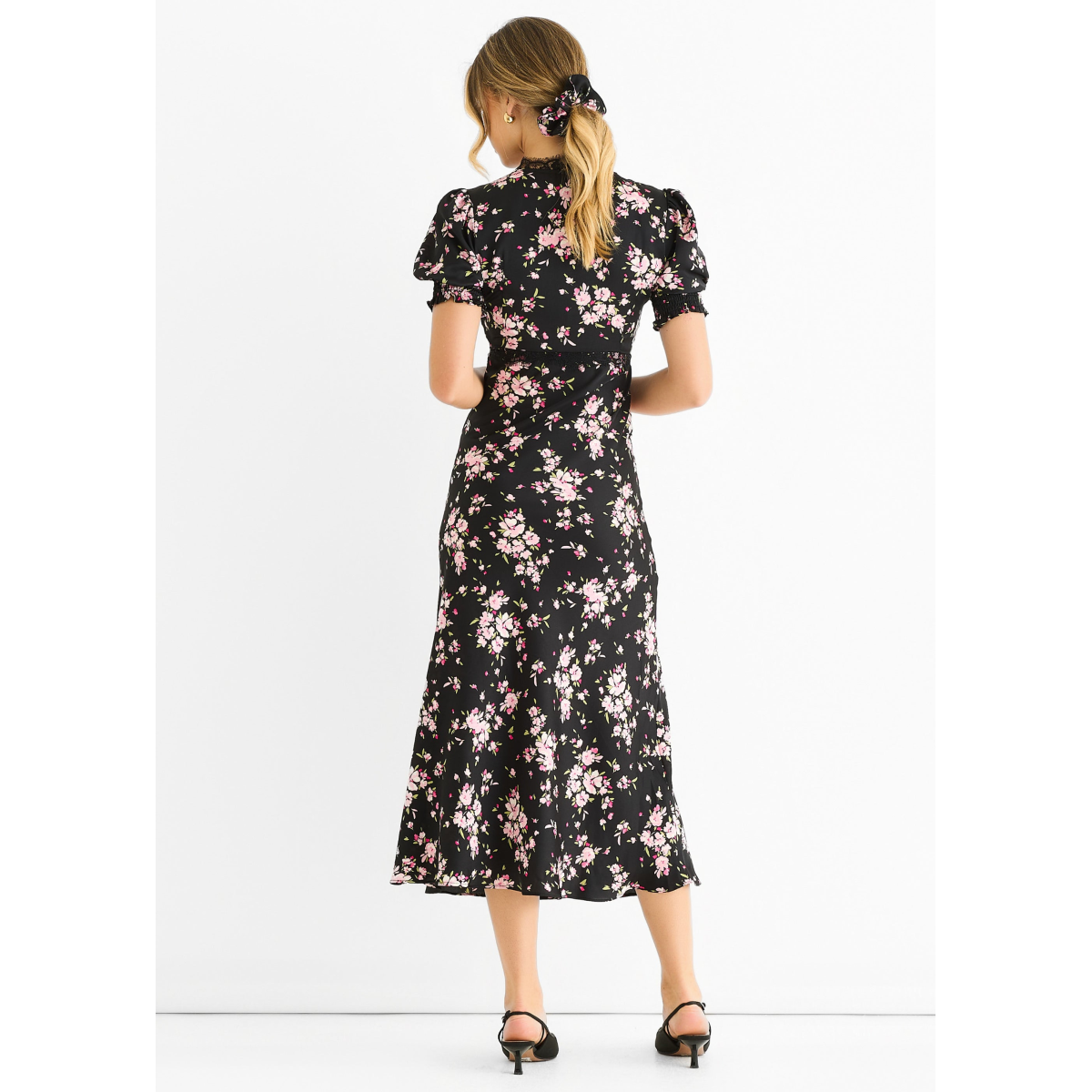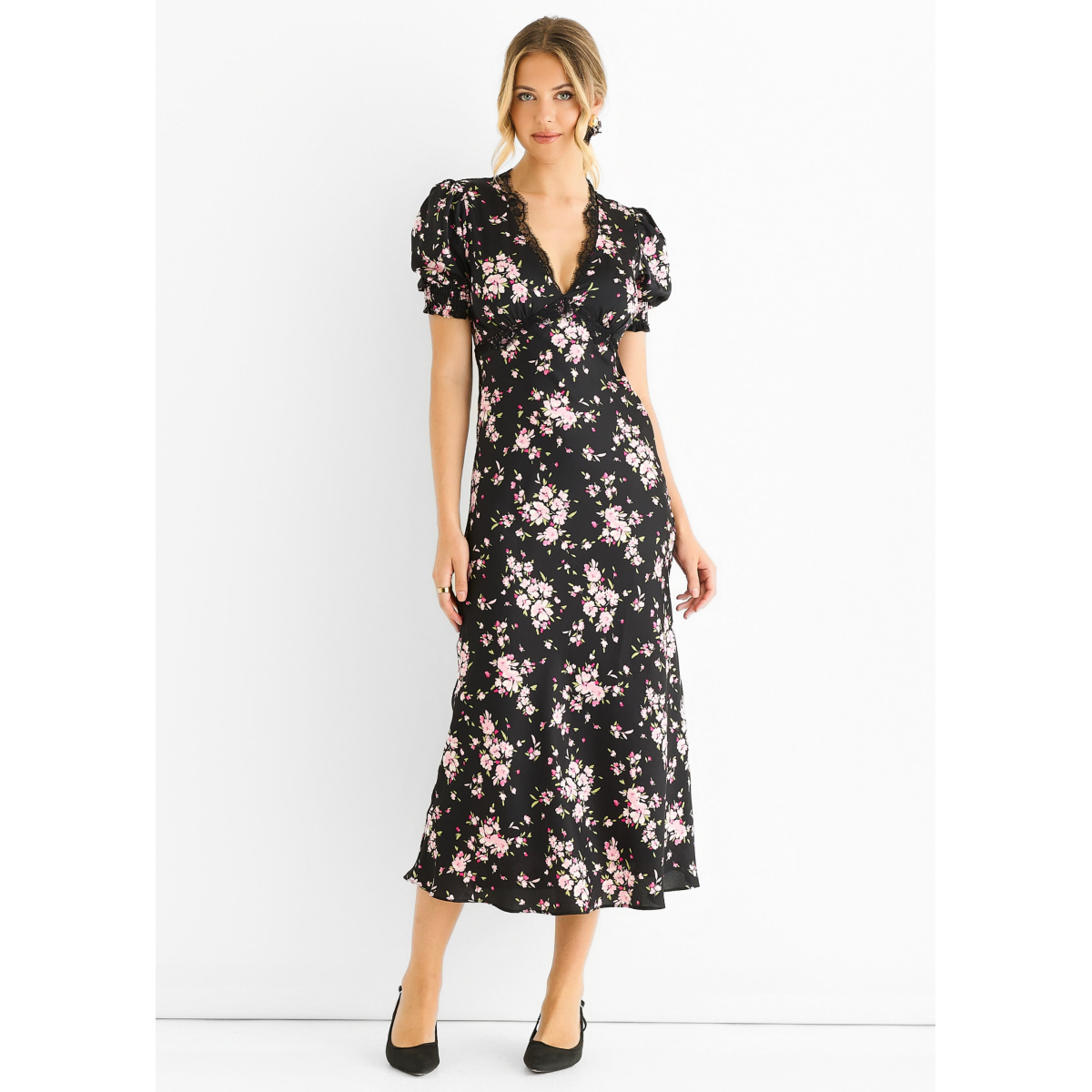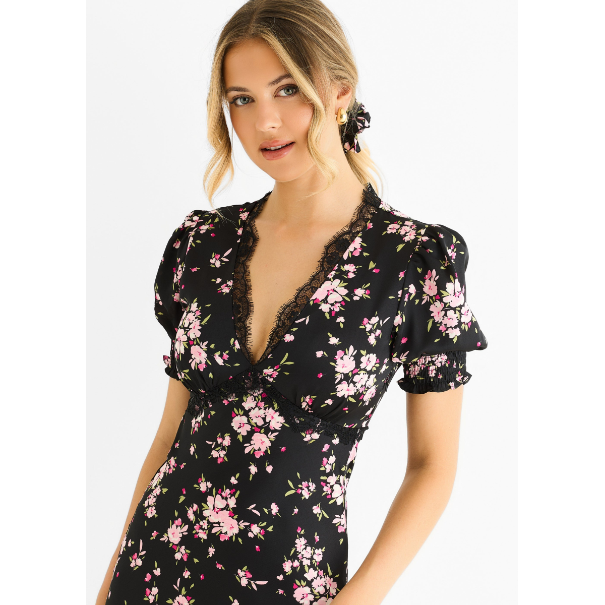 This Black Floral Lace Trim Bias Midi Dress combines casual ease with a bold, stylish edge. The bias cut ensures a comfortable, flattering fit that moves with you, while the delicate floral lace trim adds a touch of feminine sophistication. Perfect for everyday wear or making a confident statement, this dress balances comfort and standout style effortlessly.