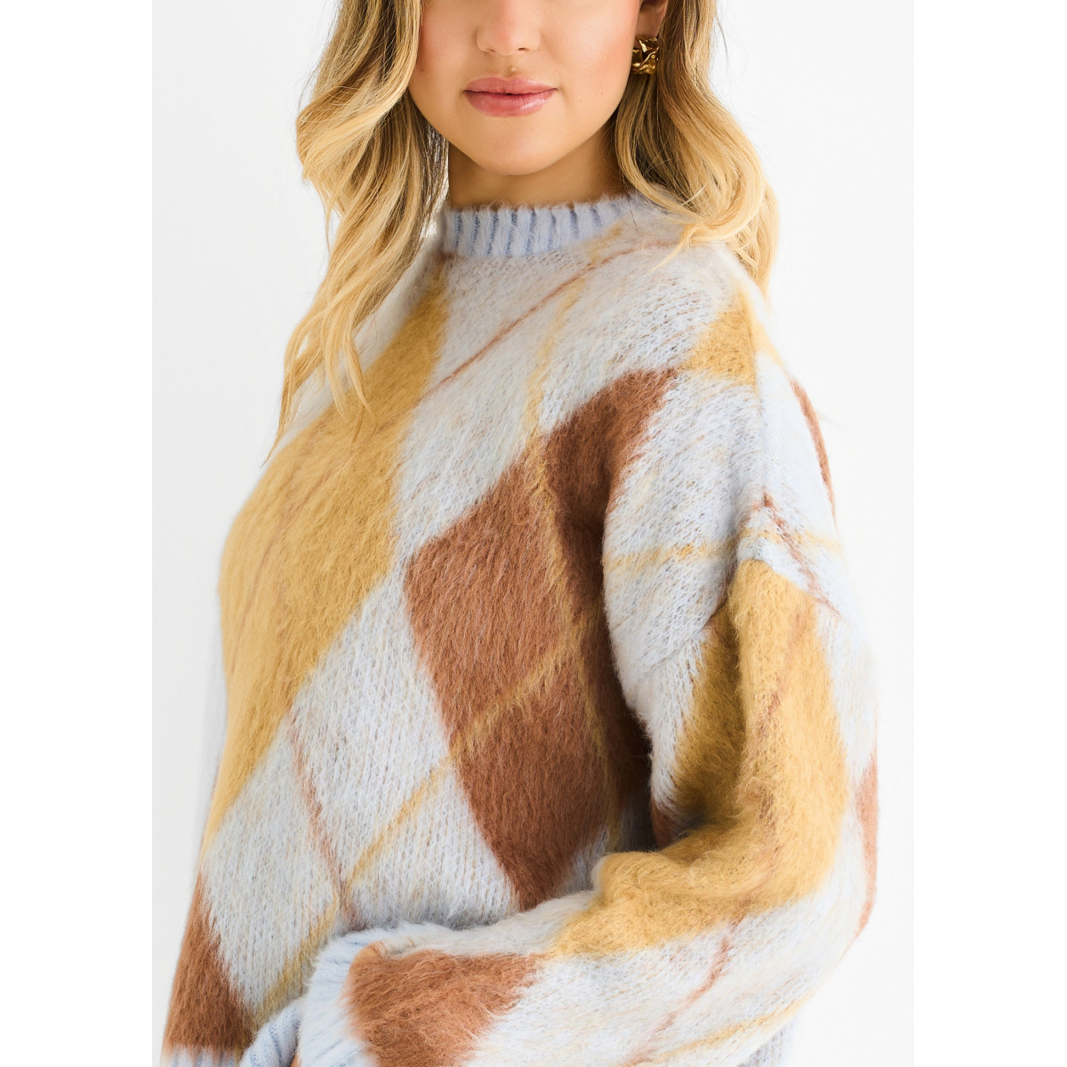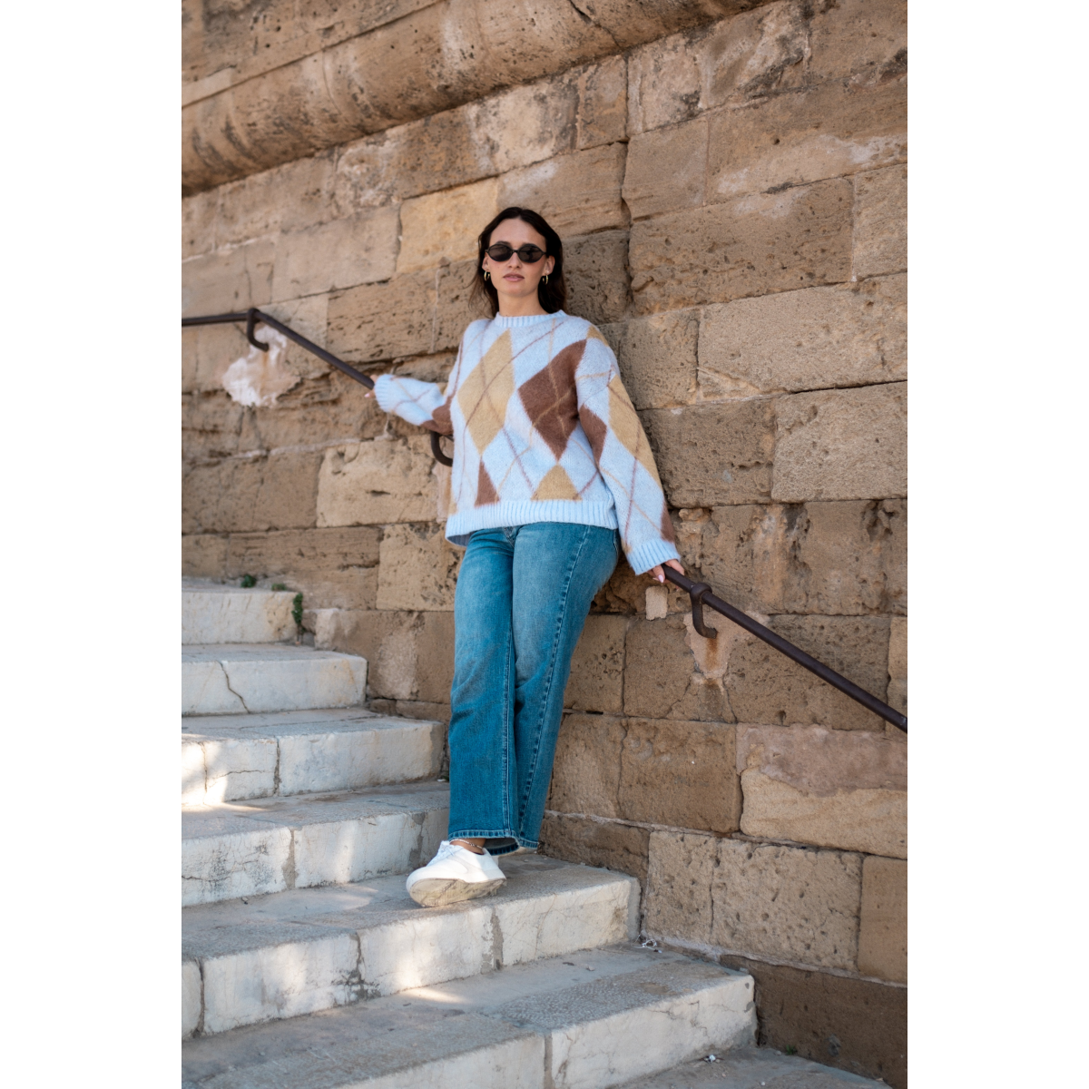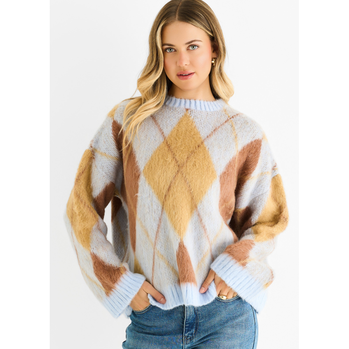 Stay stylish and cozy with this Blue Argyle Knit Round Neck Jumper. Crafted for comfort, its classic argyle pattern adds a bold touch to your casual wardrobe. Perfect for layering or wearing on its own, this jumper combines timeless design with everyday ease.