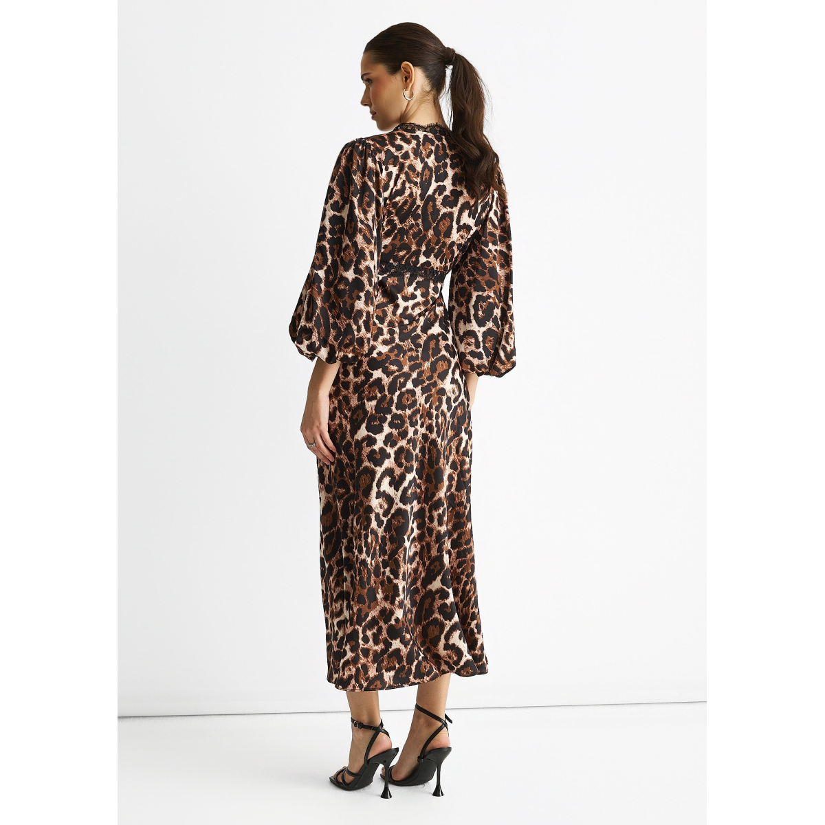Brown Animal Lace Trim Satin Bias Midi Dress
