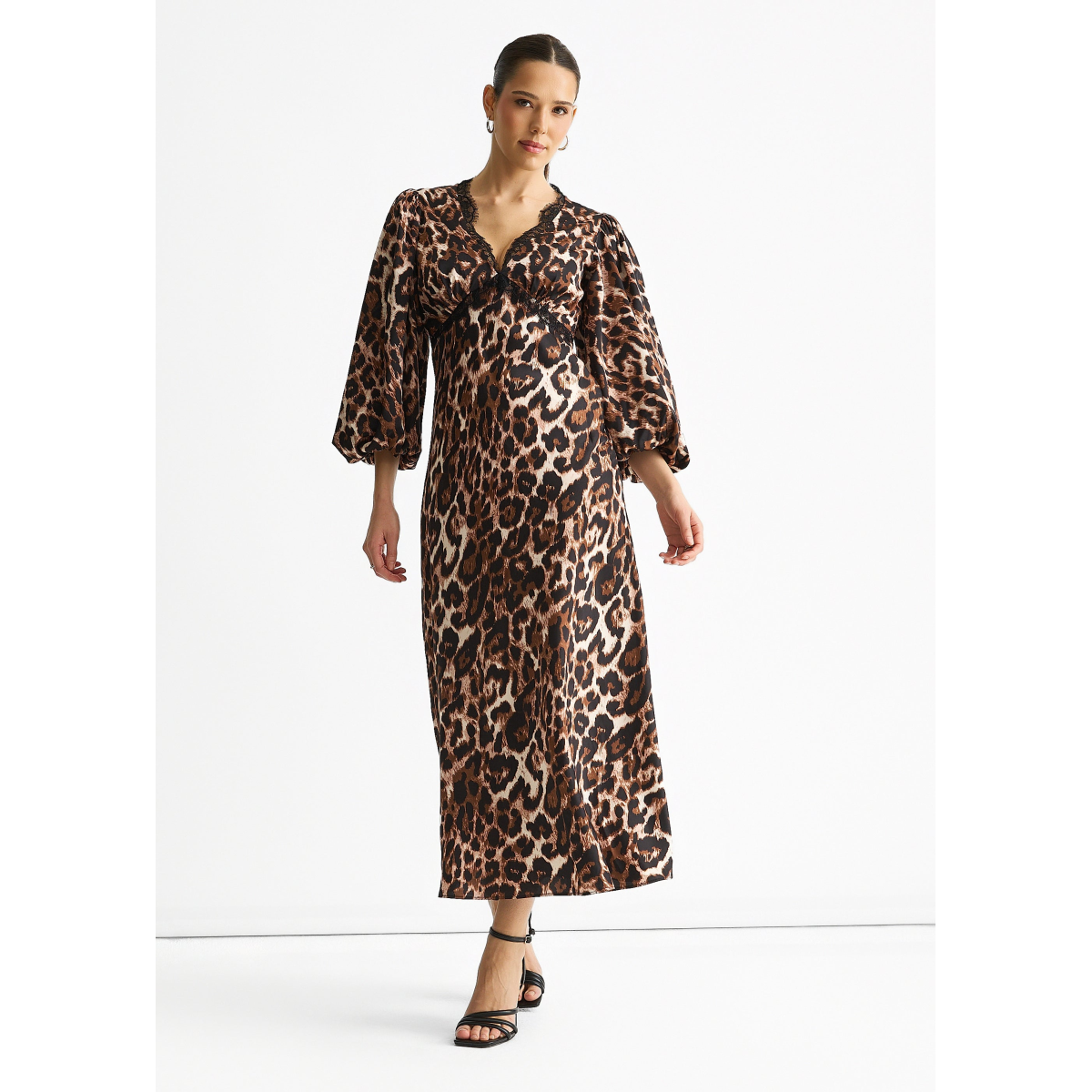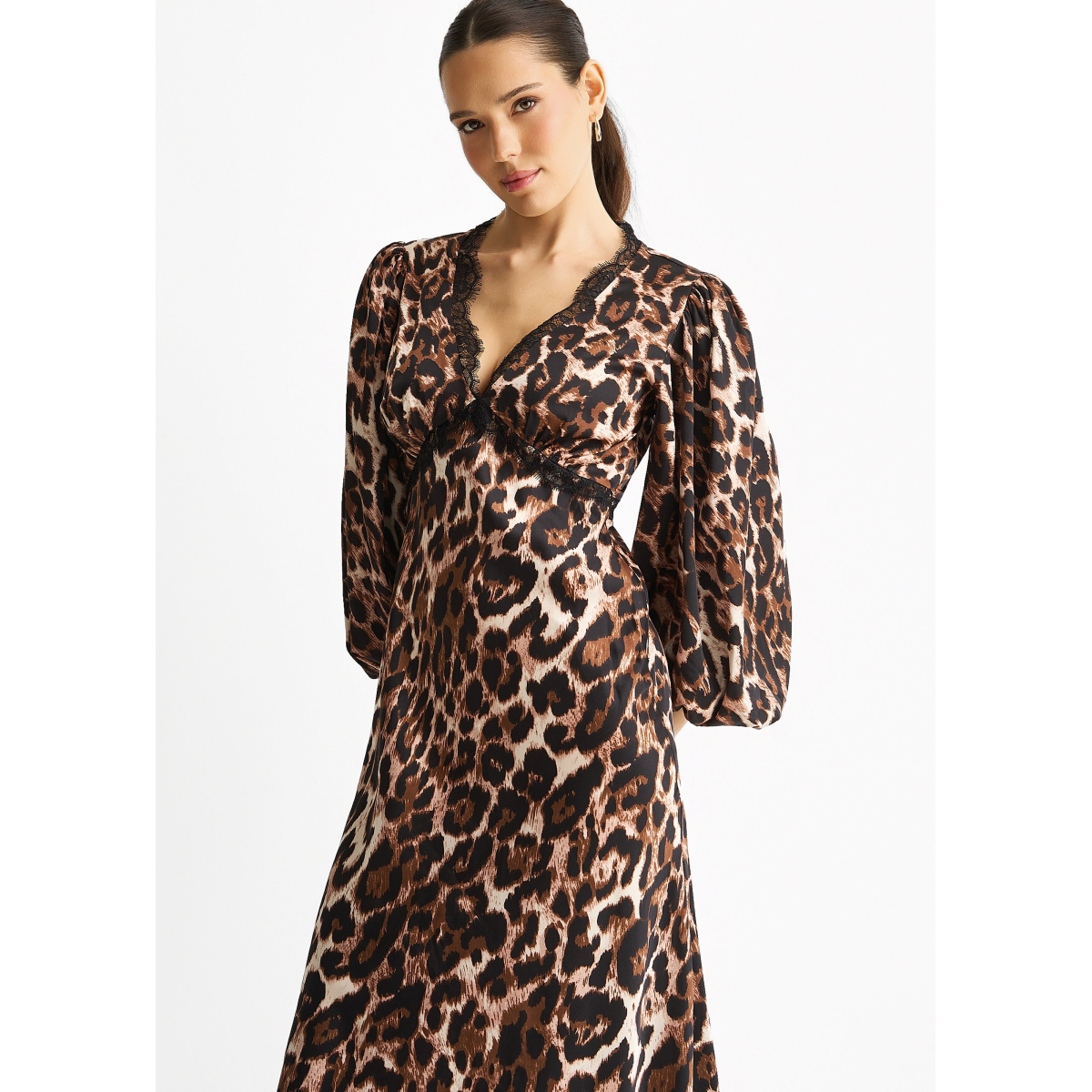 This Brown Animal Lace Trim Satin Bias Midi Dress offers a perfect blend of casual comfort and bold style. Crafted from smooth satin with a flattering bias cut, it drapes effortlessly for all-day ease. The striking animal print paired with delicate lace trim adds a daring touch, making it ideal for confident, comfortable wear on any occasion.