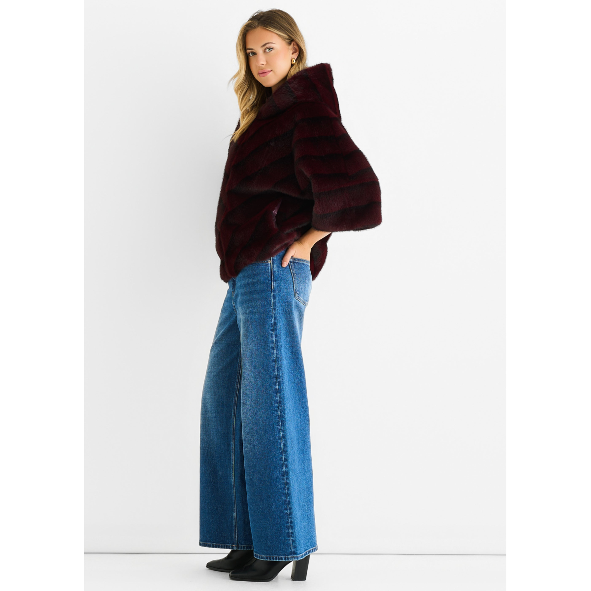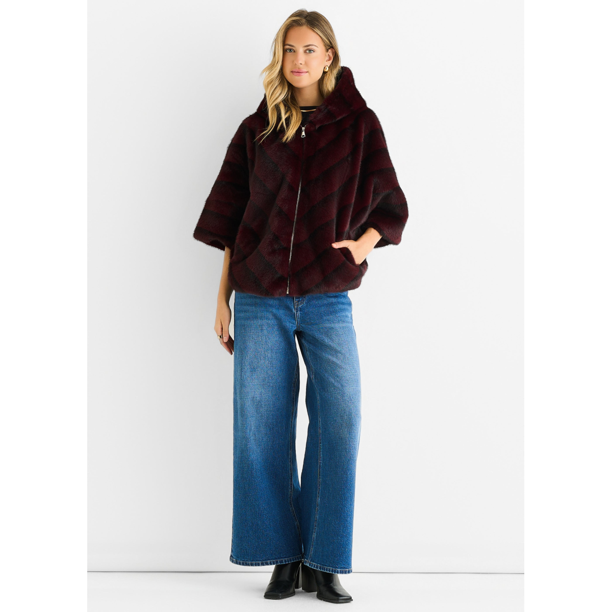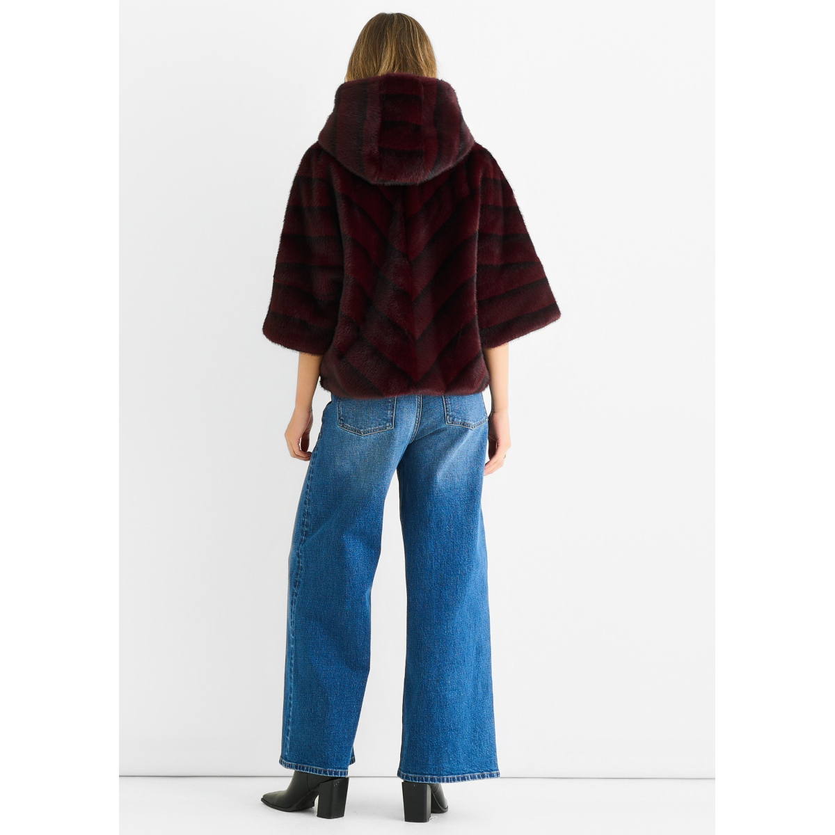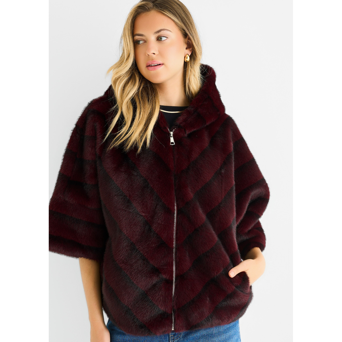 Burgundy Hooded Chevron Faux Fur Cape Jacket