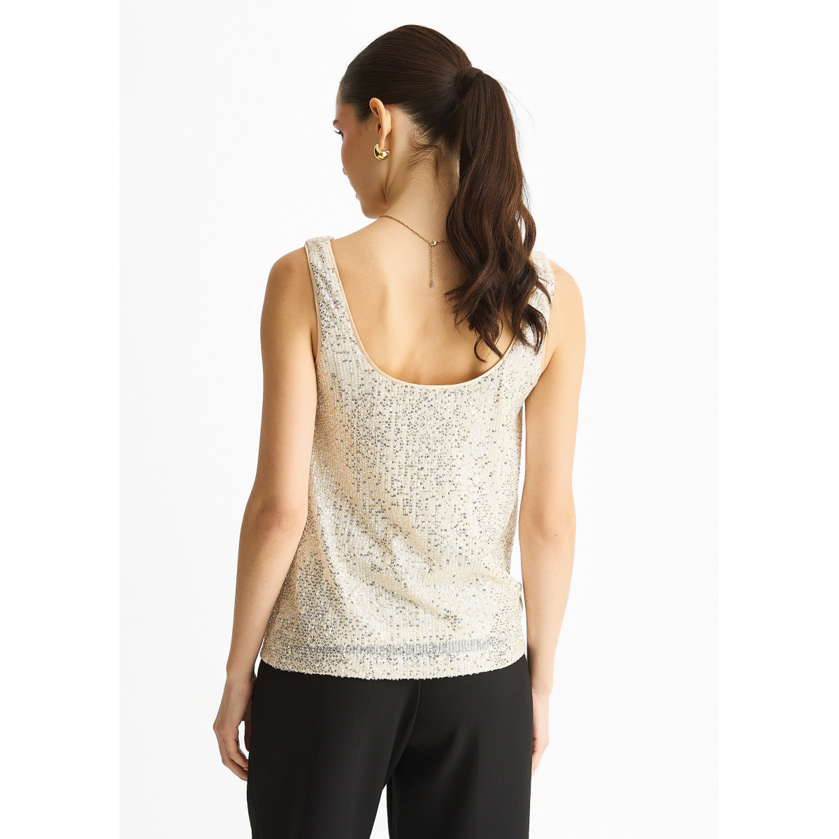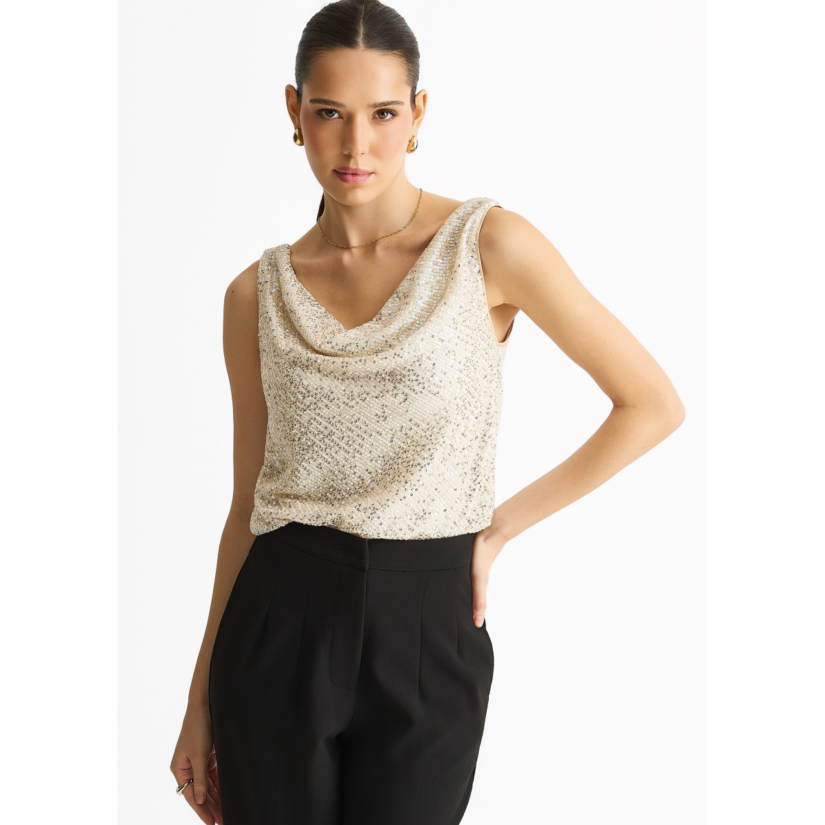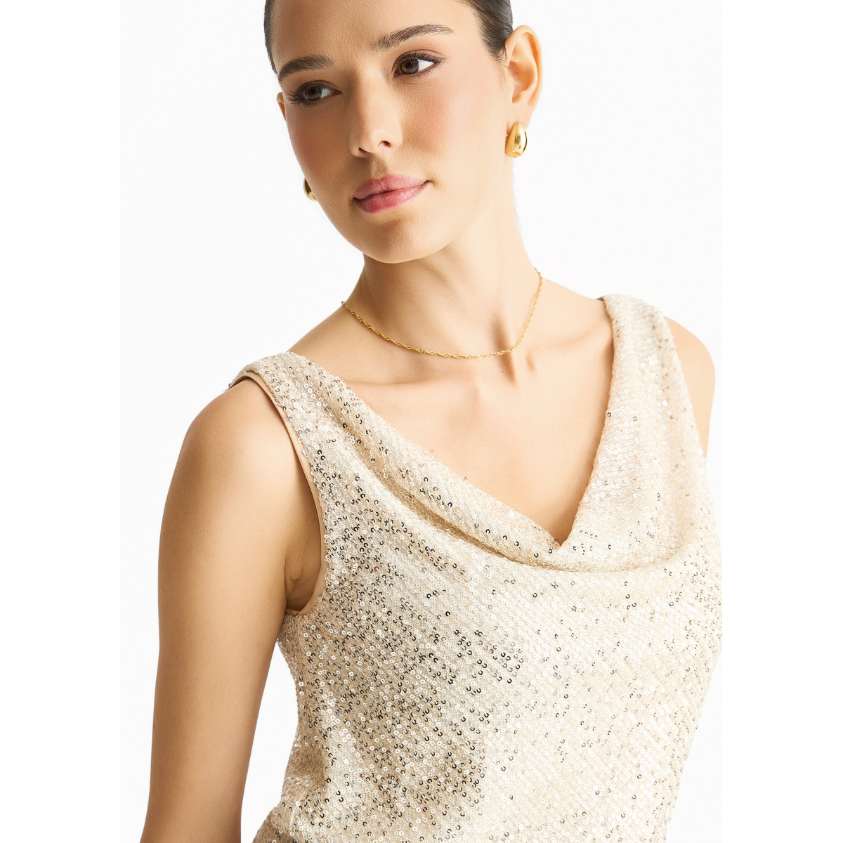 Add a touch of sparkle to your everyday style with the Champagne Sequin Cowl Neck Cami Top. Designed for comfort and boldness, its relaxed fit and shimmering sequins make it perfect for casual outings or evening events where you want to stand out effortlessly.