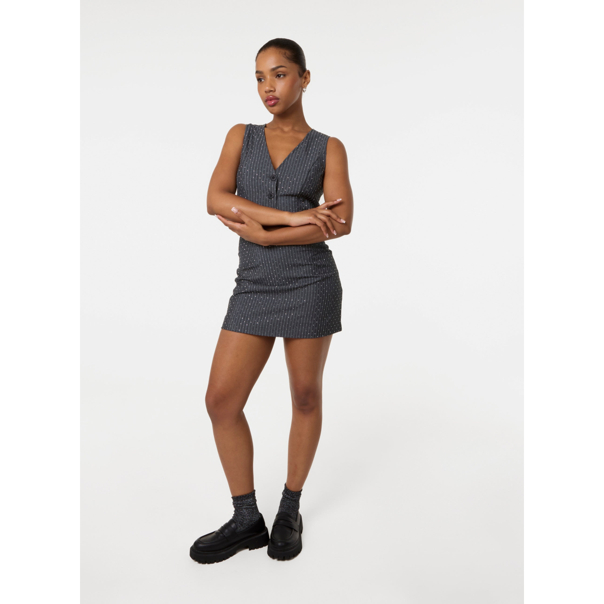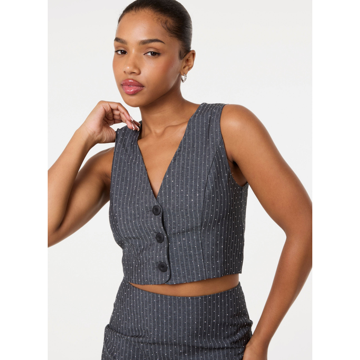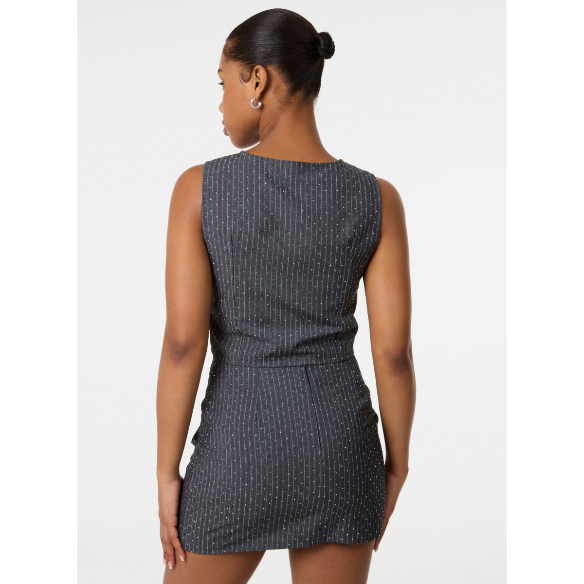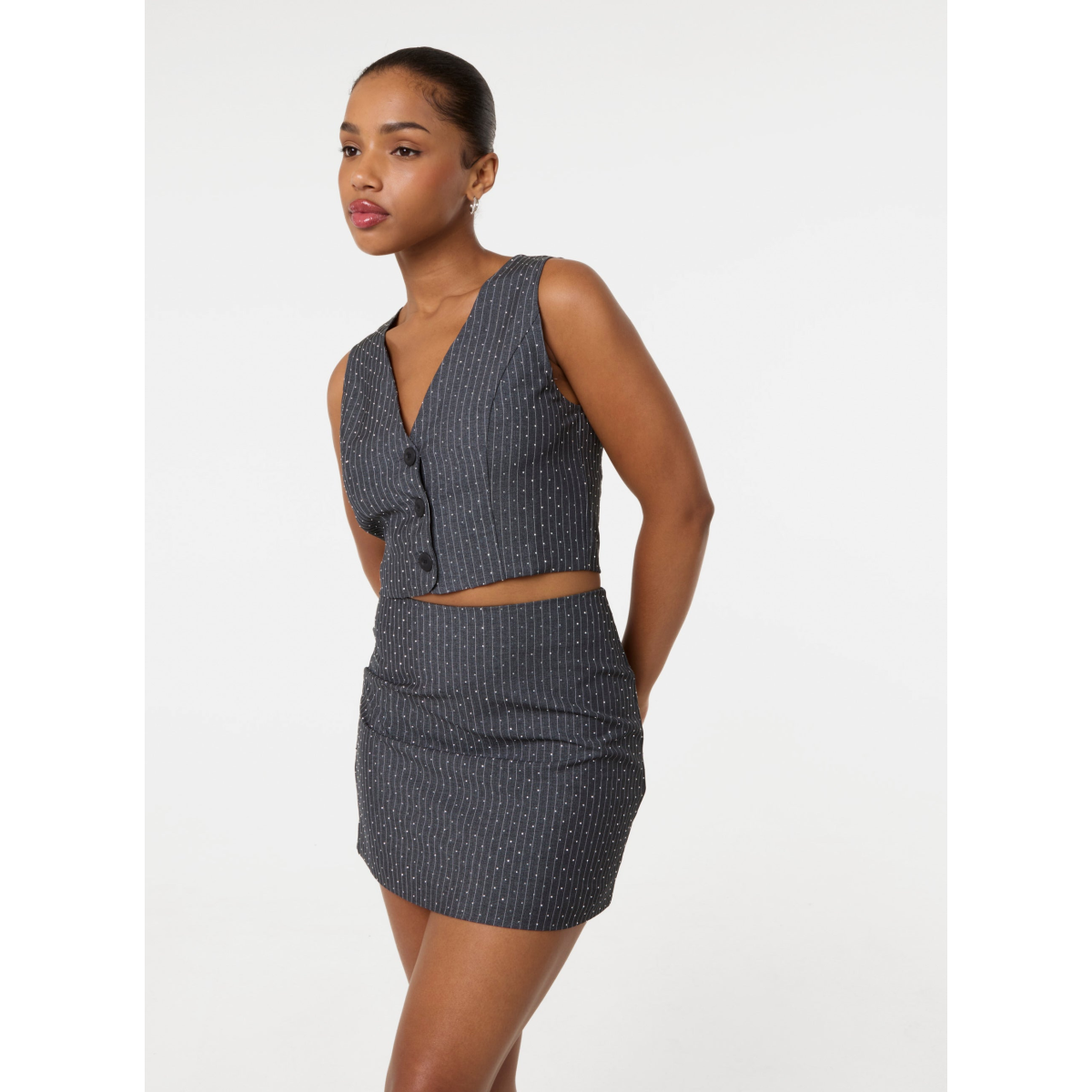 Make glam and fancy a thing with this cute waistcoat + skirt set. Embellished with diamantes all over, it features a pinstripe fabric and a sleek fit. Perfect for a day to night look.