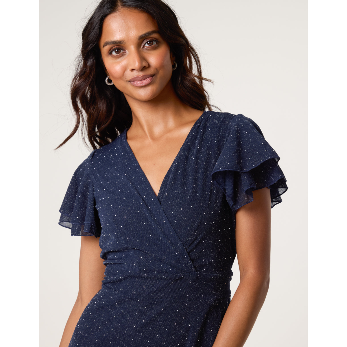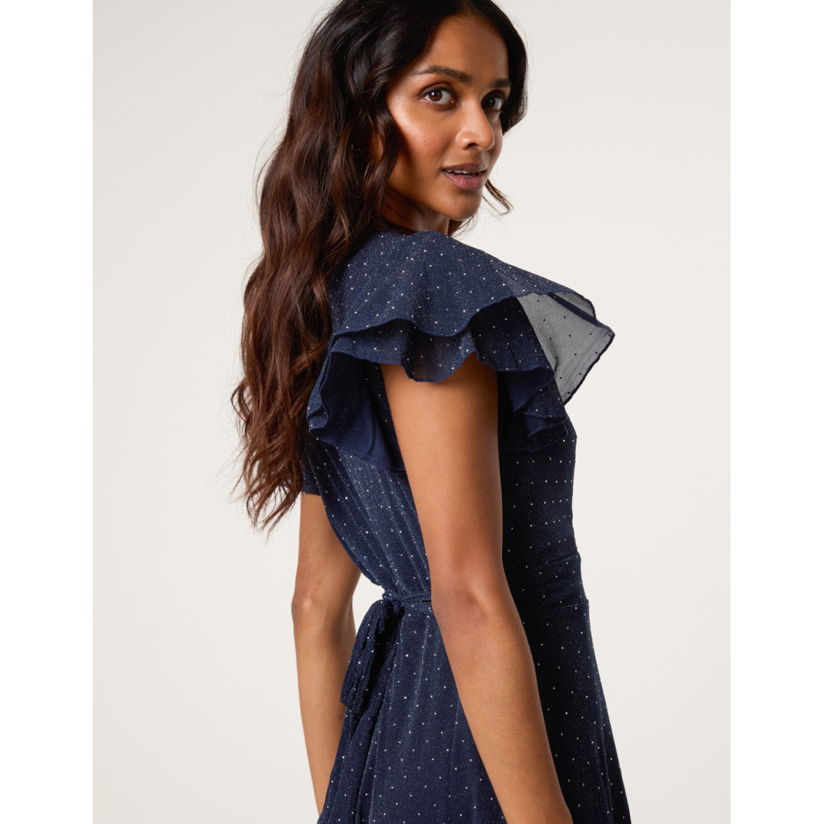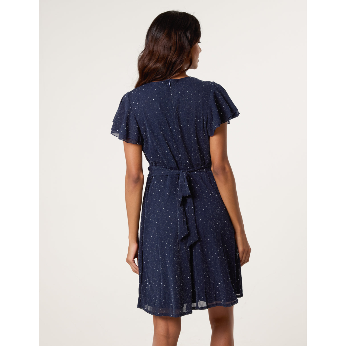 Eye-catching for all the right reasons, team this stud detailed wrap front dress with sheer tights and silver court heels for the ultimate partywear look.