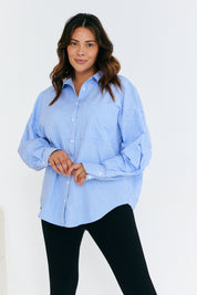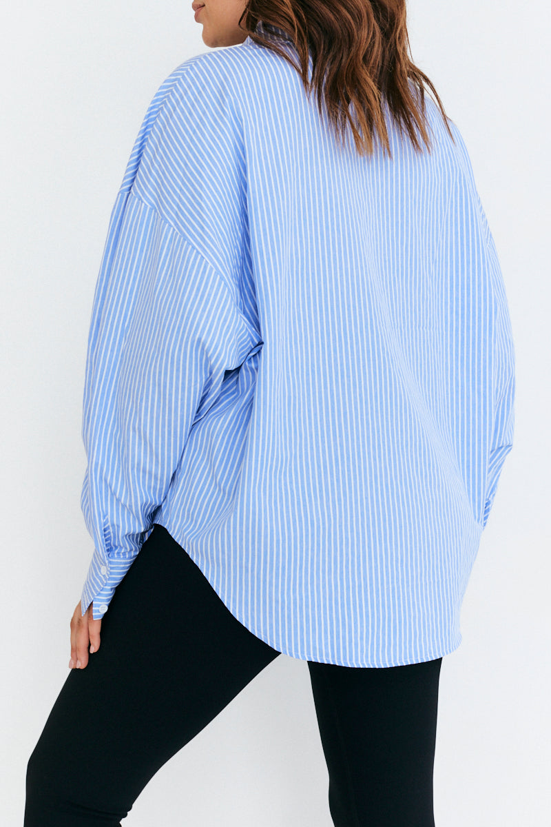 This blue shirt with a stripe pattern and poplin material with an oversized fit will be perfect over tops and jeans this season for a stylish look.