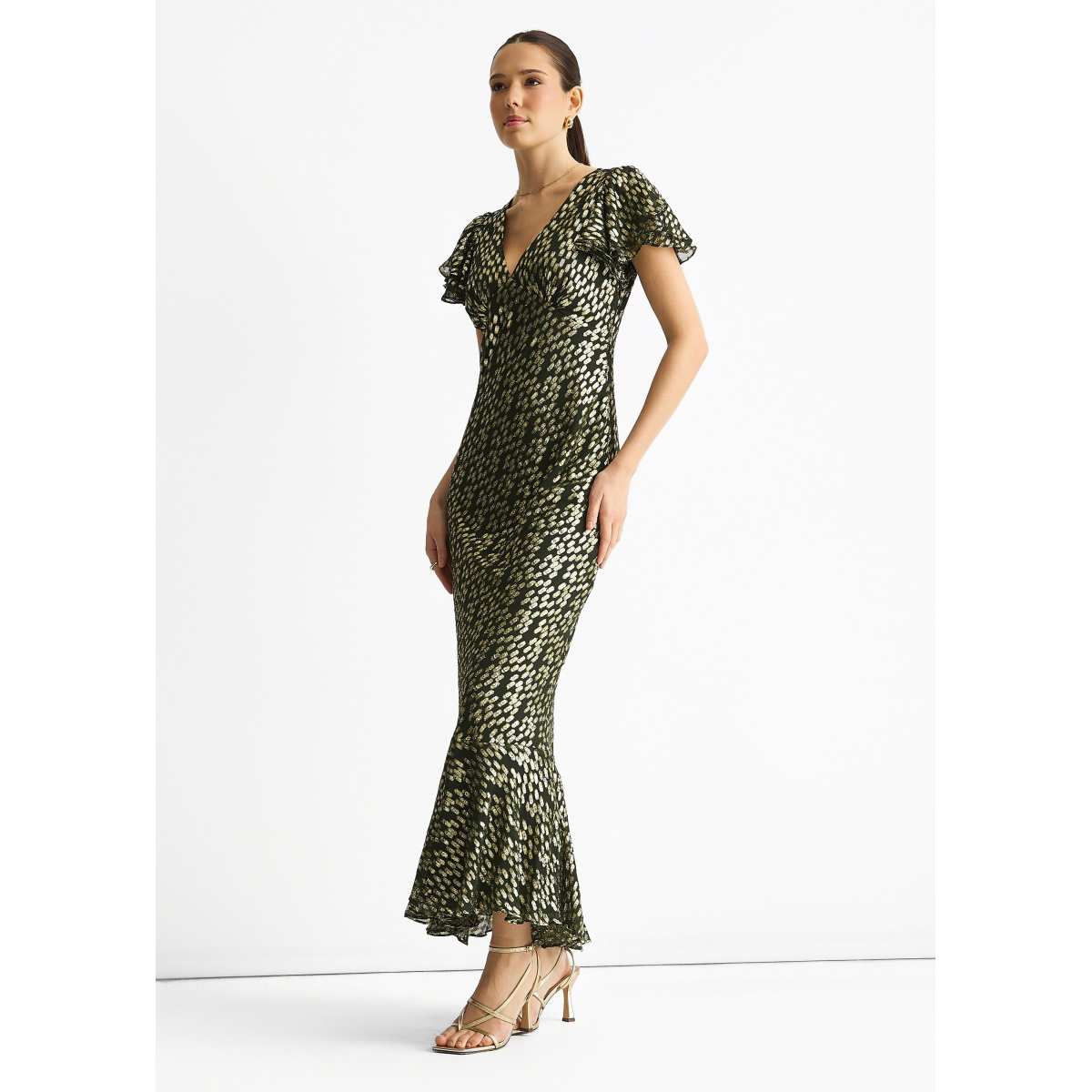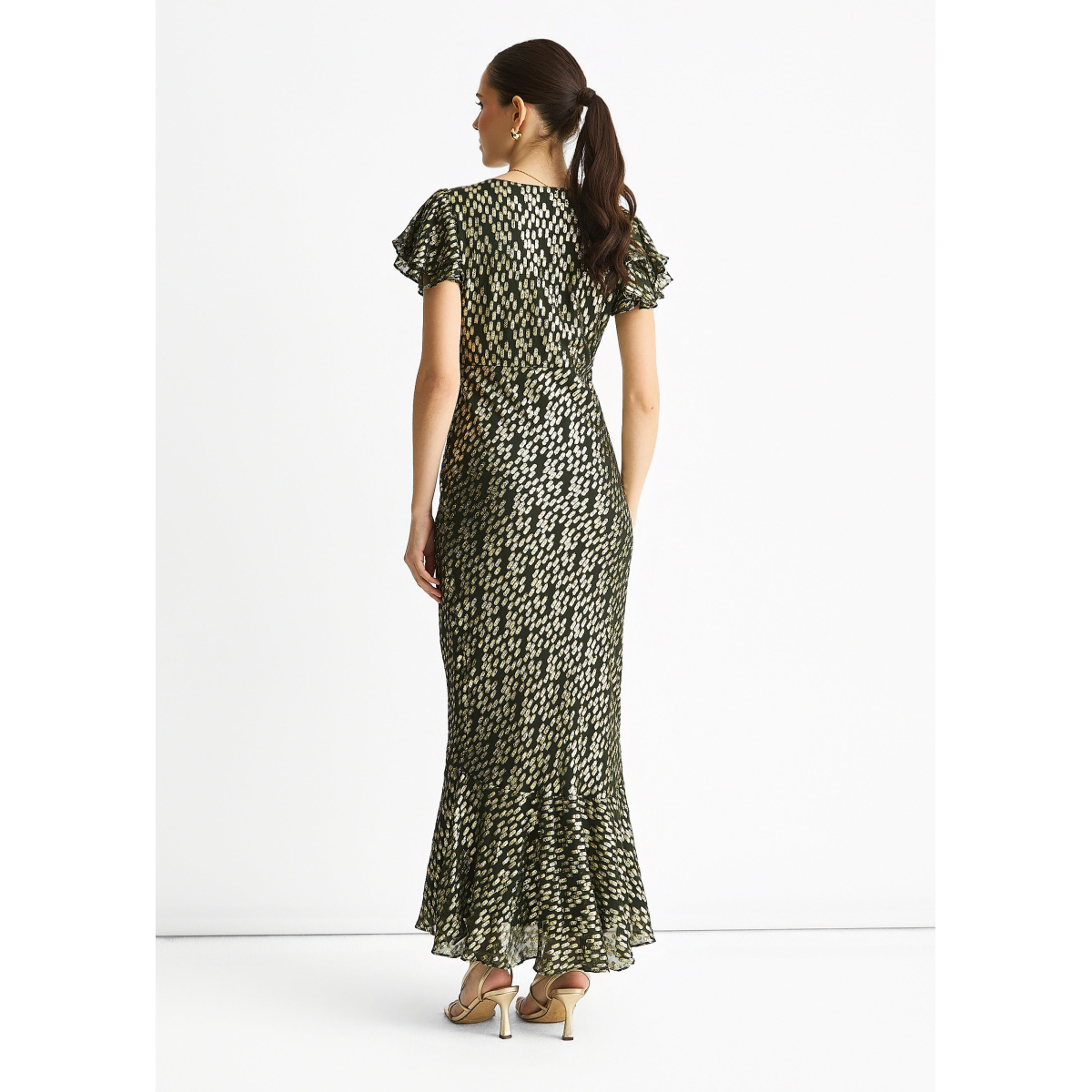 Dark Green Viscose Clipped Gold Jacquard Bias Cut Maxi Dress