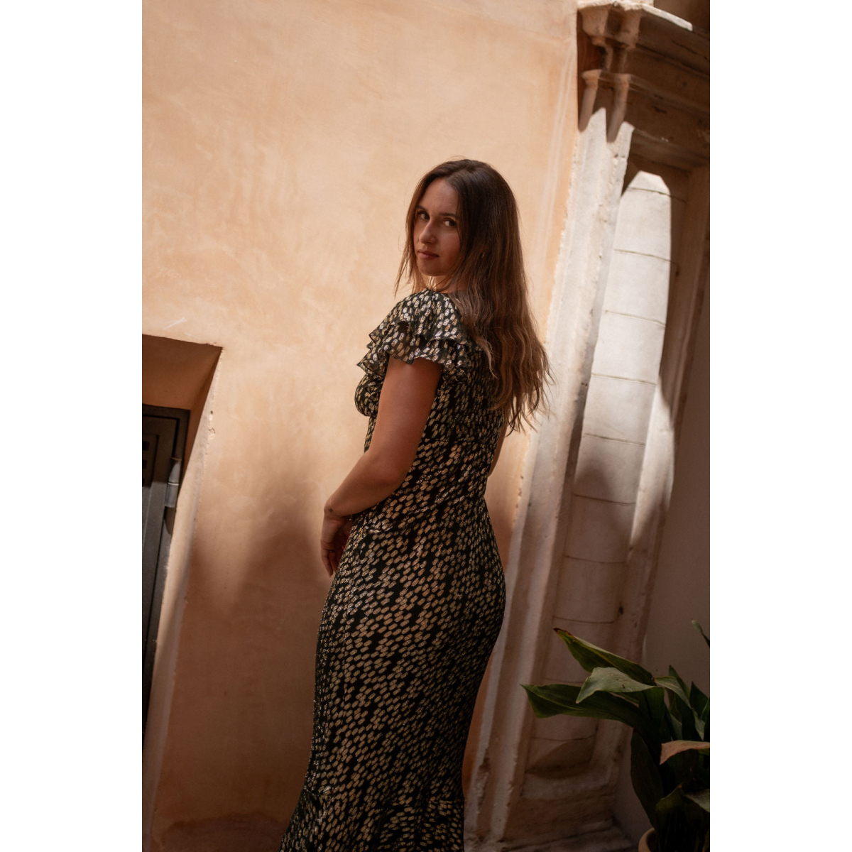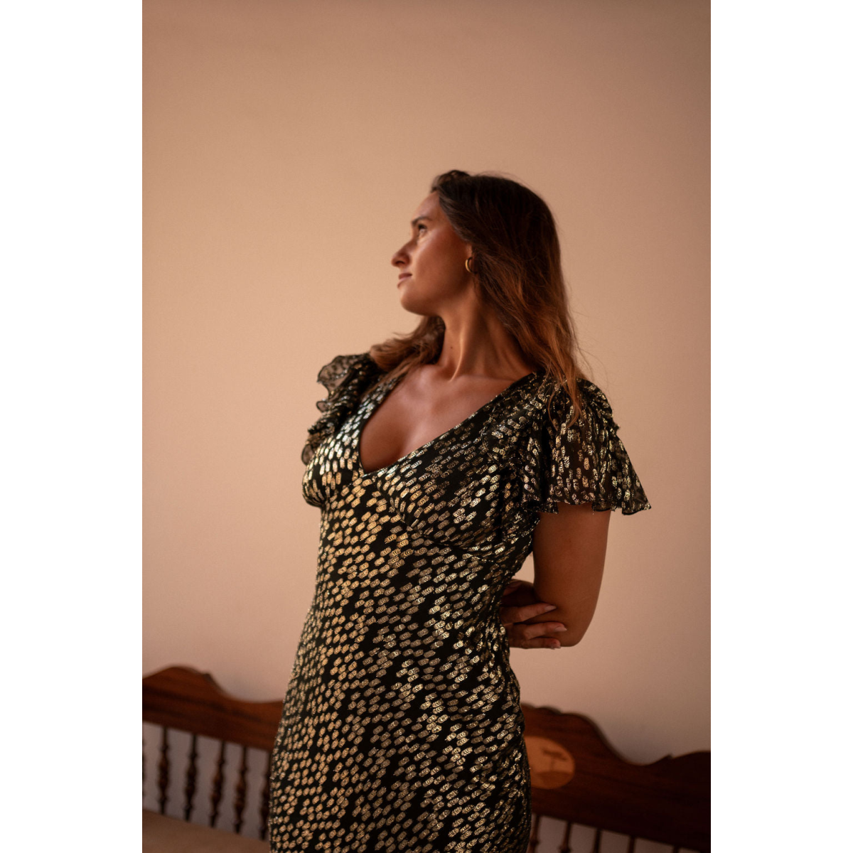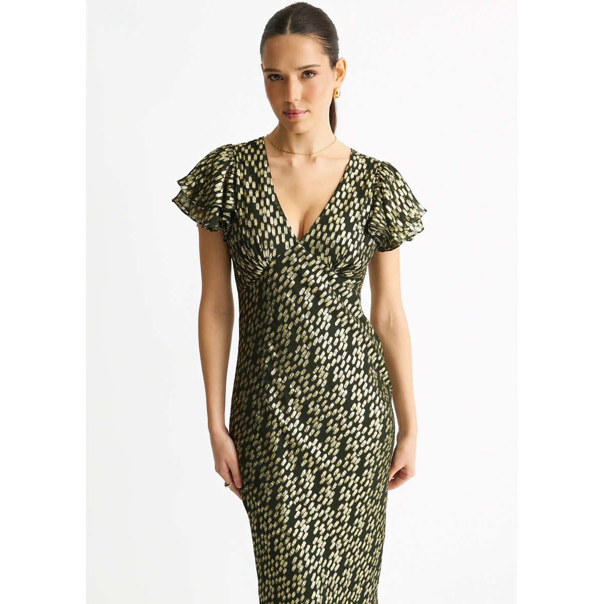 This dark green maxi dress features a comfortable viscose fabric with a bold gold jacquard pattern. Its bias cut design ensures a flattering fit, while the clipped details add a stylish edge. Ideal for occasion wear with a confident, standout look.