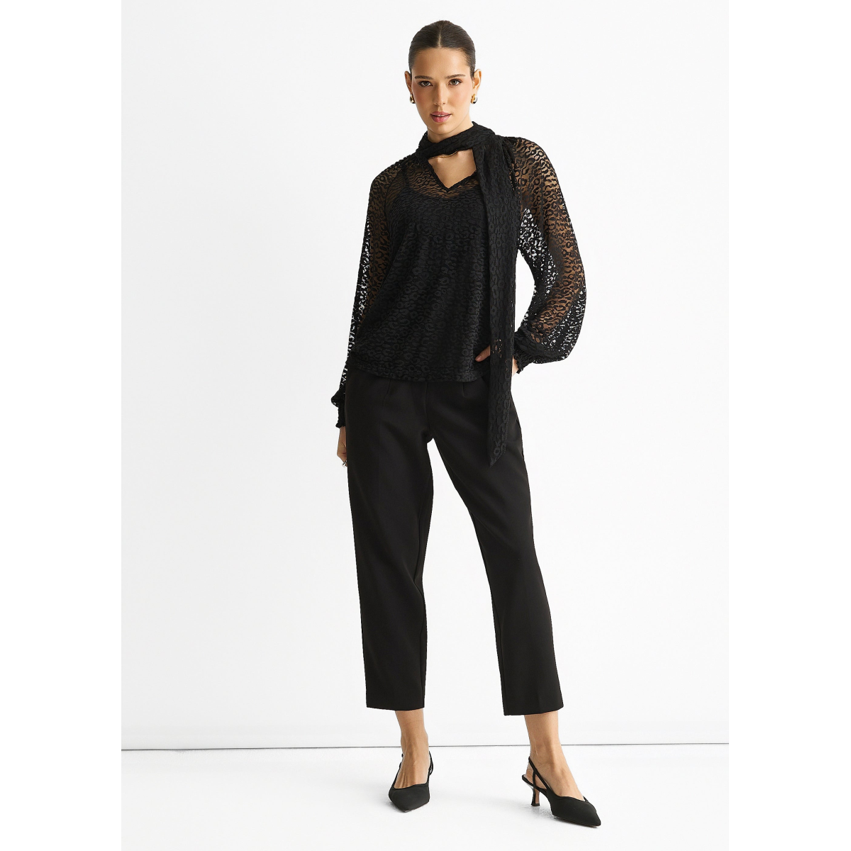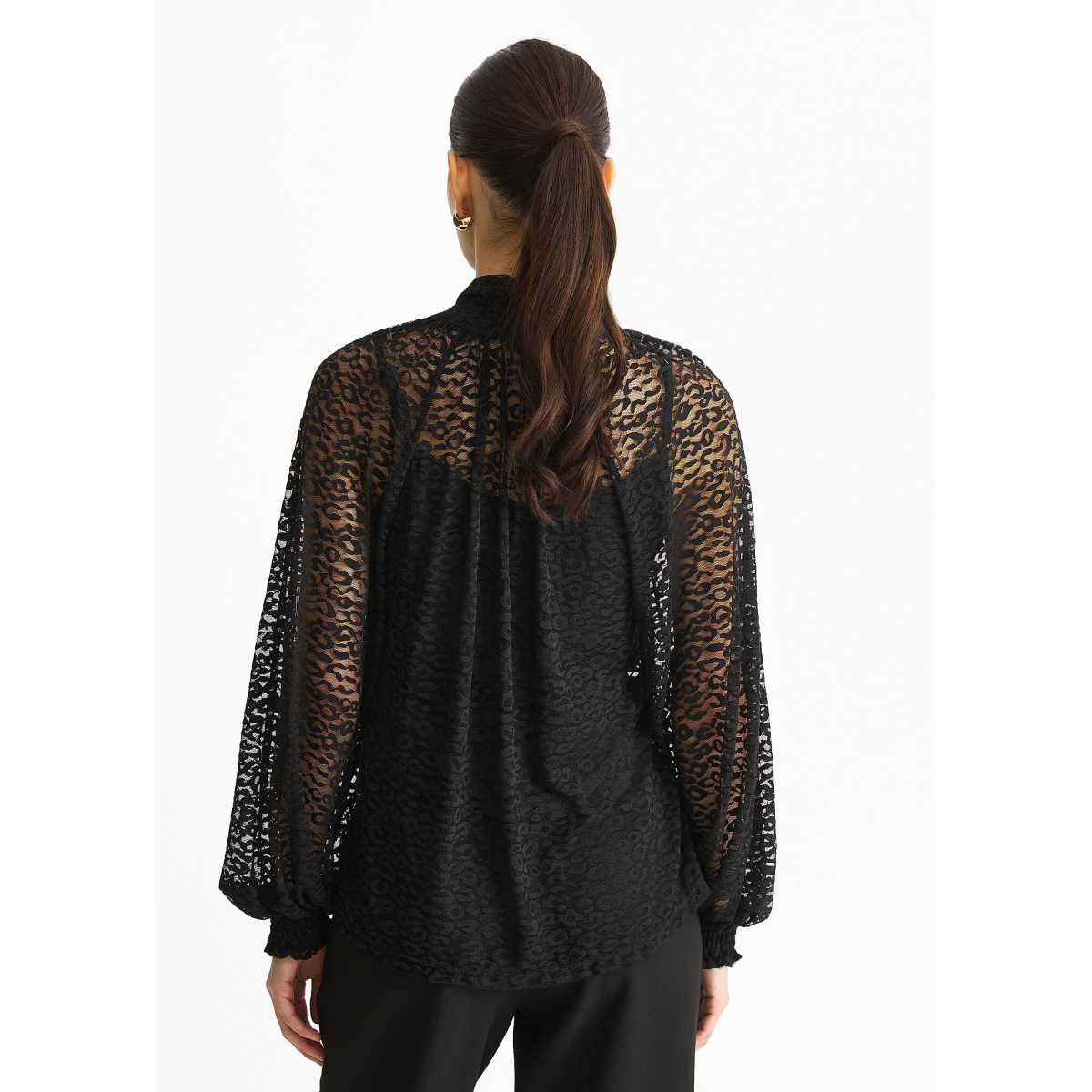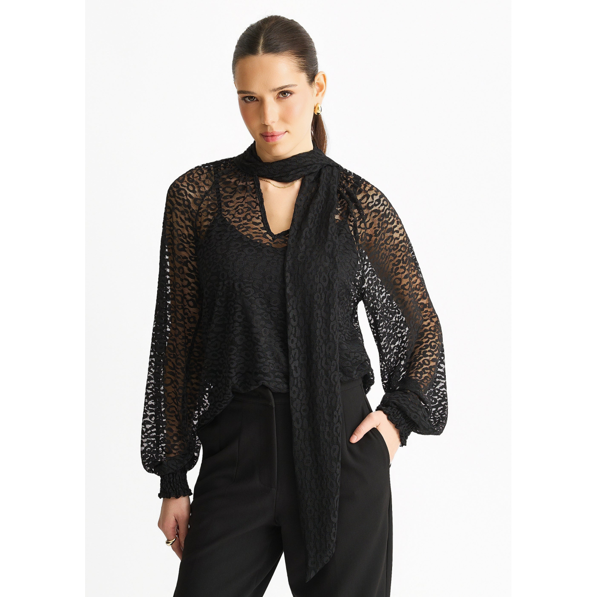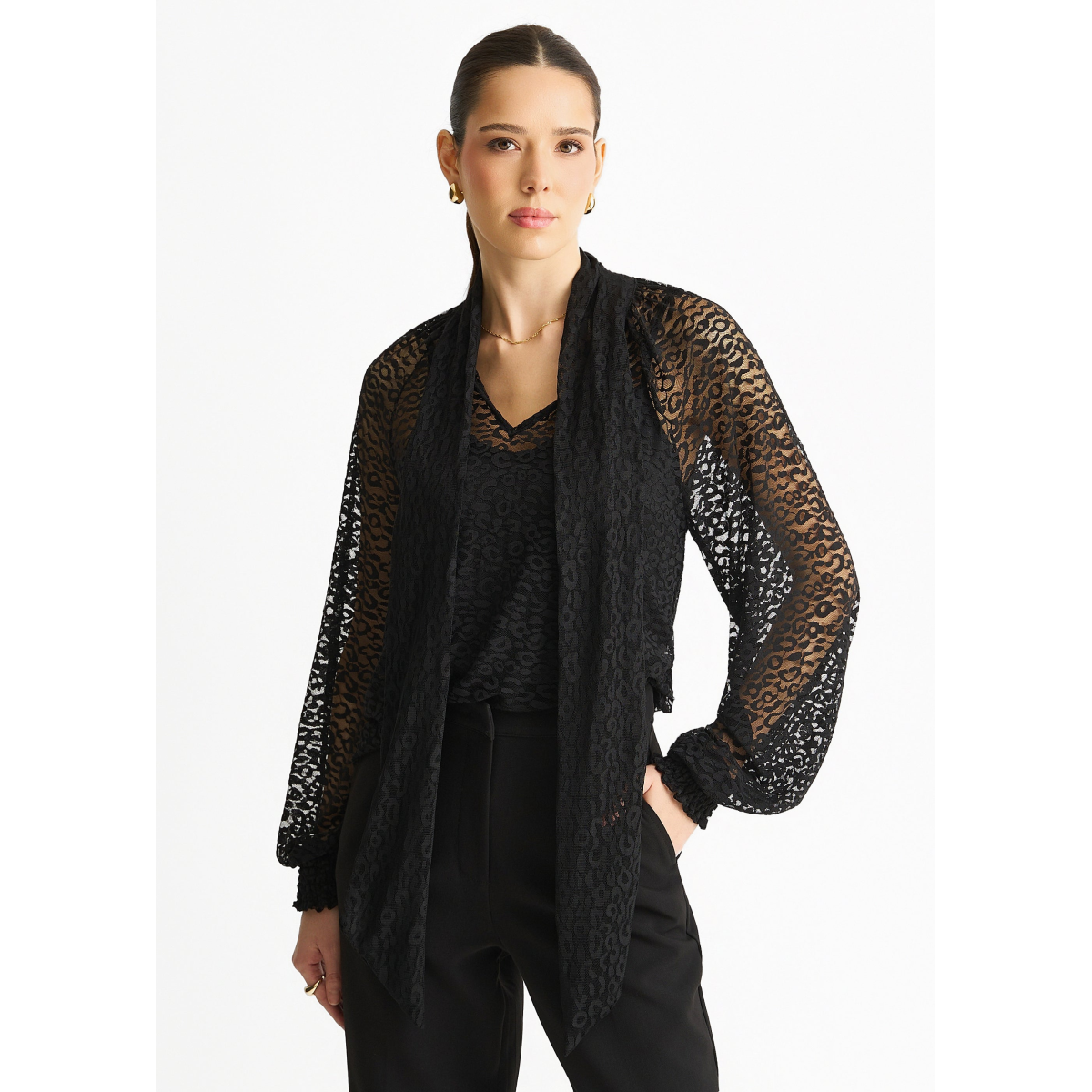 Elevate your everyday style with this Black Animal Lace Neck Tie Detail Blouse. Featuring a bold animal print lace neck tie, it adds a striking touch to a comfortable, casual fit. Perfect for making a confident statement while staying relaxed throughout your day.