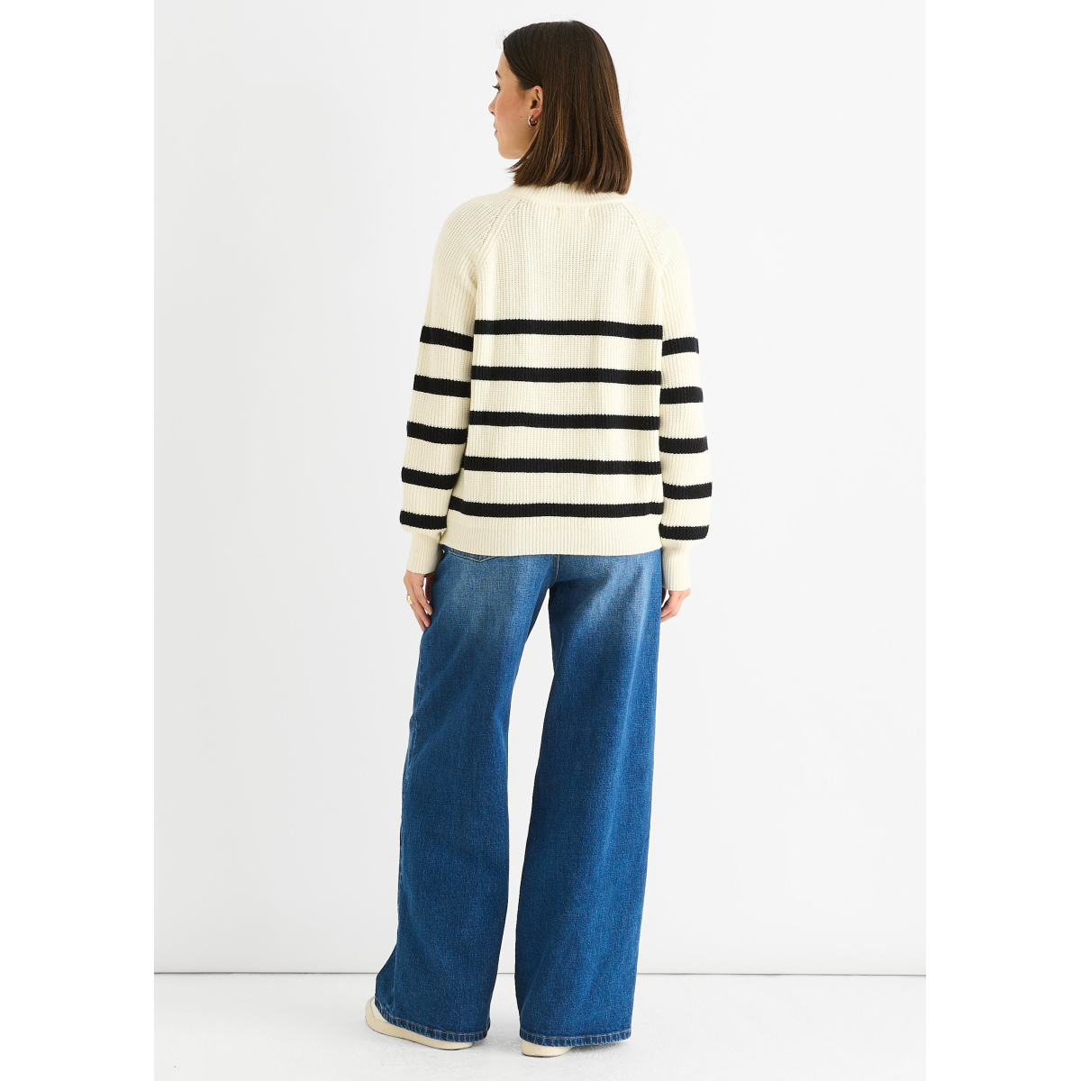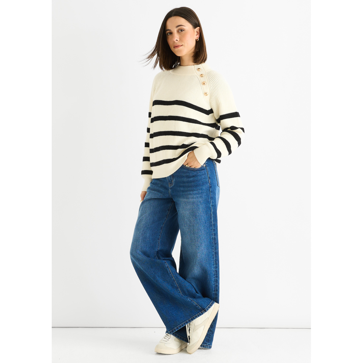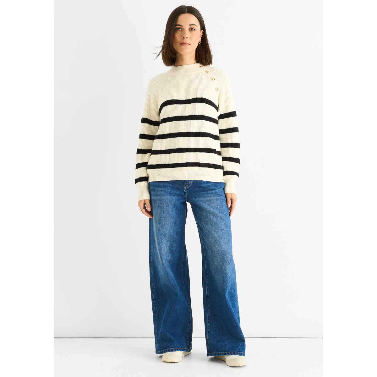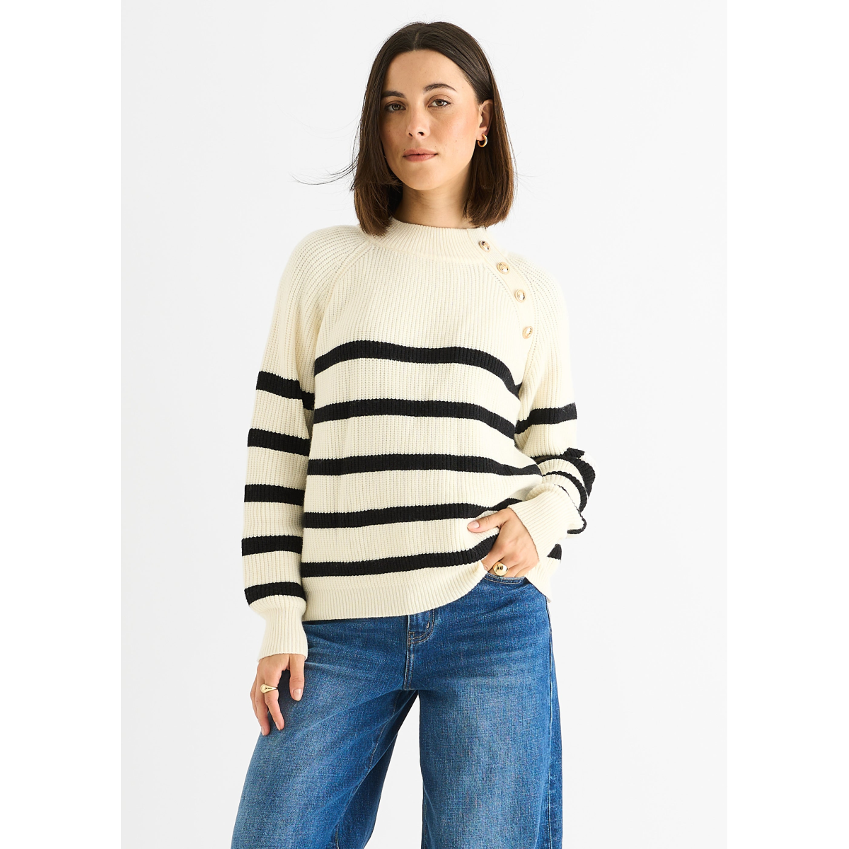 Indulge yourself in comfort with our Cream Stripe Cable Knit Button Oversized Jumper. This casual yet bold jumper features a trendy cream stripe design, cable knit texture, and oversized fit with button detail. Stay warm and stylish all winter long.