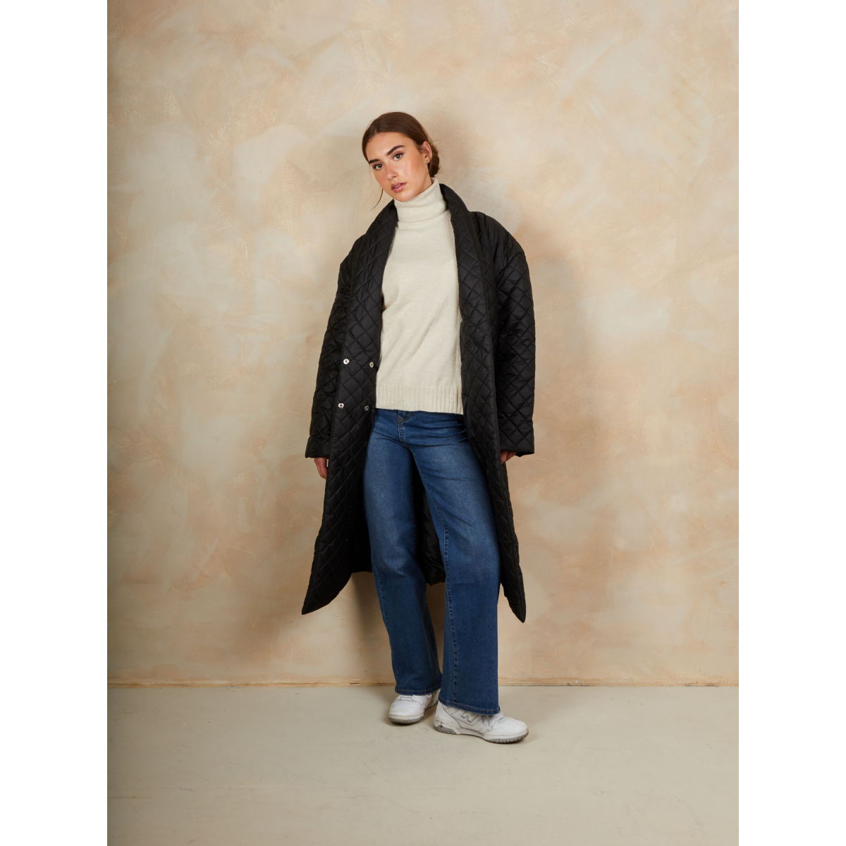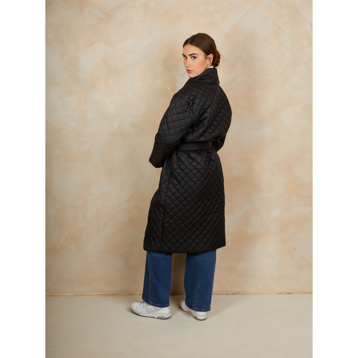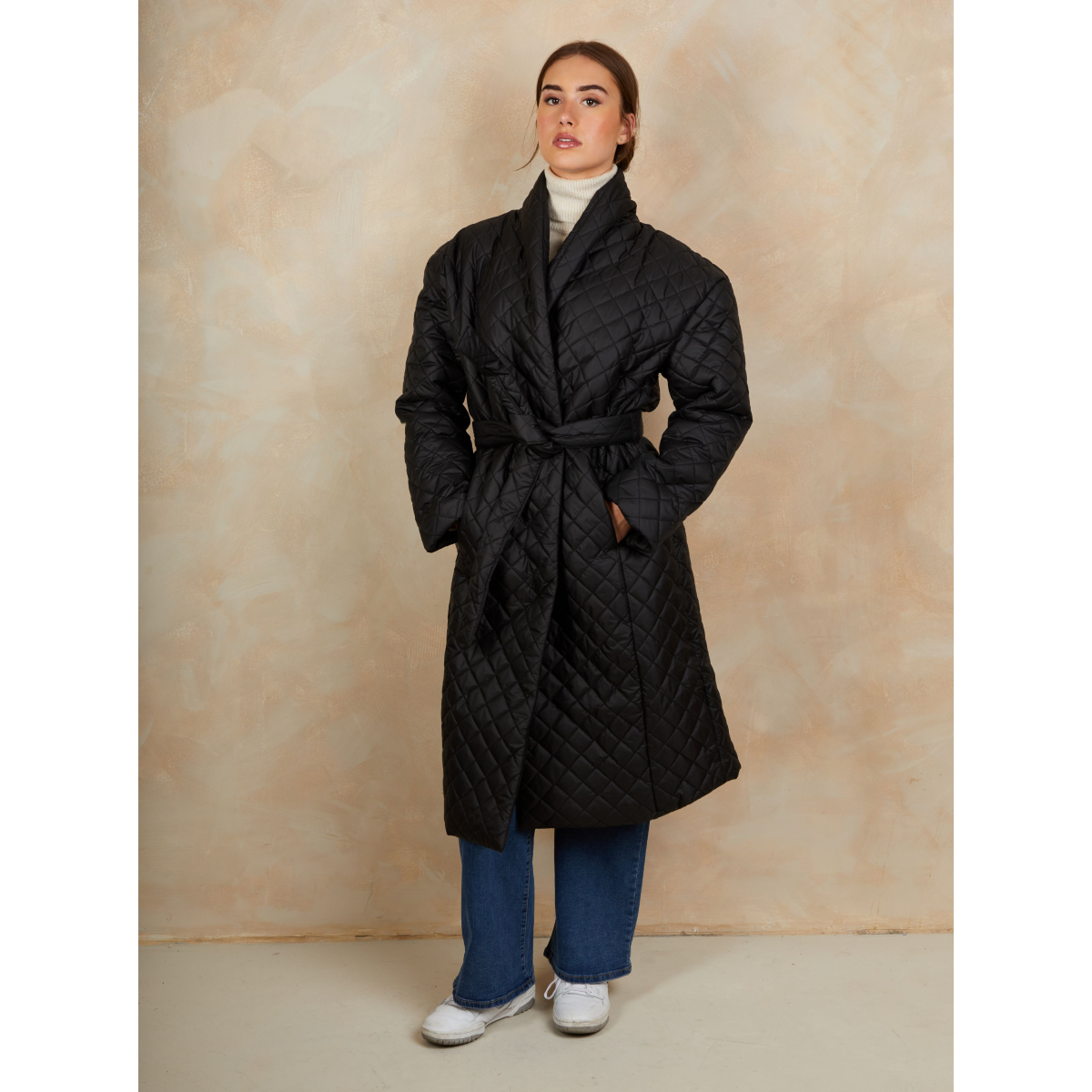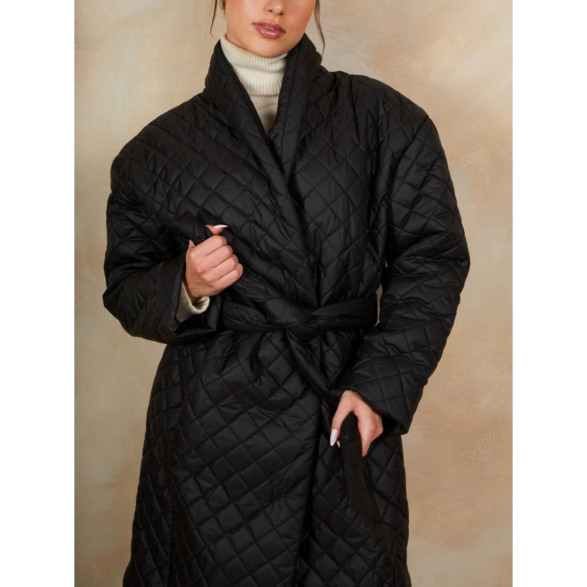 Diamond Quilted Longline Belted Coat in Black