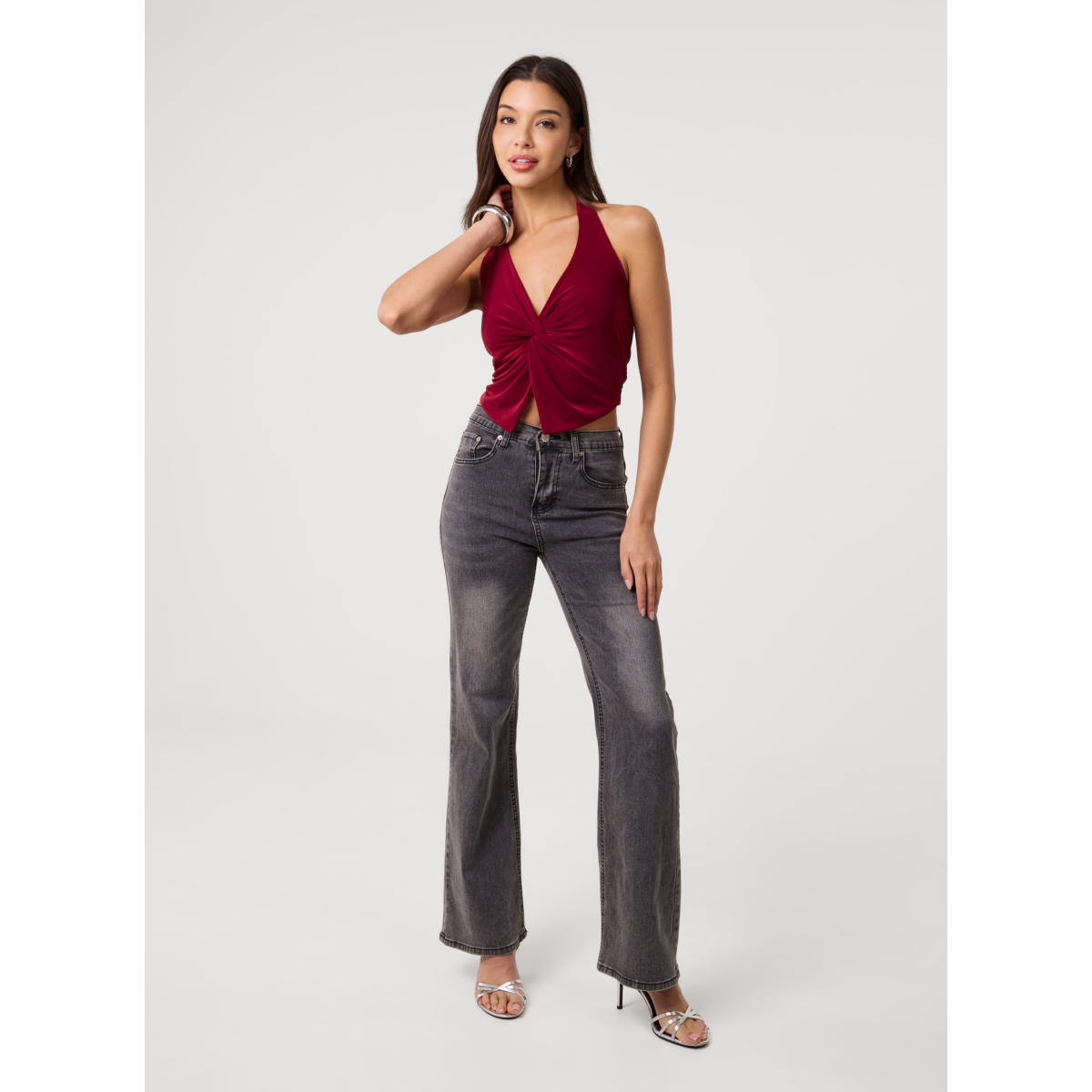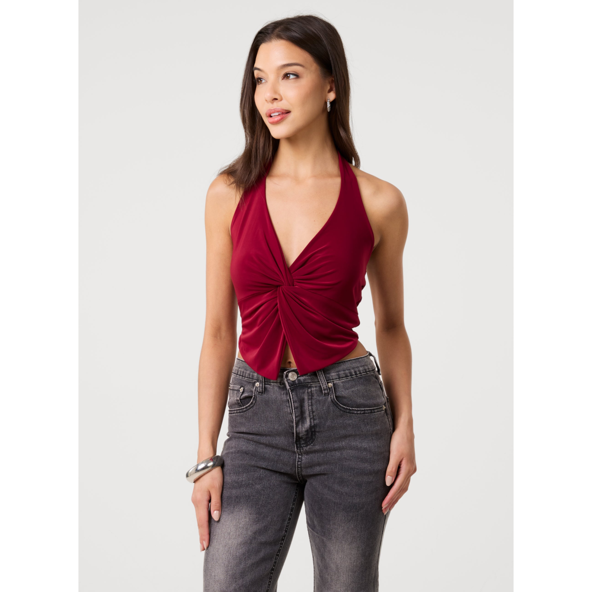 Update your summer wardrobe with this Knot Front Halter Top. Pair with wide leg jeans and gold jewellery for a chic daytime look.