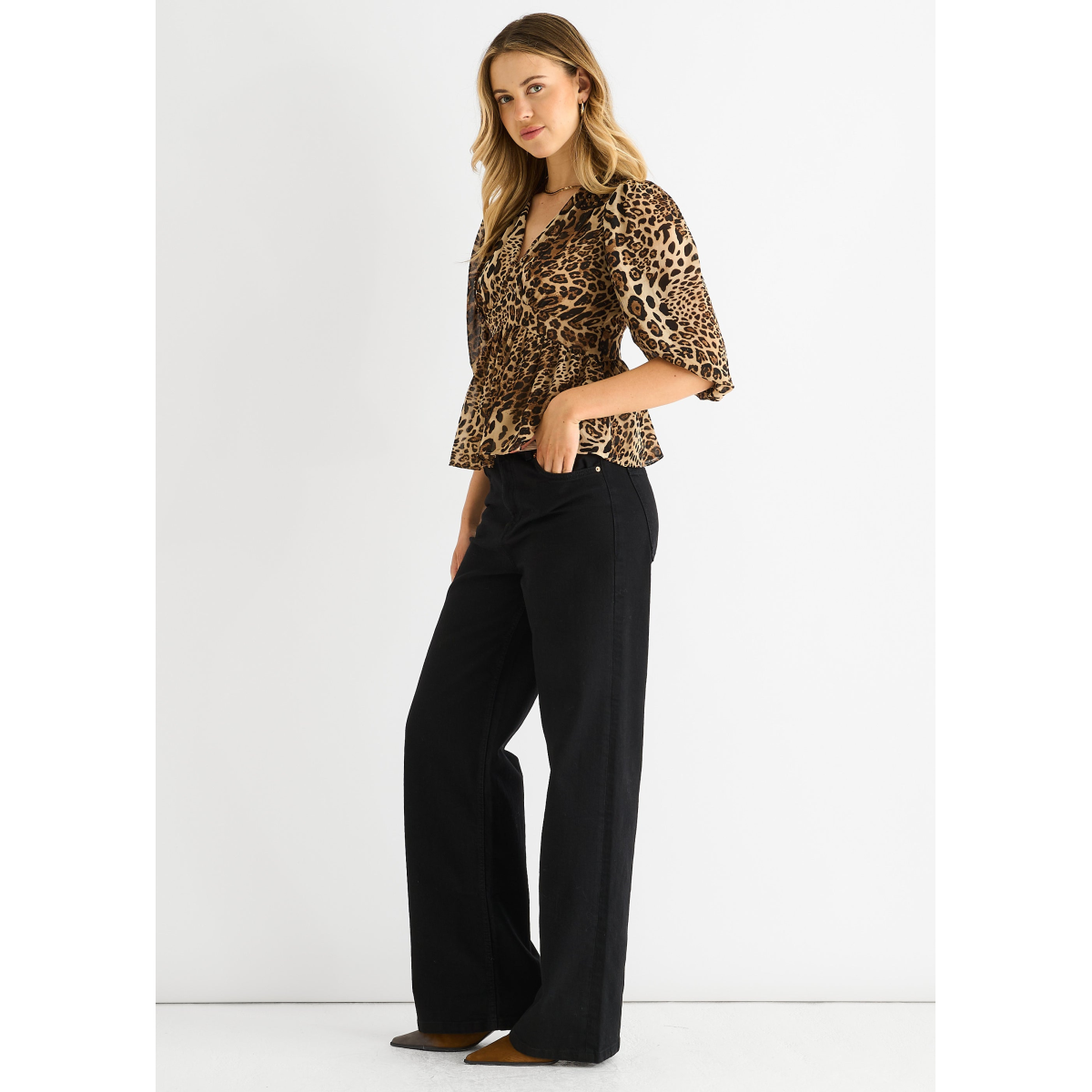 Brown Animal Print V Neck Peplum Blouse