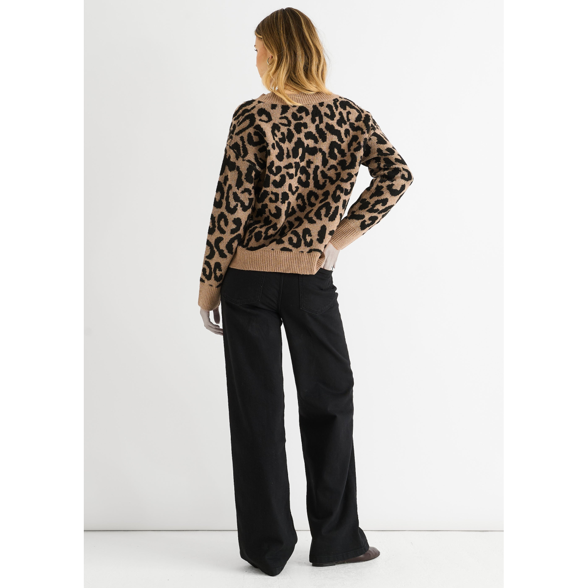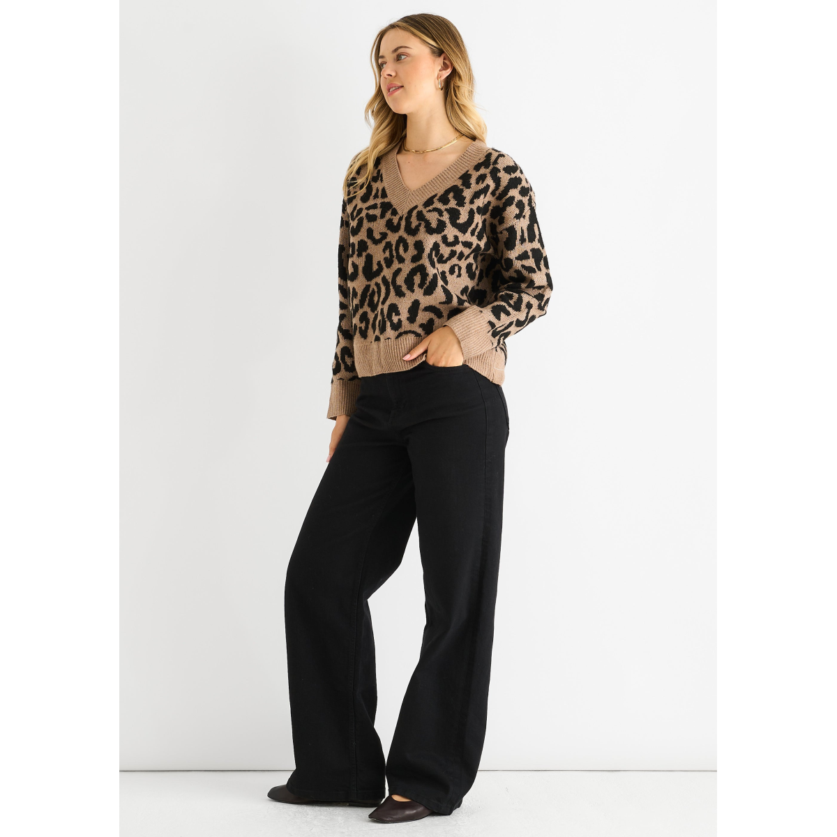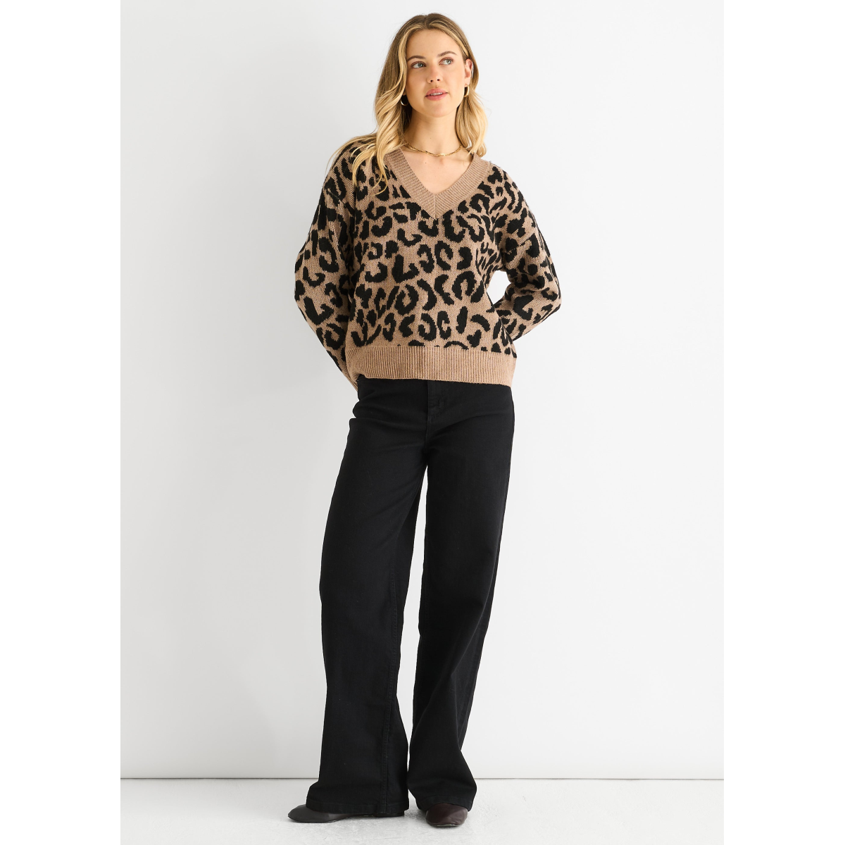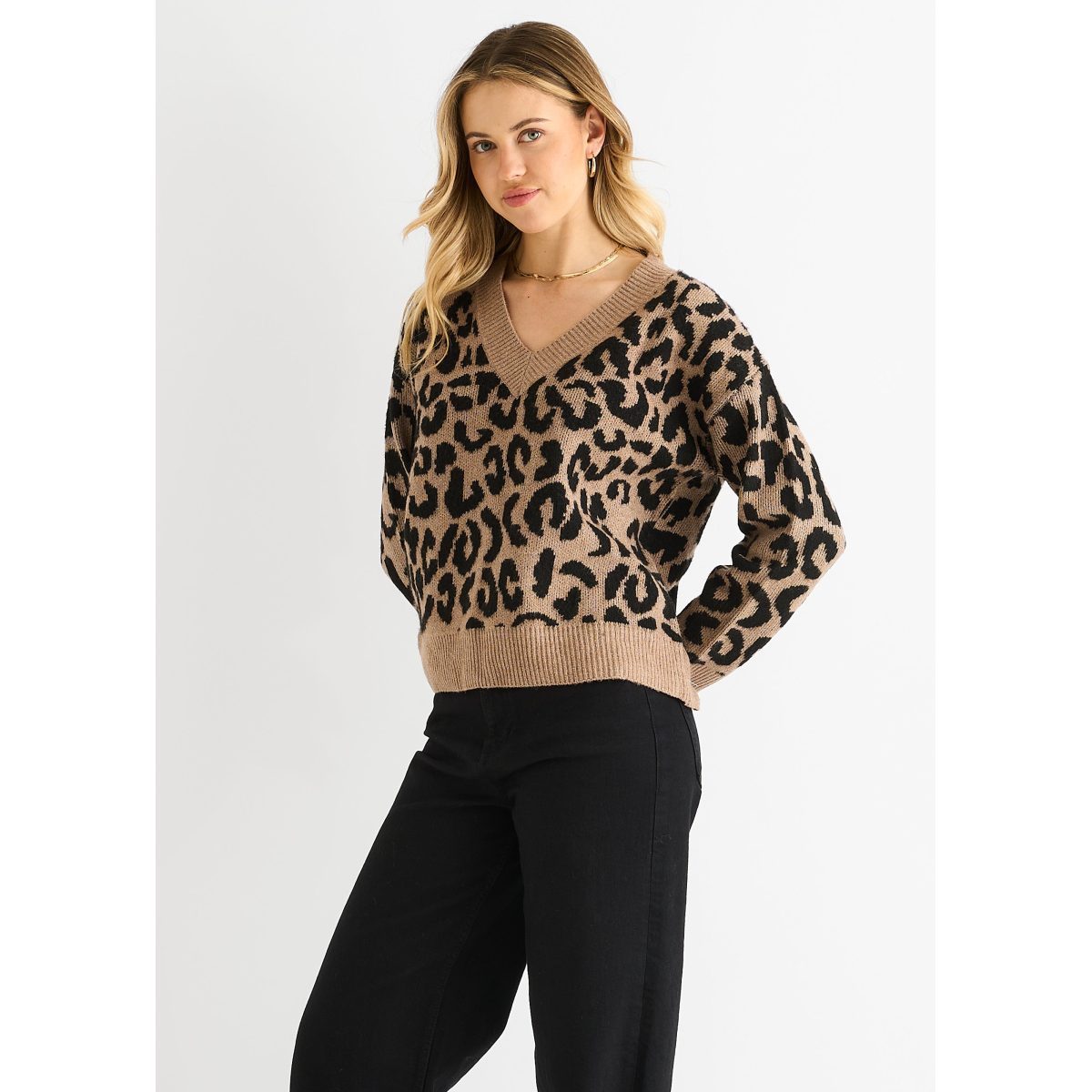 Stay cozy and stylish in our Camel Animal V Neck Short Knit Jumper. Made with comfortable and bold fabric, this jumper is perfect for casual wear. With its unique v-neck design and short length, it's a versatile addition to your wardrobe.