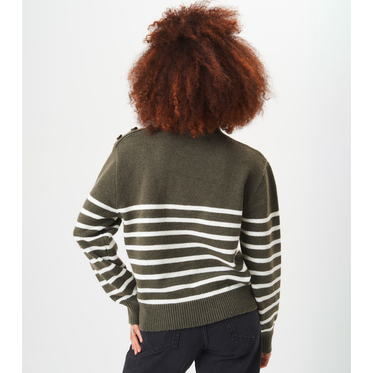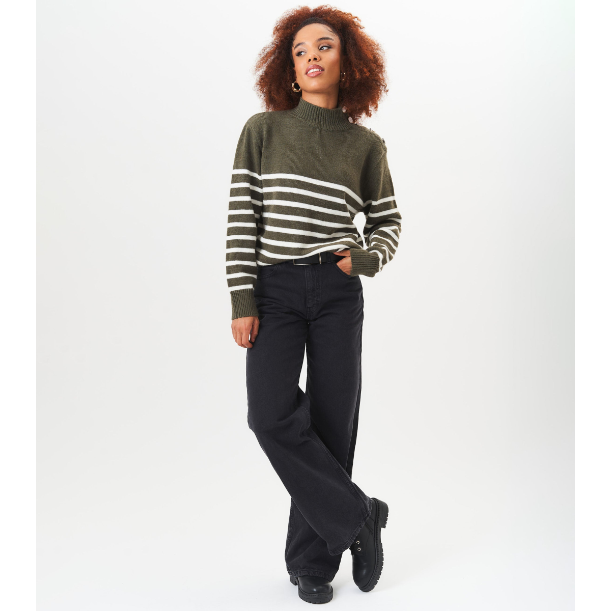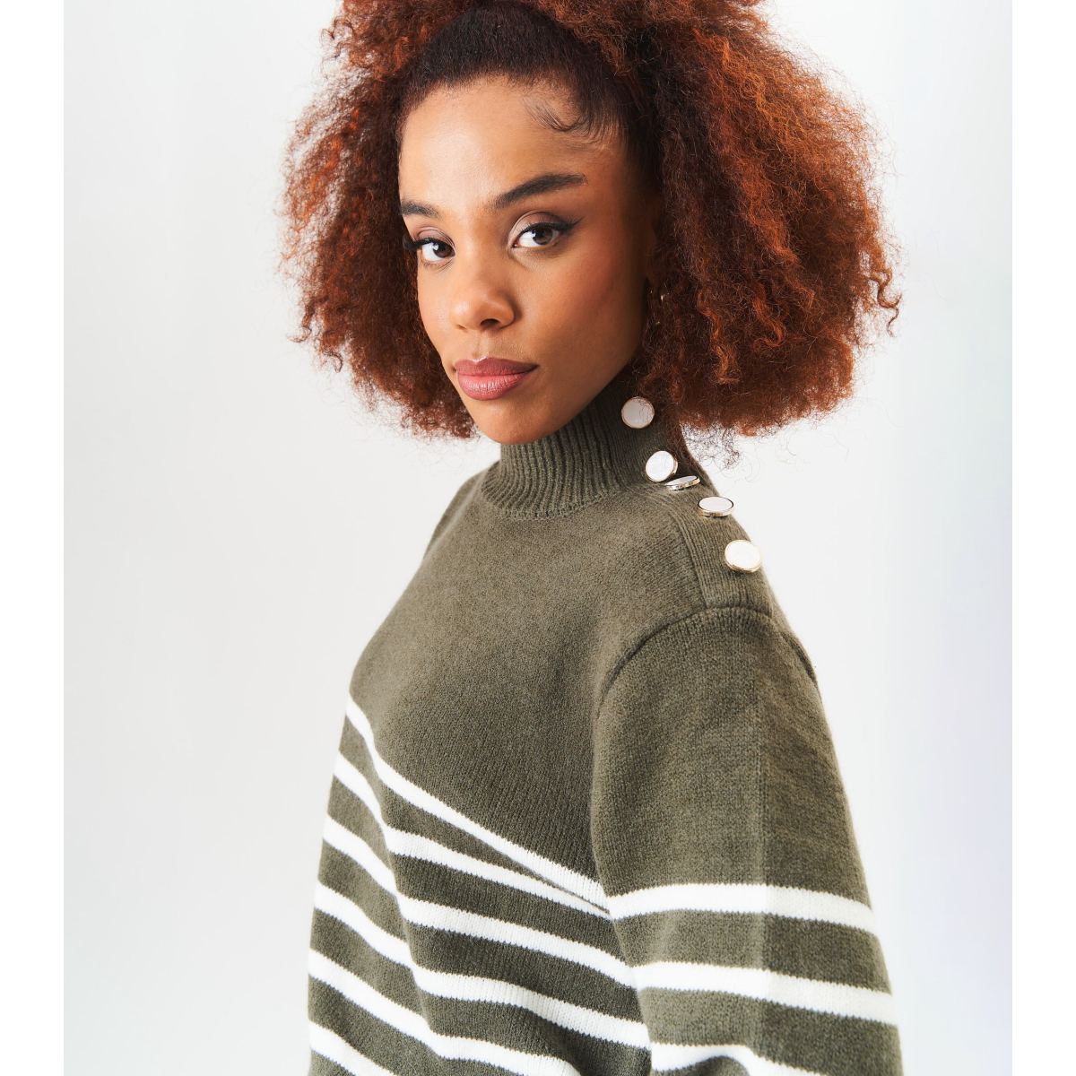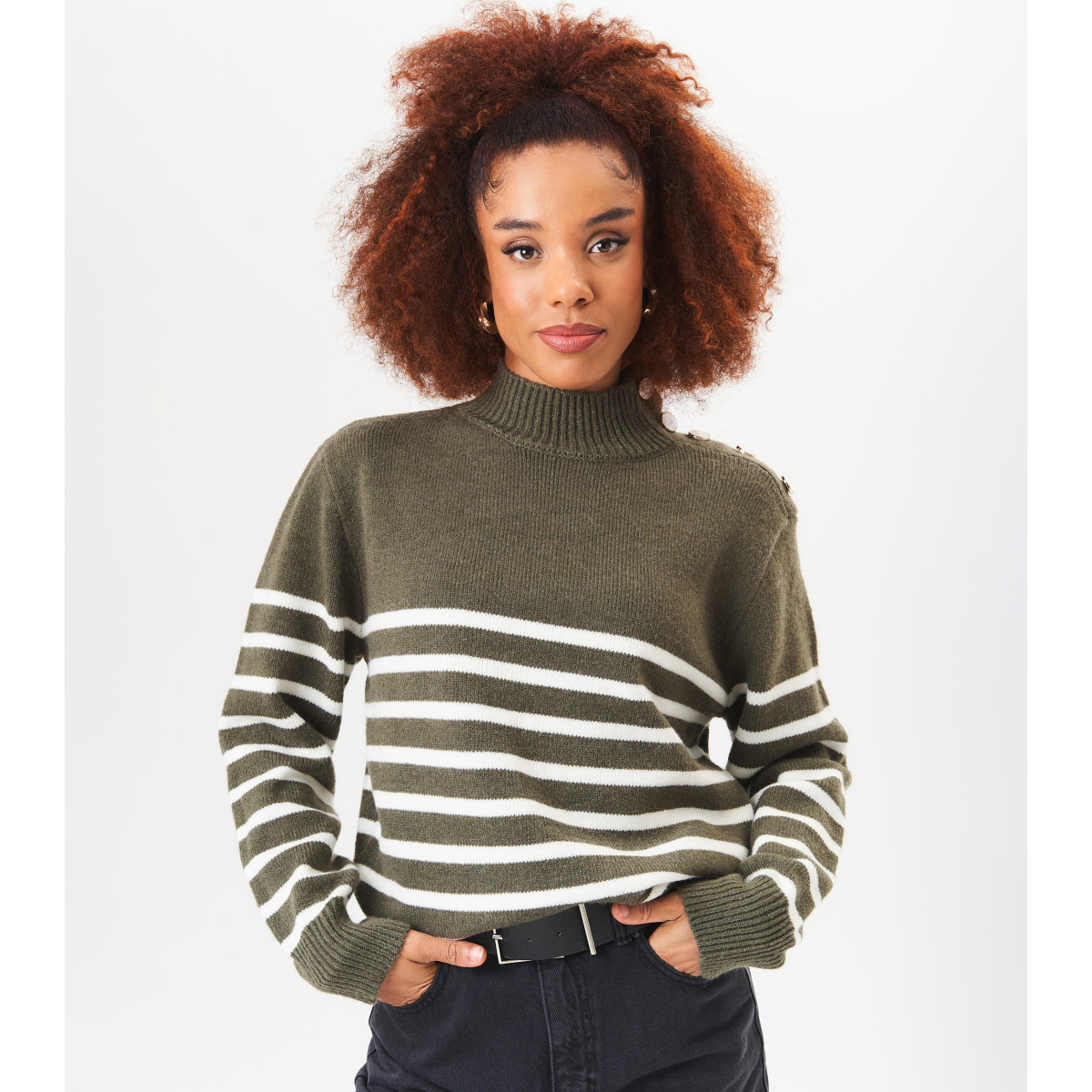 Elevate your wardrobe with our Khaki High Neck Stripe Oversized Jumper. Made with quality materials, this jumper boasts a chic high neck design and stylish stripes, perfect for any fashion-forward look. Stay on-trend and cozy this season with this must-have piece.