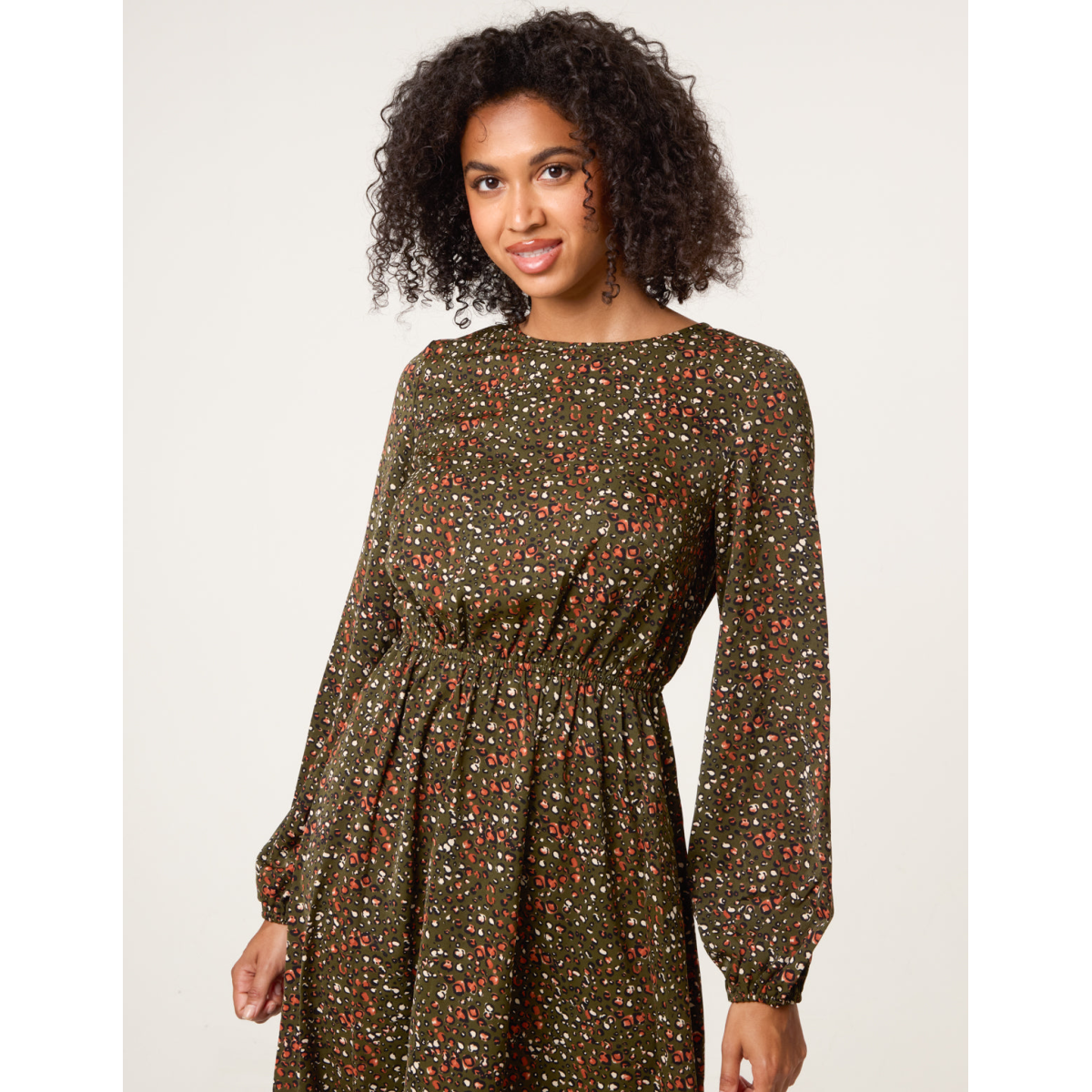 In stunning shades and animal print, this dress is sure to stand out from the rest. Team with tan suede boots.