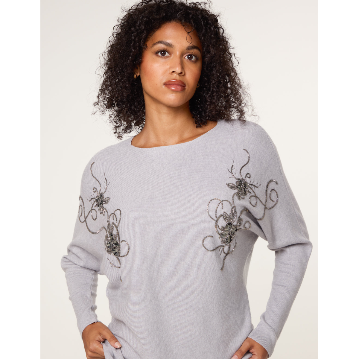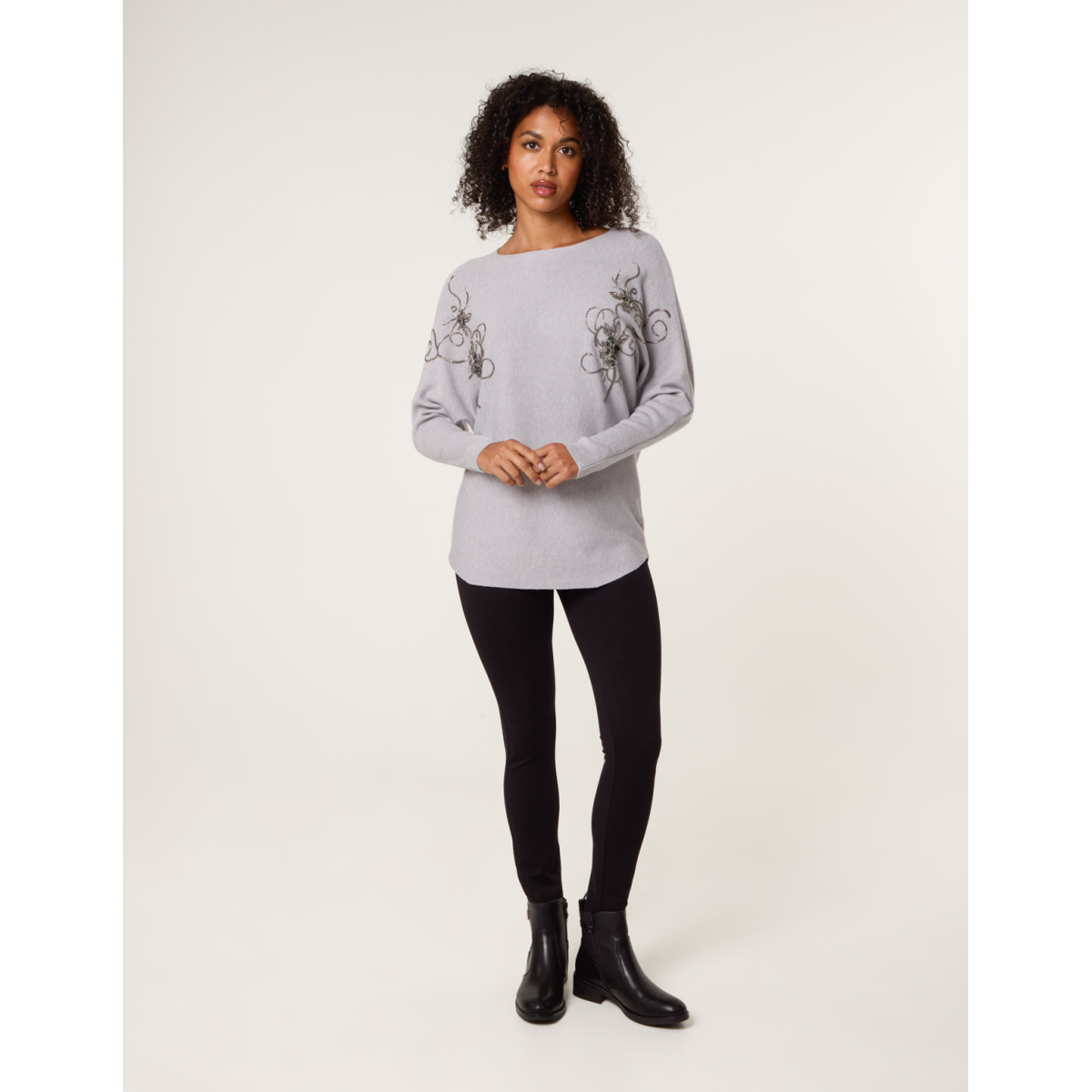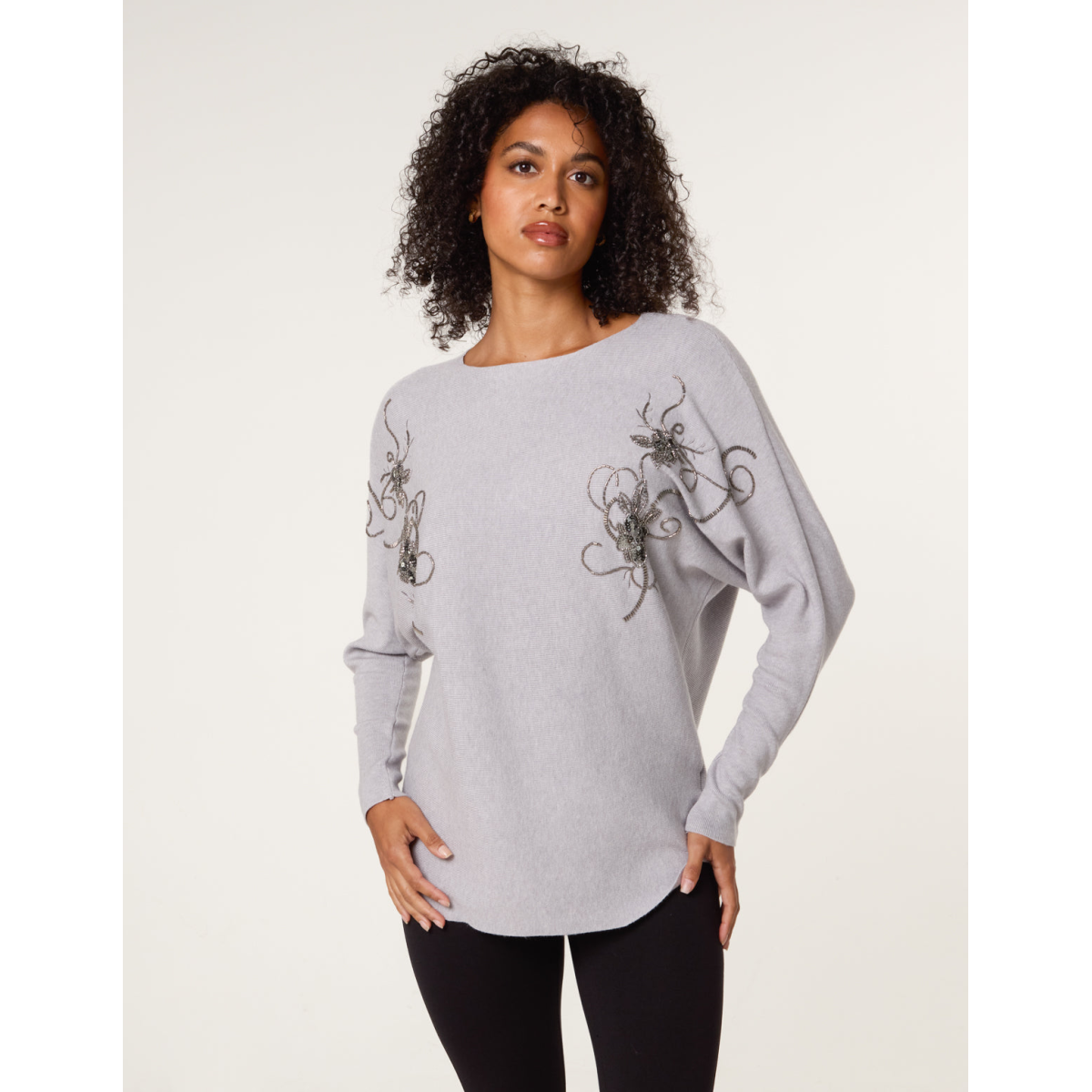 The sequins on this flower printed jumper make it a great choice to boost your mood. Keep accessories pared back to let the piece shine.