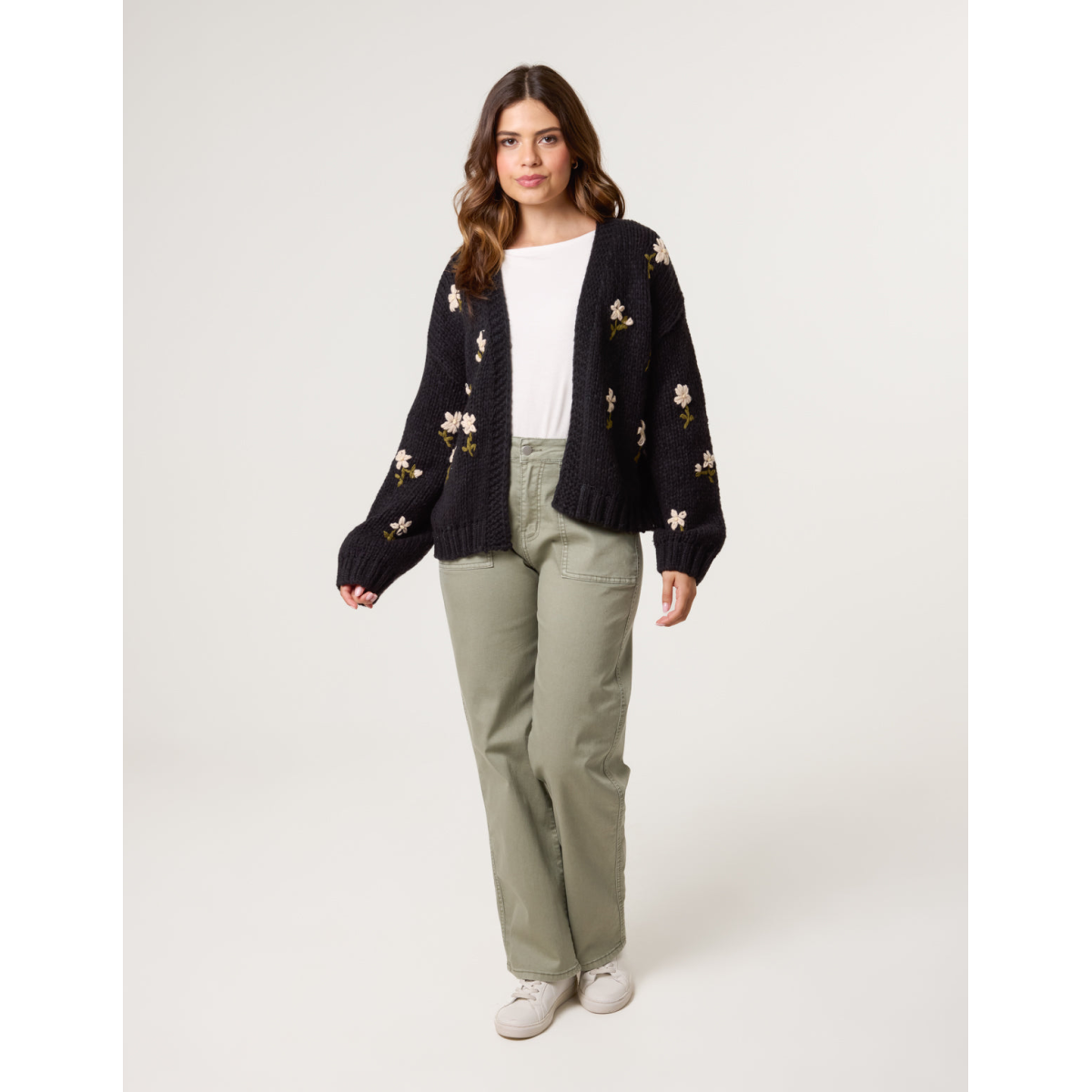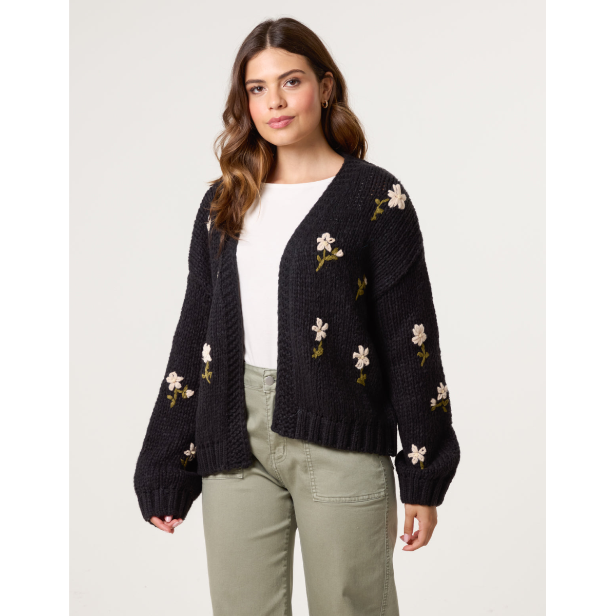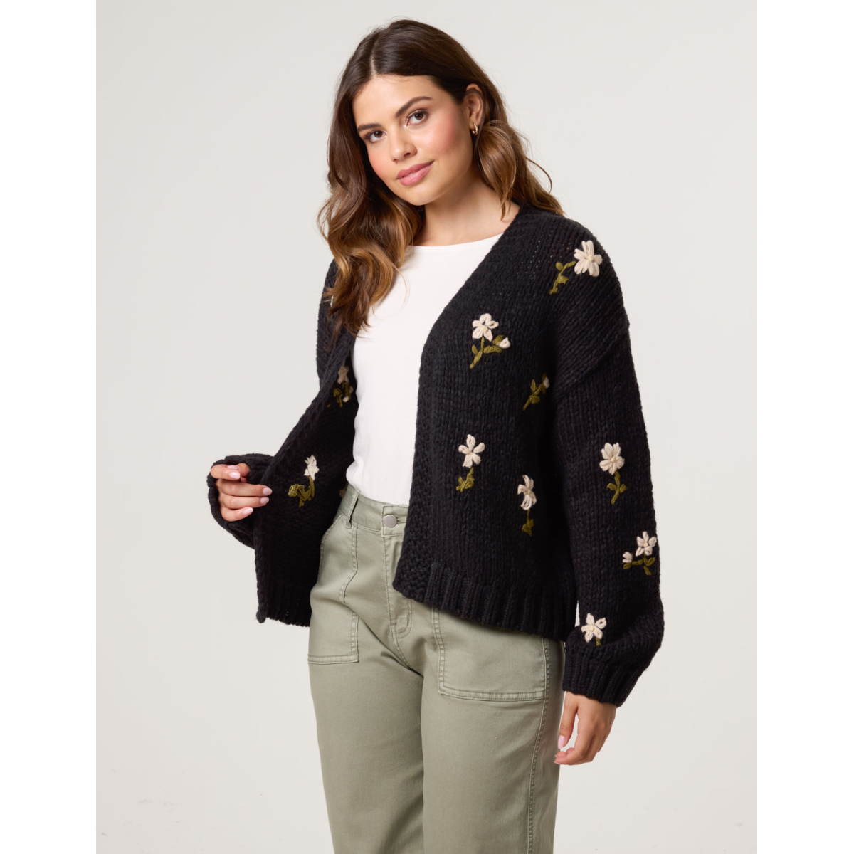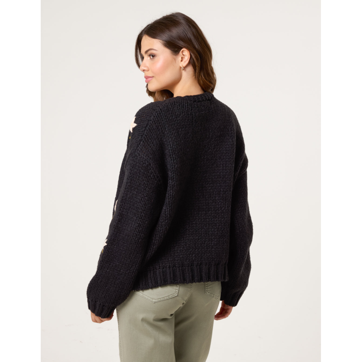 This black chunky knitted cardigan with flower detailing will leave any outfit it's teamed with looking the cutest.