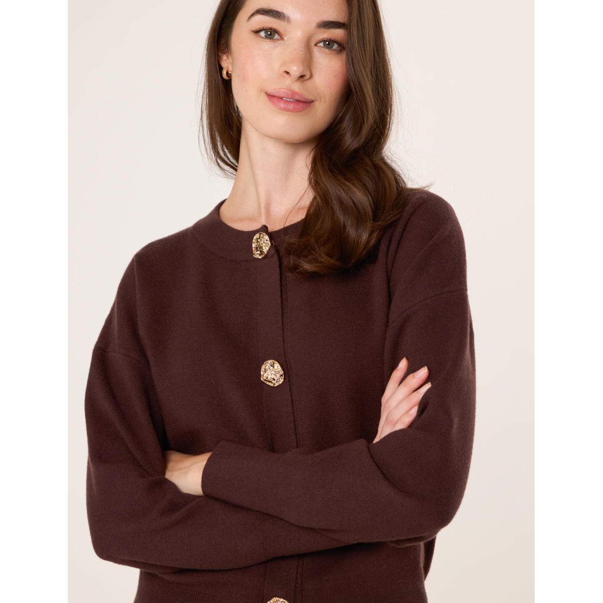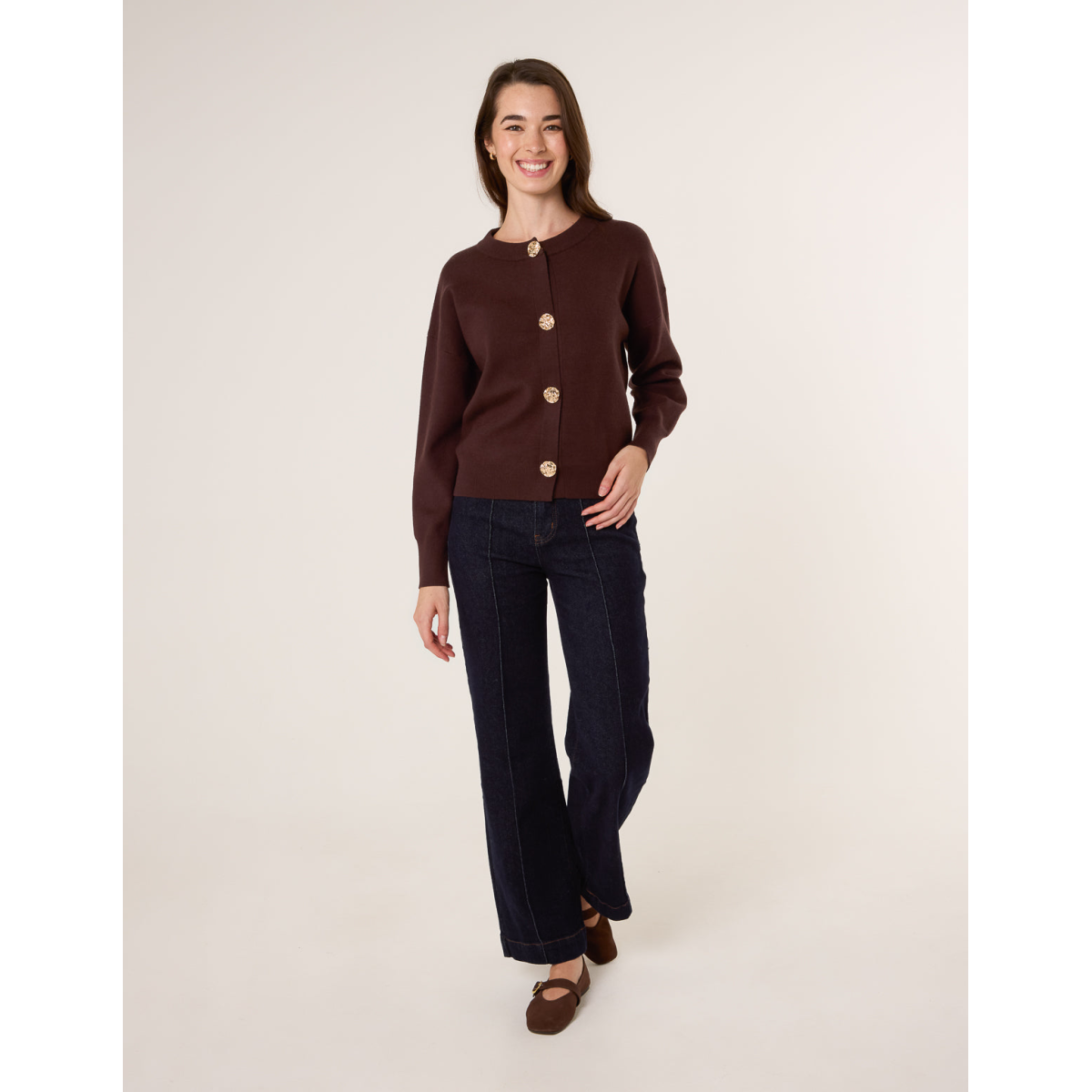 A sophisticated layering piece for the new season. This classic cardigan with large gold buttons adds a twist on your classis, basic cardigan. Team this with just about anything.