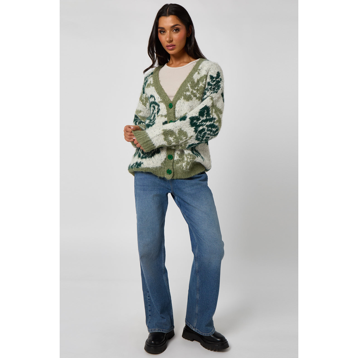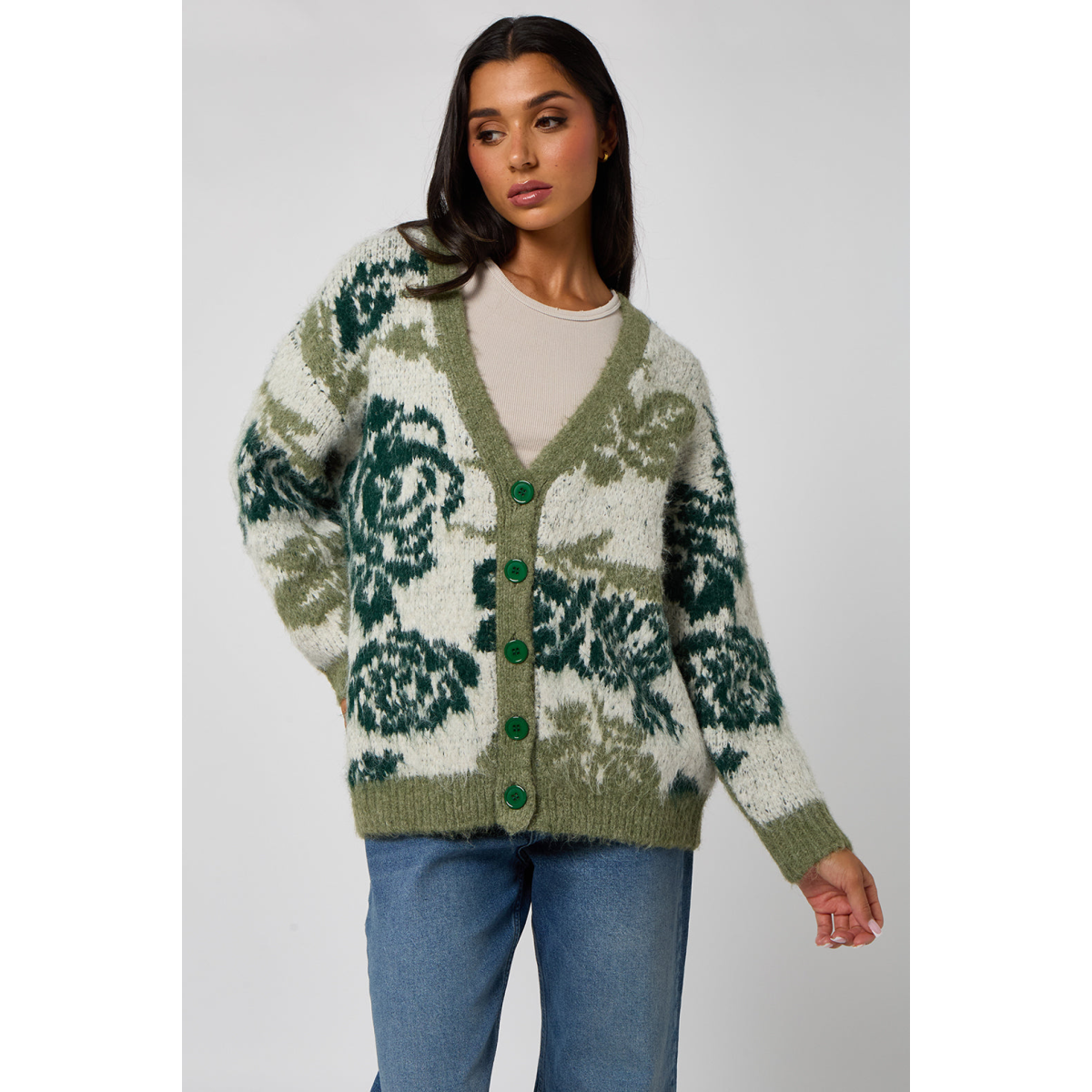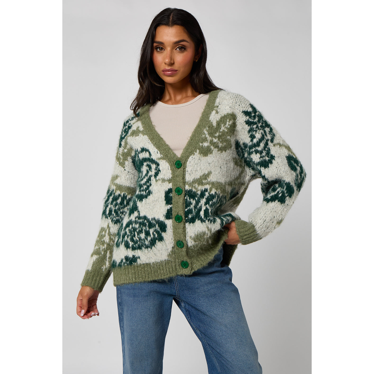 A bold, cosy cardigan with an oversized chunky knit and all-over floral design. Perfect for layering and adding a statement touch to casual looks.