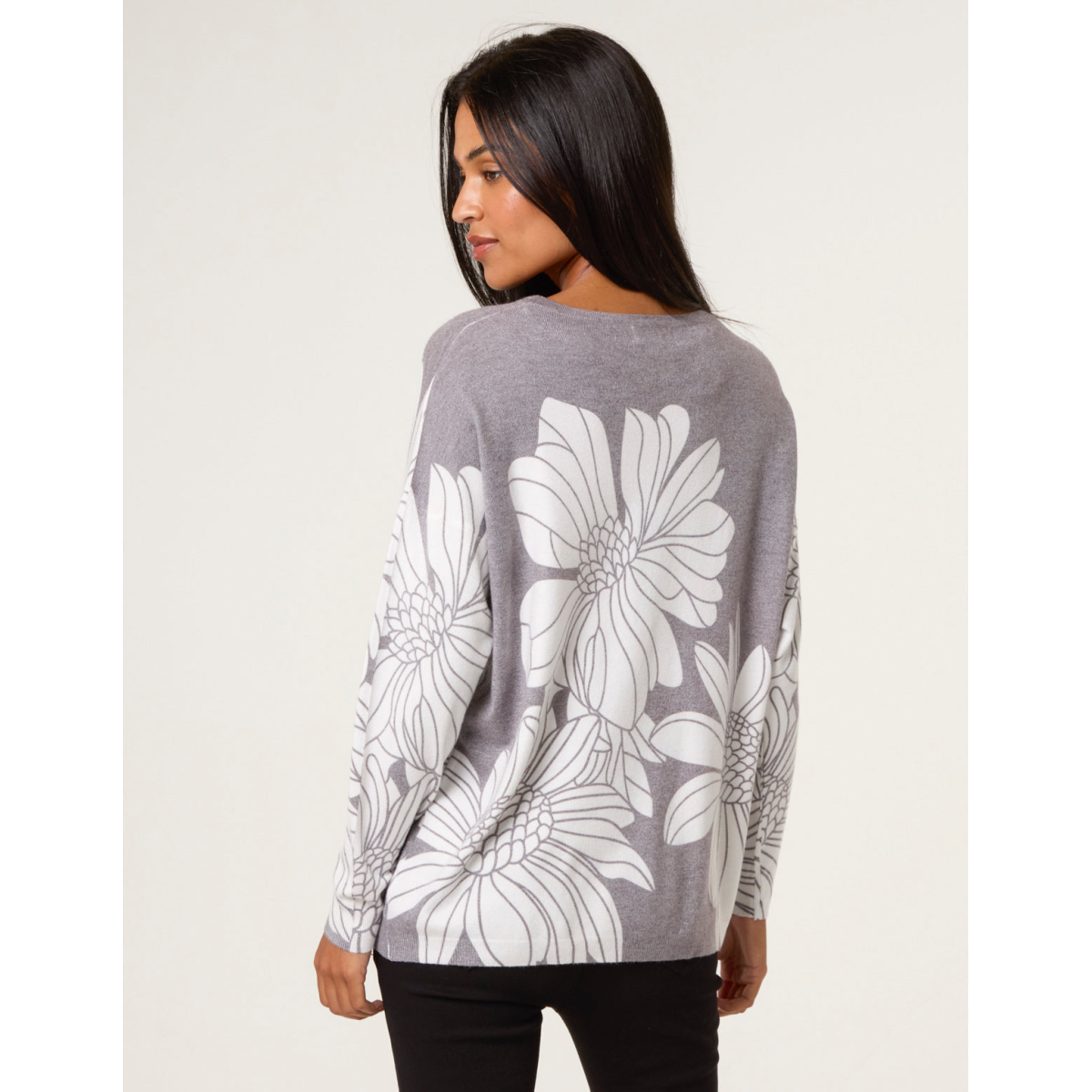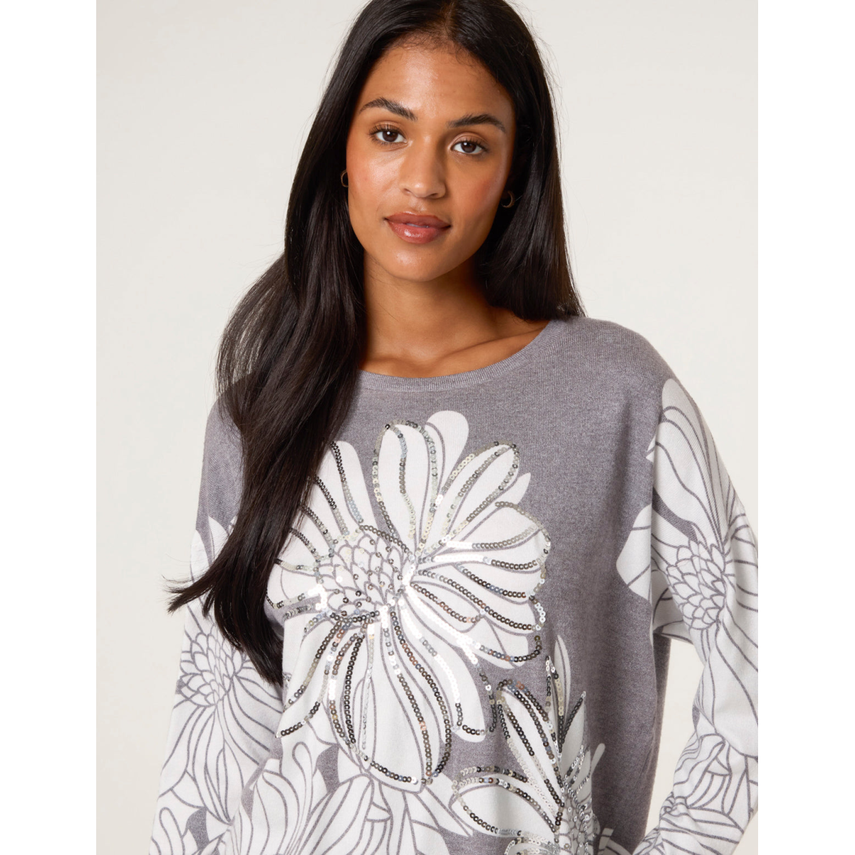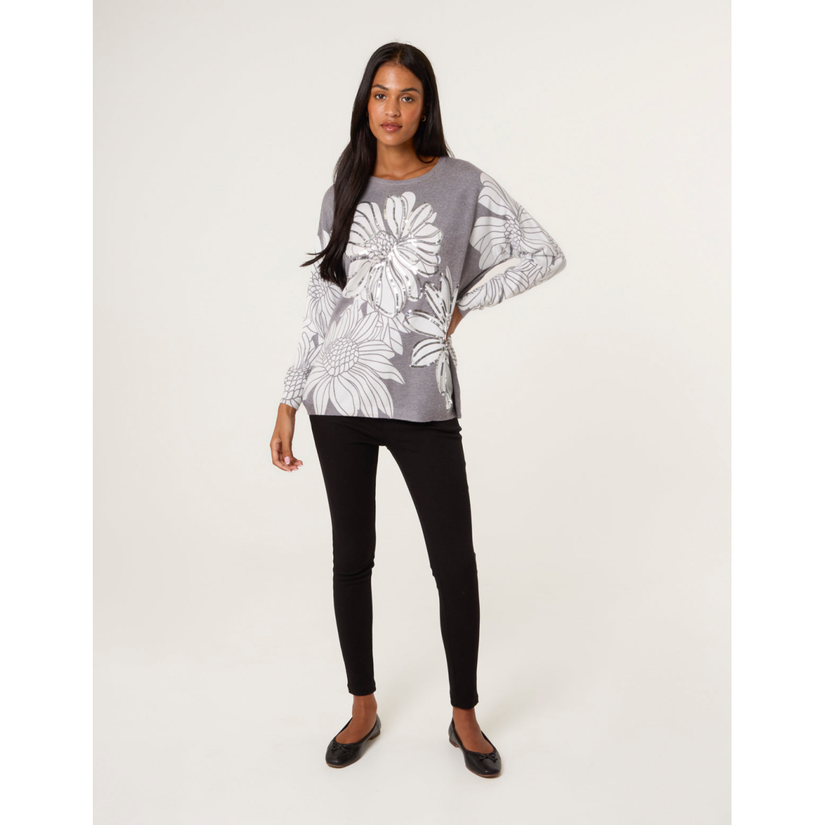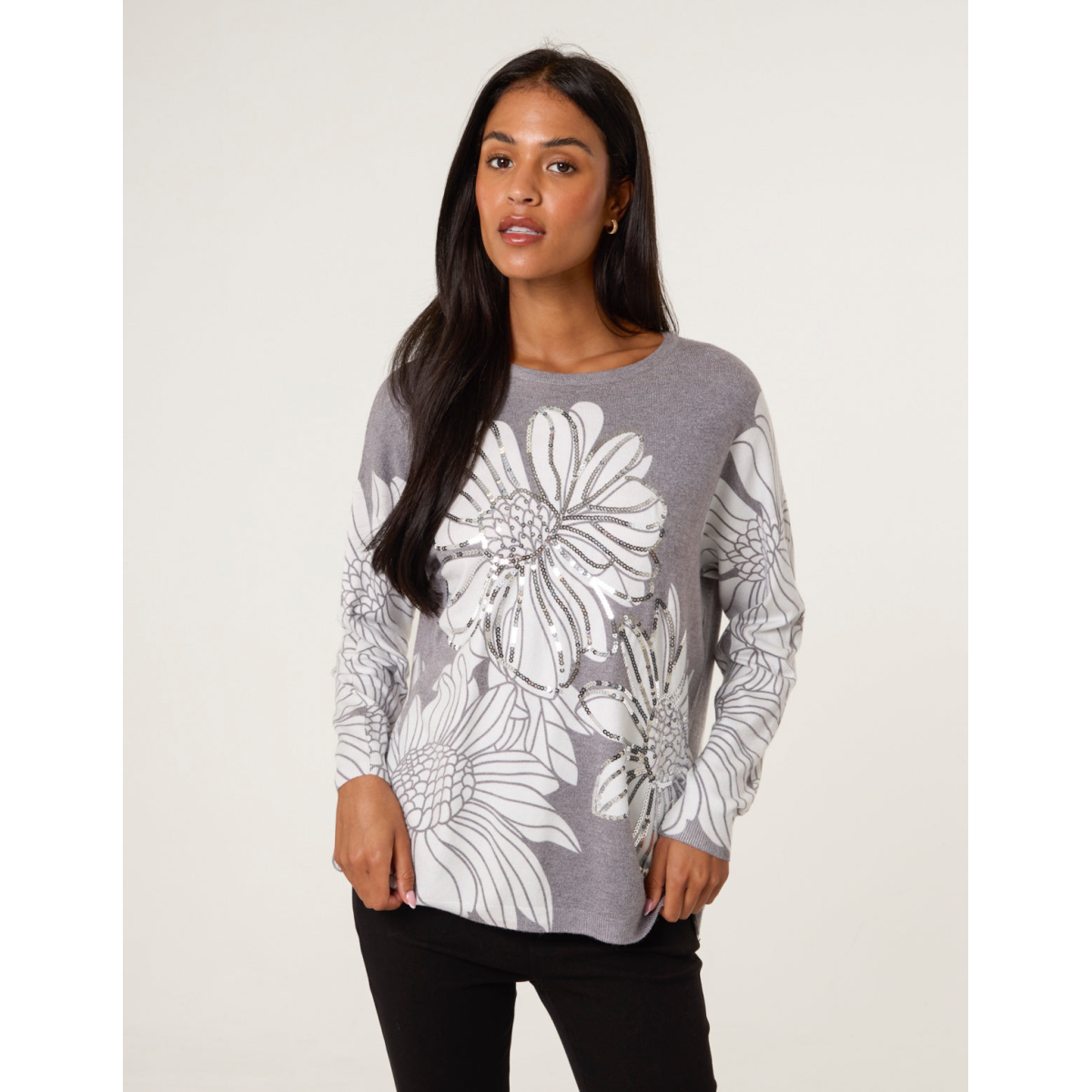The sequins on this flower printed jumper make it a great choice to boost your mood. Keep accessories pared back to let the piece shine.