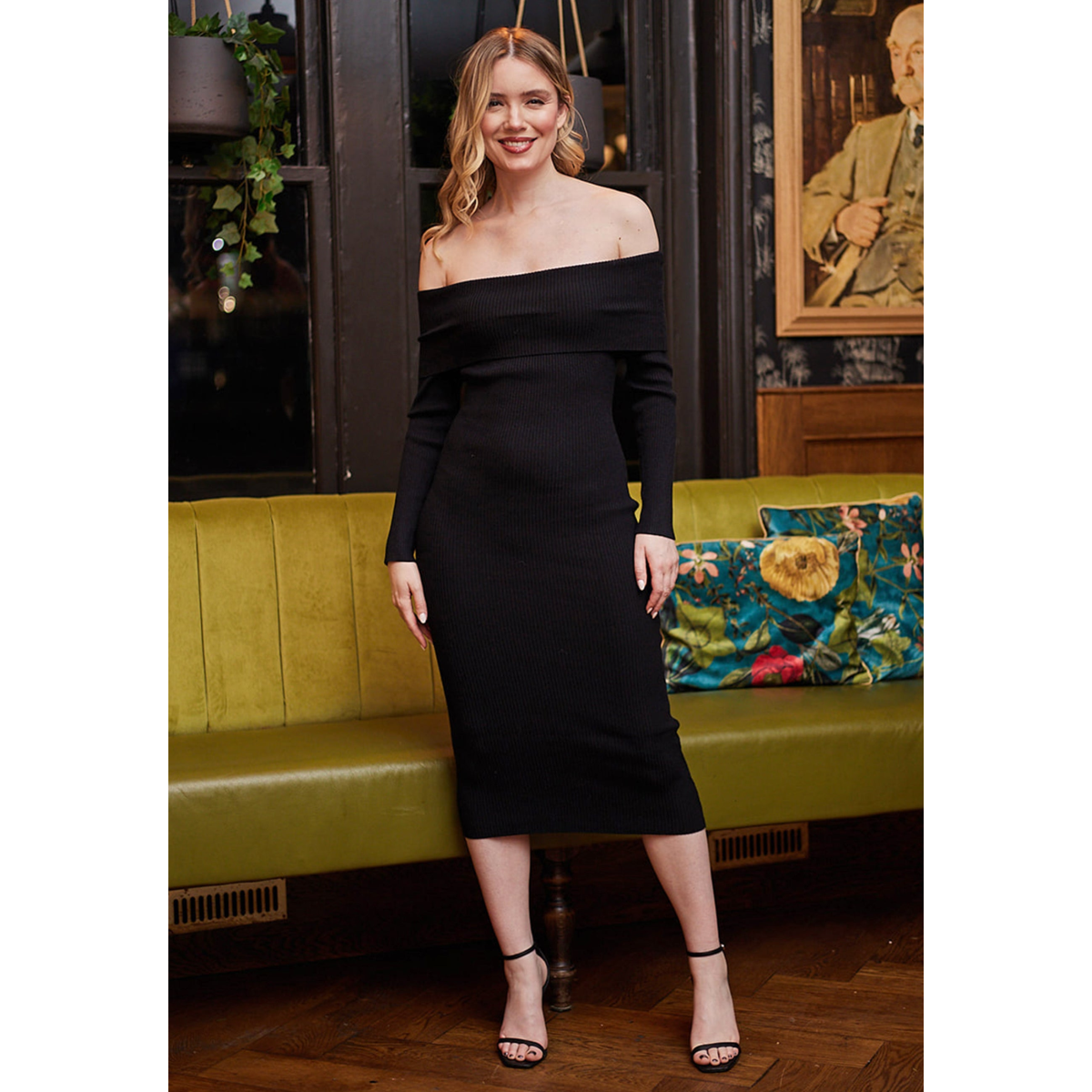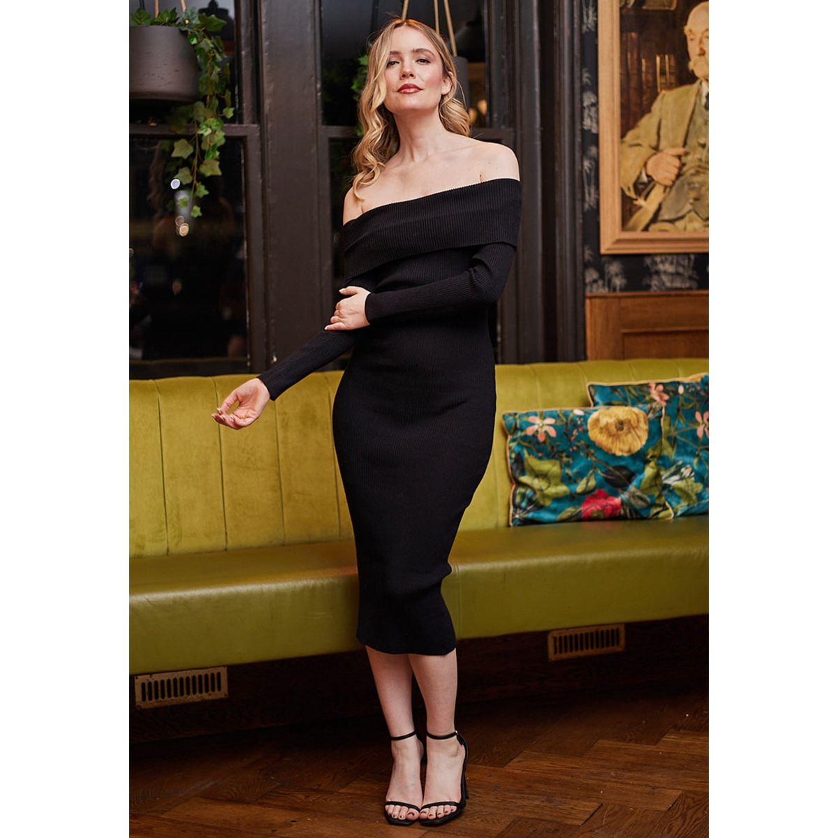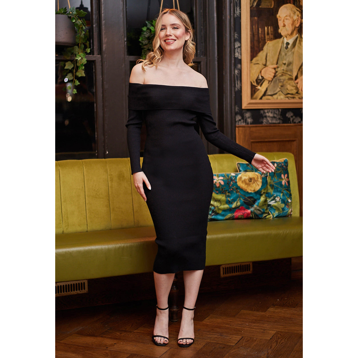 Refine your style with the Midi Bardot Knit Dress in Black. This sophisticated off-the-shoulder design highlights your neckline while the soft knit fabric flatters your curves. A timeless piece perfect for any occasion, it pairs beautifully with heels or ankle boots. Embrace elegance with this must-have dress.