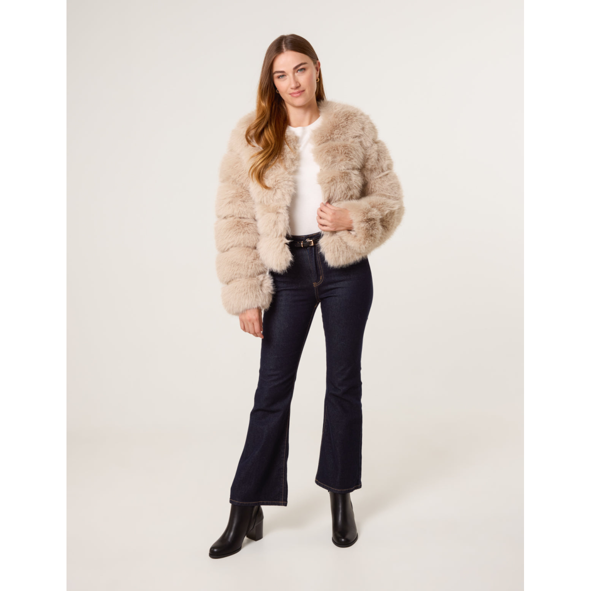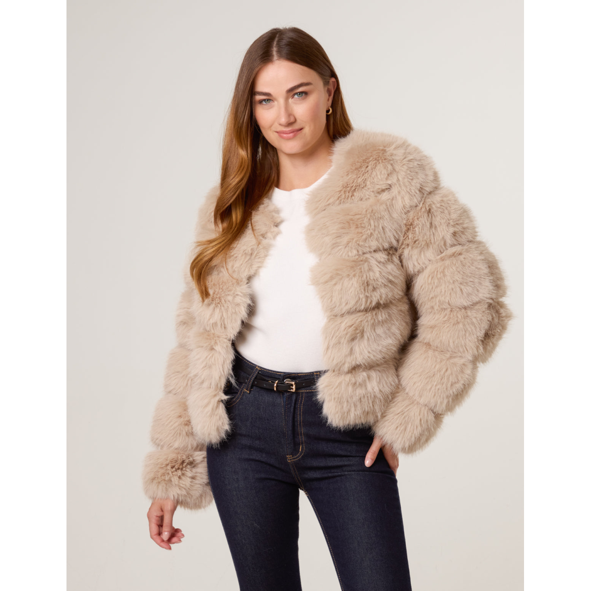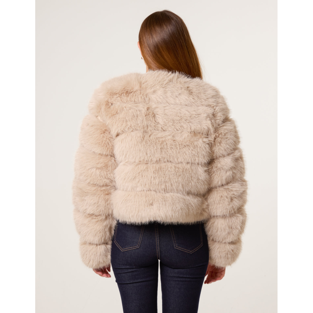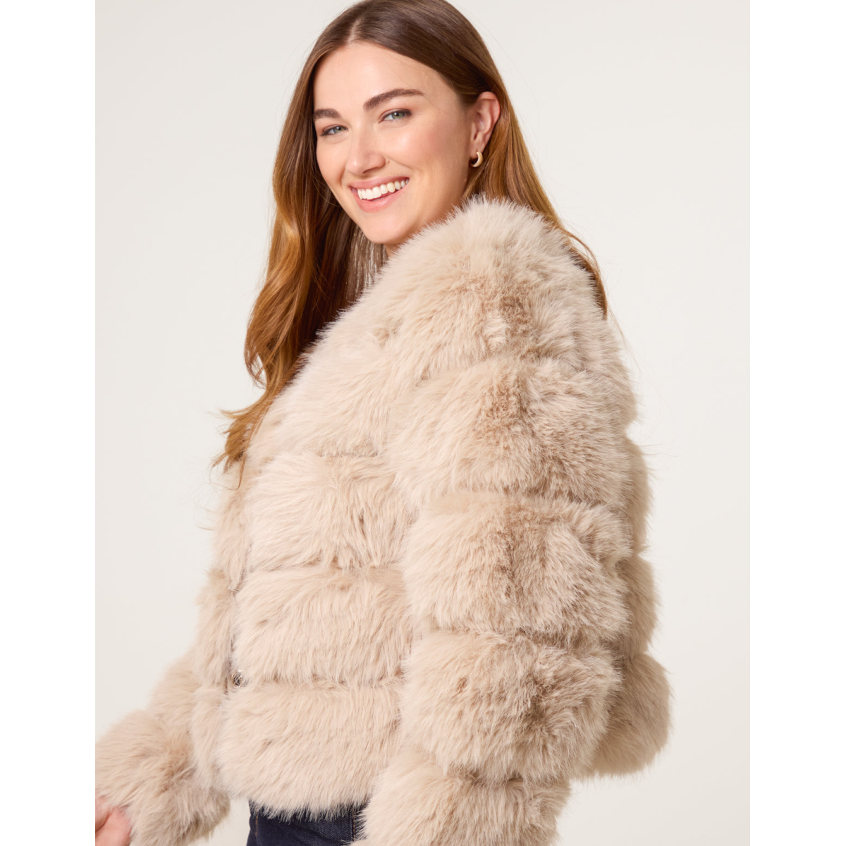 A stunning trimmed faux fur coat with pelted details. This coat will provide all the glam you need all season long.