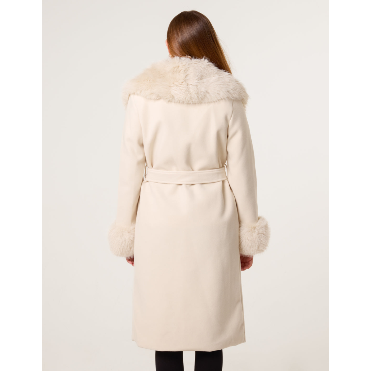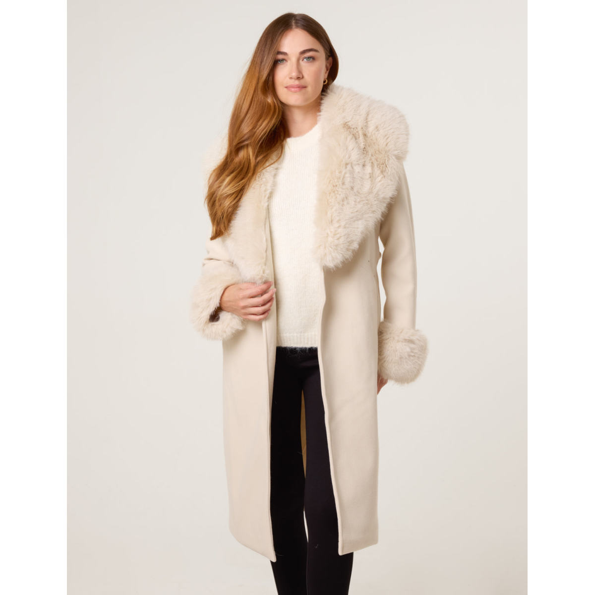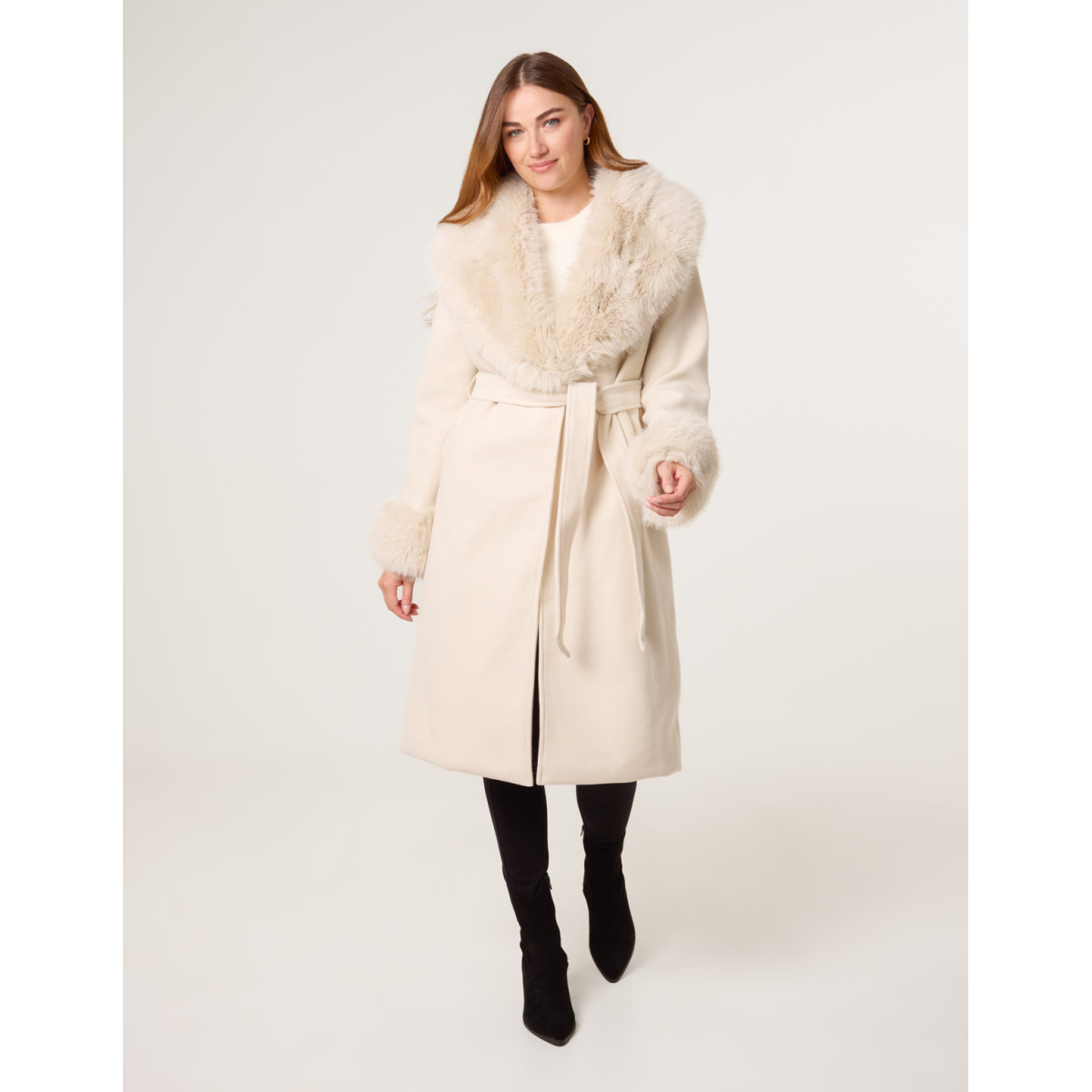 Wrap Front Faux Fur Collar & Cuff Coat