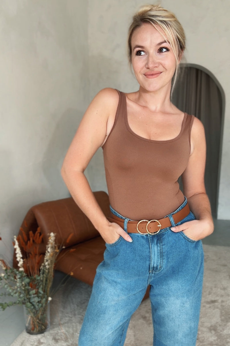 Our new seamless scoop neck shapewear top in mocha will be an essential addition to your wardrobe. Designed to enhance your silhouette, it will be your new go-to top to wear. Wear it with jeans and trainers for a casual look or layer it under a dress.