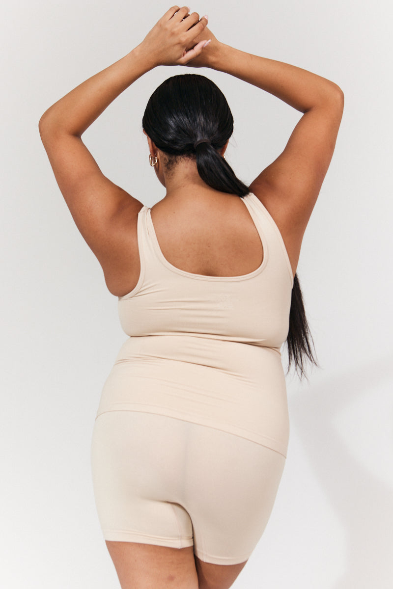 Our new seamless scoop neck shapewear top in sand will be an essential addition to your wardrobe. Designed to enhance your silhouette, it will be your new go-to top to wear. In a subtle gorg colour, this will look so cute styled with jeans or joggers for looks we love.Â