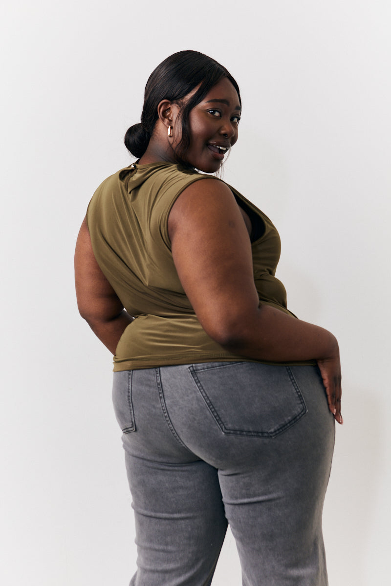 We are loving this khaki slinky cowl front sleeveless top, perfect for a variety of occasions from cocktail parties to nights out with friends. Pair it with a fitted skirt and strappy heels for a glamorous evening look, or keep it casual with high-waisted jeans and ankle boots for an effortlessly chic vibe.