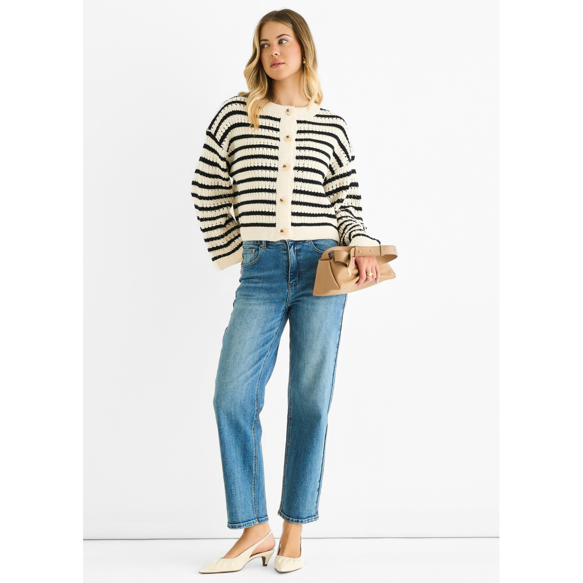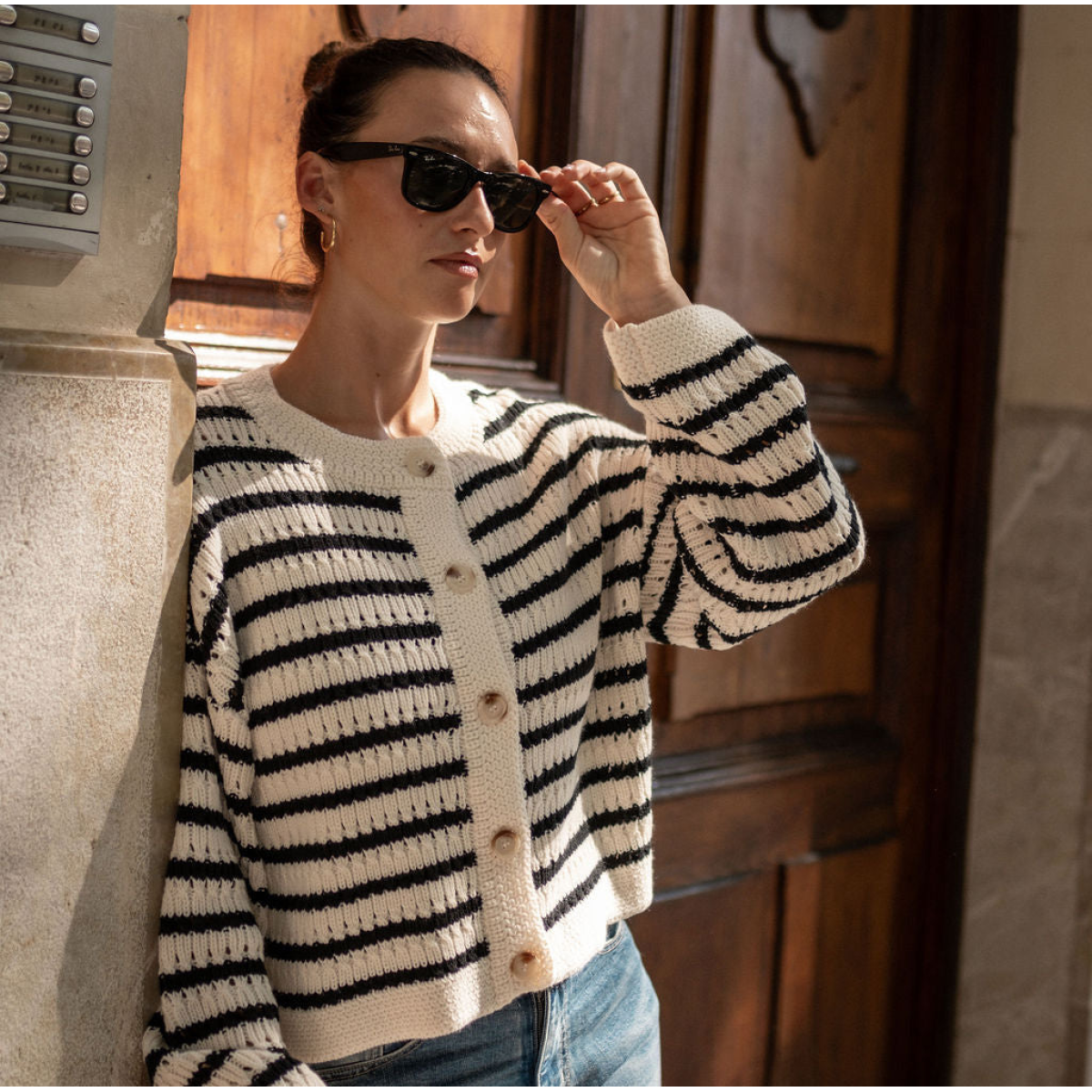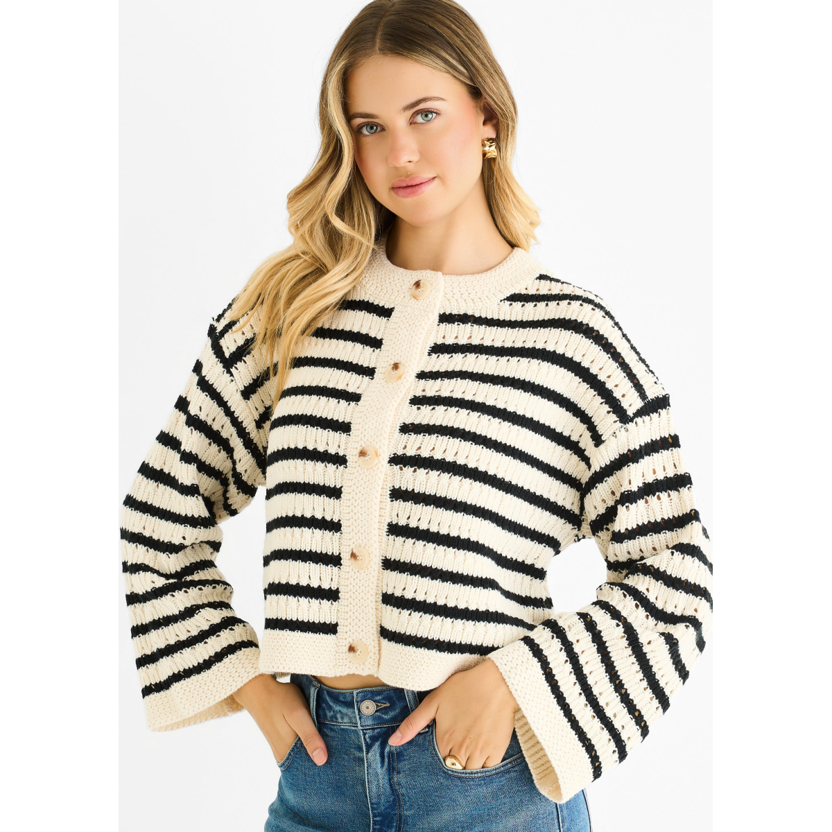 Add a touch of casual comfort to your wardrobe with our Cream Stripe Cable Knit Crop Cardigan. Its bold design and soft knit material make it the perfect addition to any outfit. Keep cozy while staying stylish.