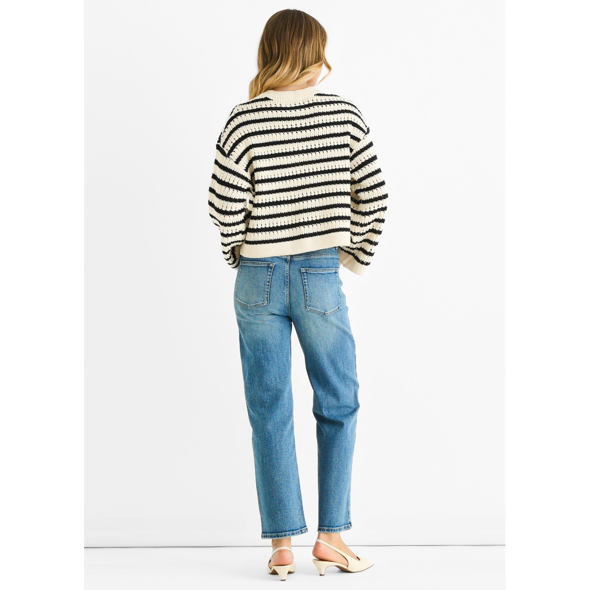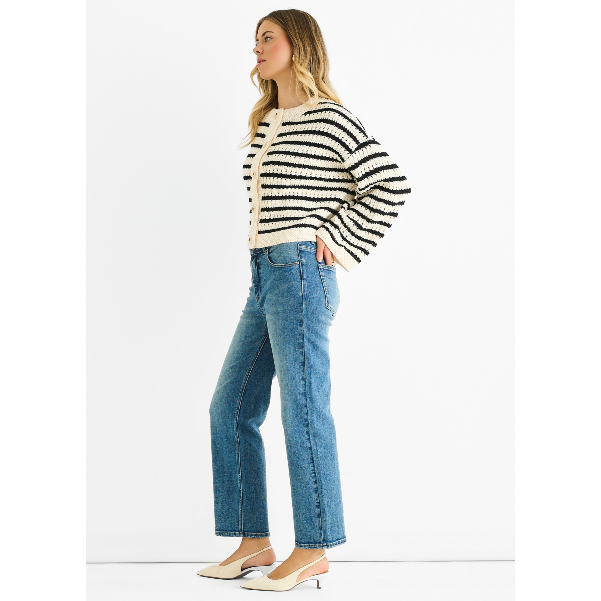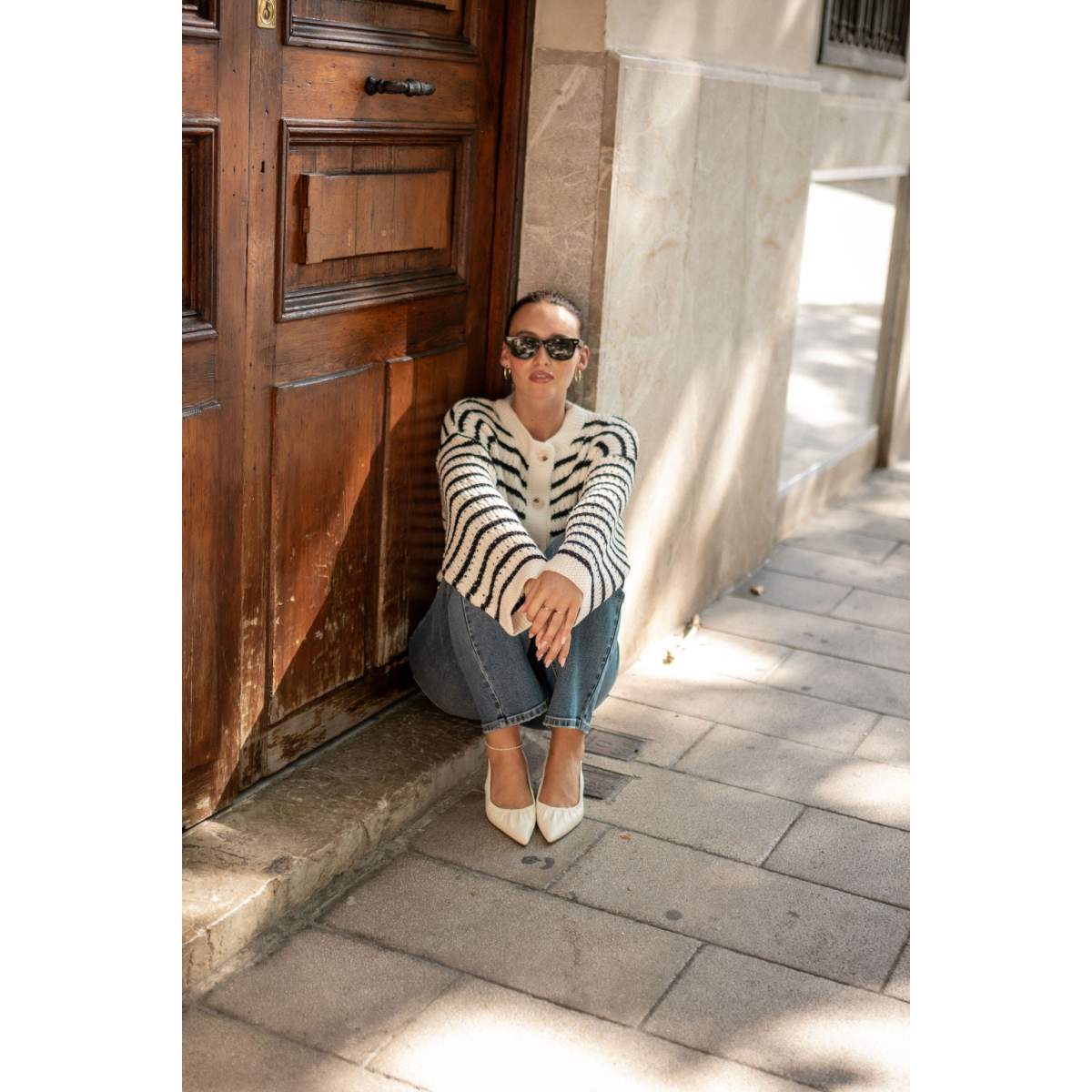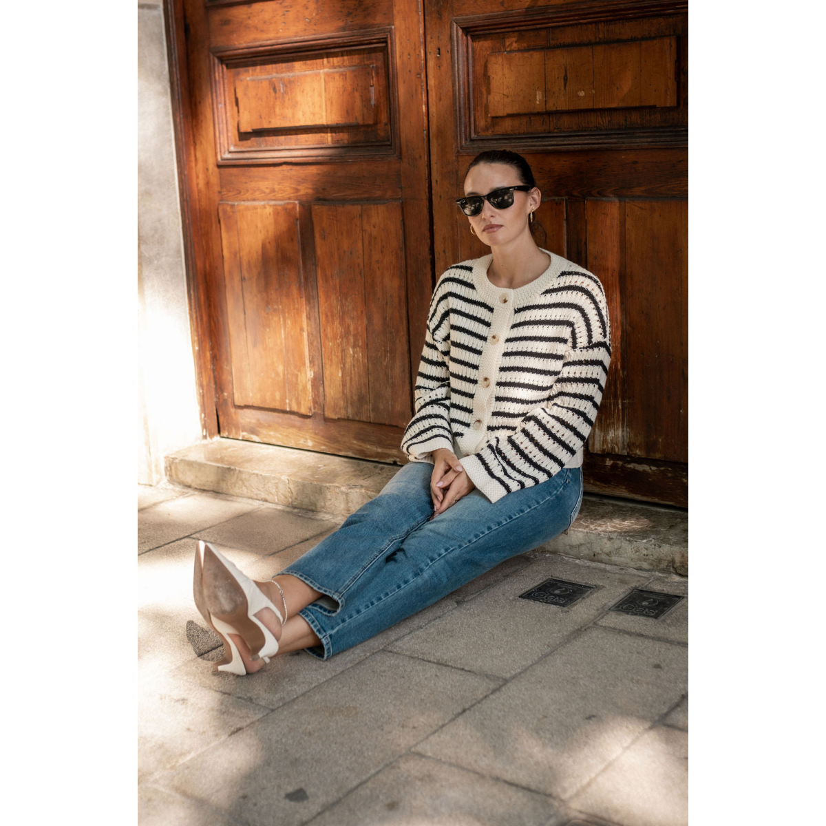 Add a touch of casual comfort to your wardrobe with our Cream Stripe Cable Knit Crop Cardigan. Its bold design and soft knit material make it the perfect addition to any outfit. Keep cozy while staying stylish.