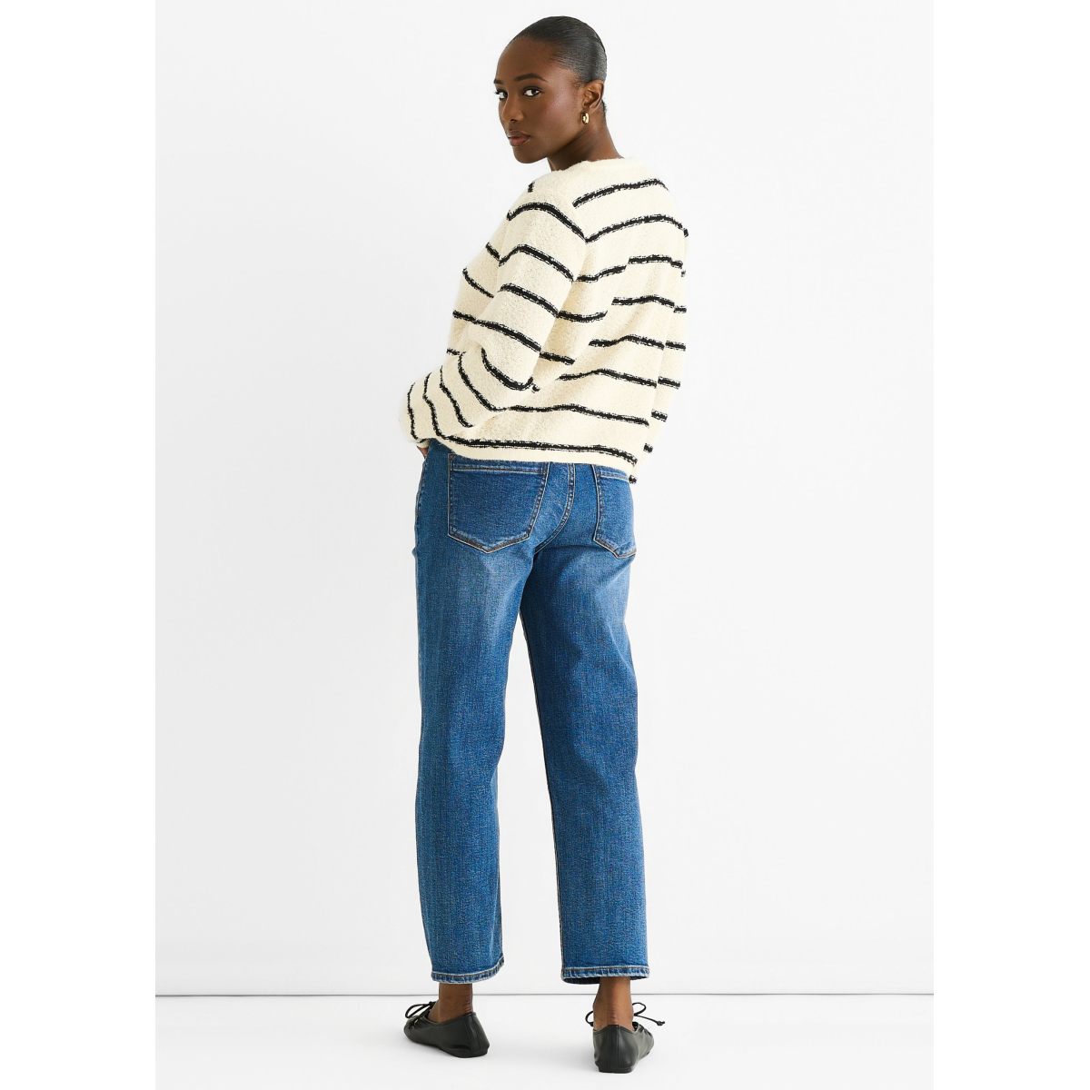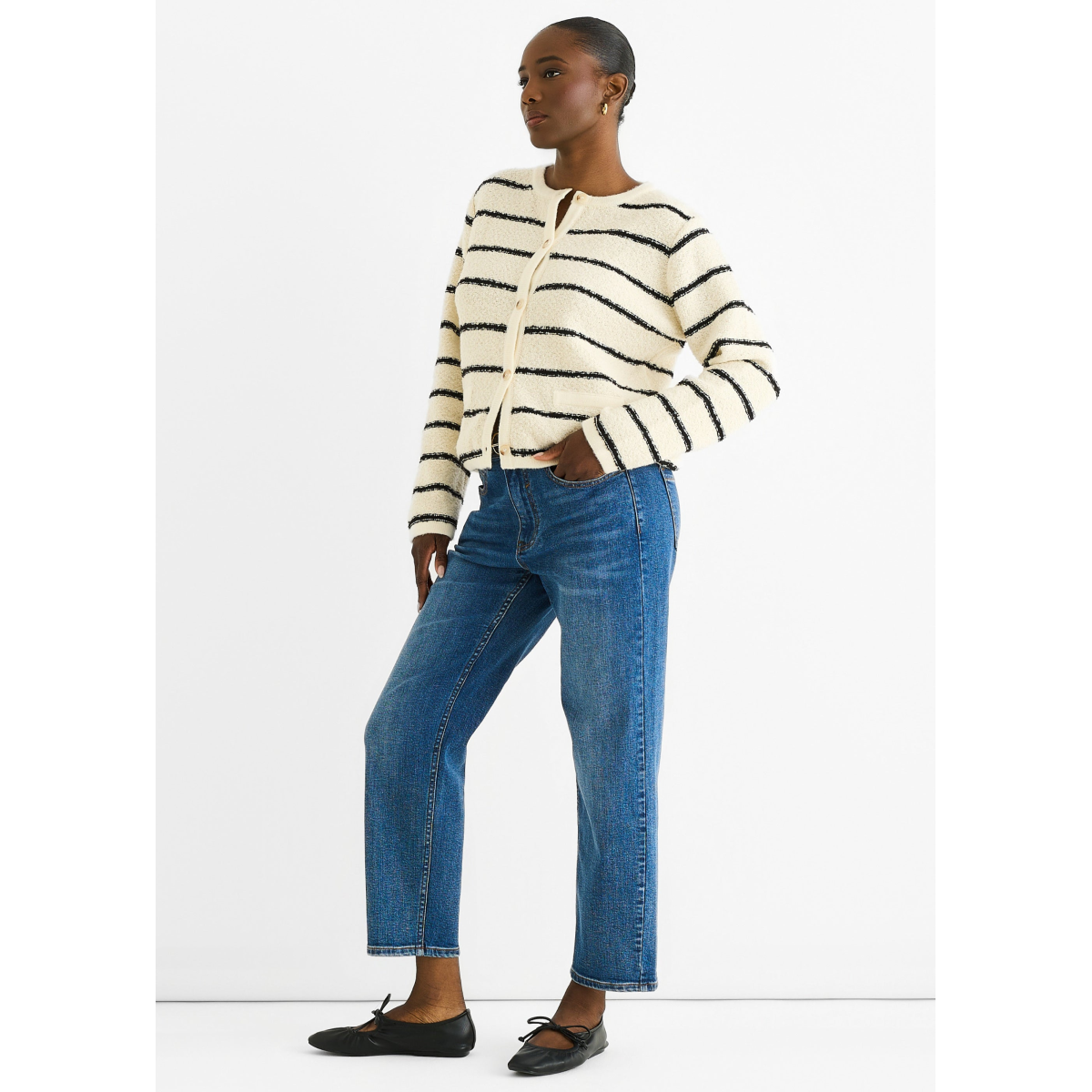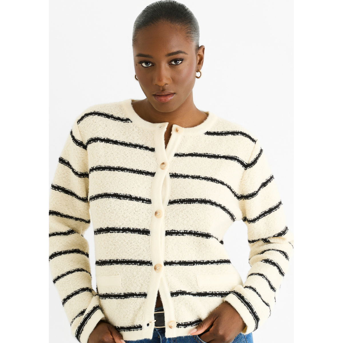 The Cream Stripe Boucle Recycle Knit Cardigan offers a bold, casual look with a comfortable fit. Made from recycled yarns, this cropped cardigan features striking cream stripes and a military-inspired design, perfect for adding an eco-conscious statement to your everyday outfits.