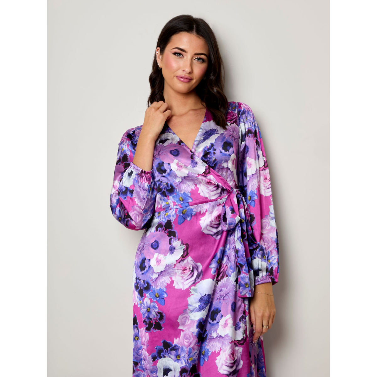 Plus Size Long Sleeve Floral Wrap Dress in Purple