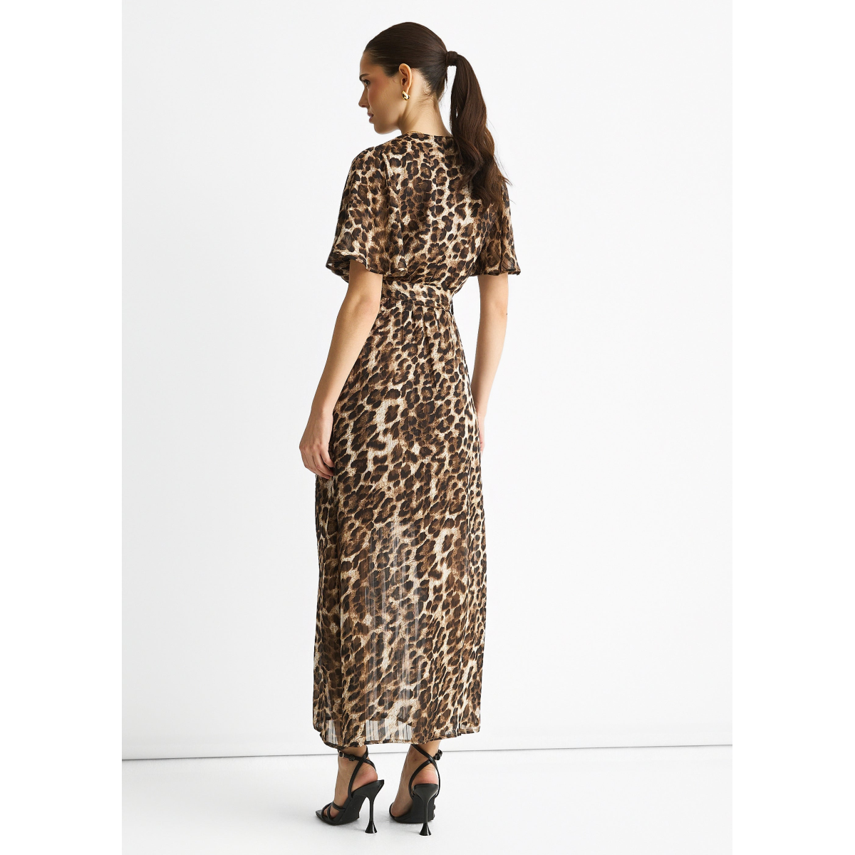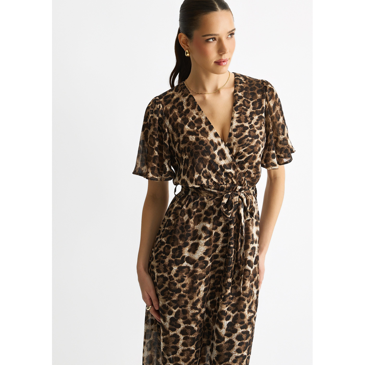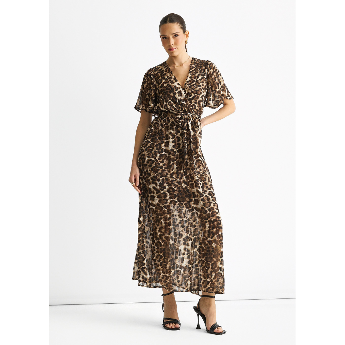 This Brown Chiffon Animal Lurex Stripe Wrap Midi Dress combines effortless comfort with a bold, stylish edge. The lightweight chiffon fabric drapes beautifully, while the animal print and subtle lurex stripes add a touch of daring sparkle. Its wrap design flatters your silhouette, making it perfect for casual outings or standout daytime events.Â