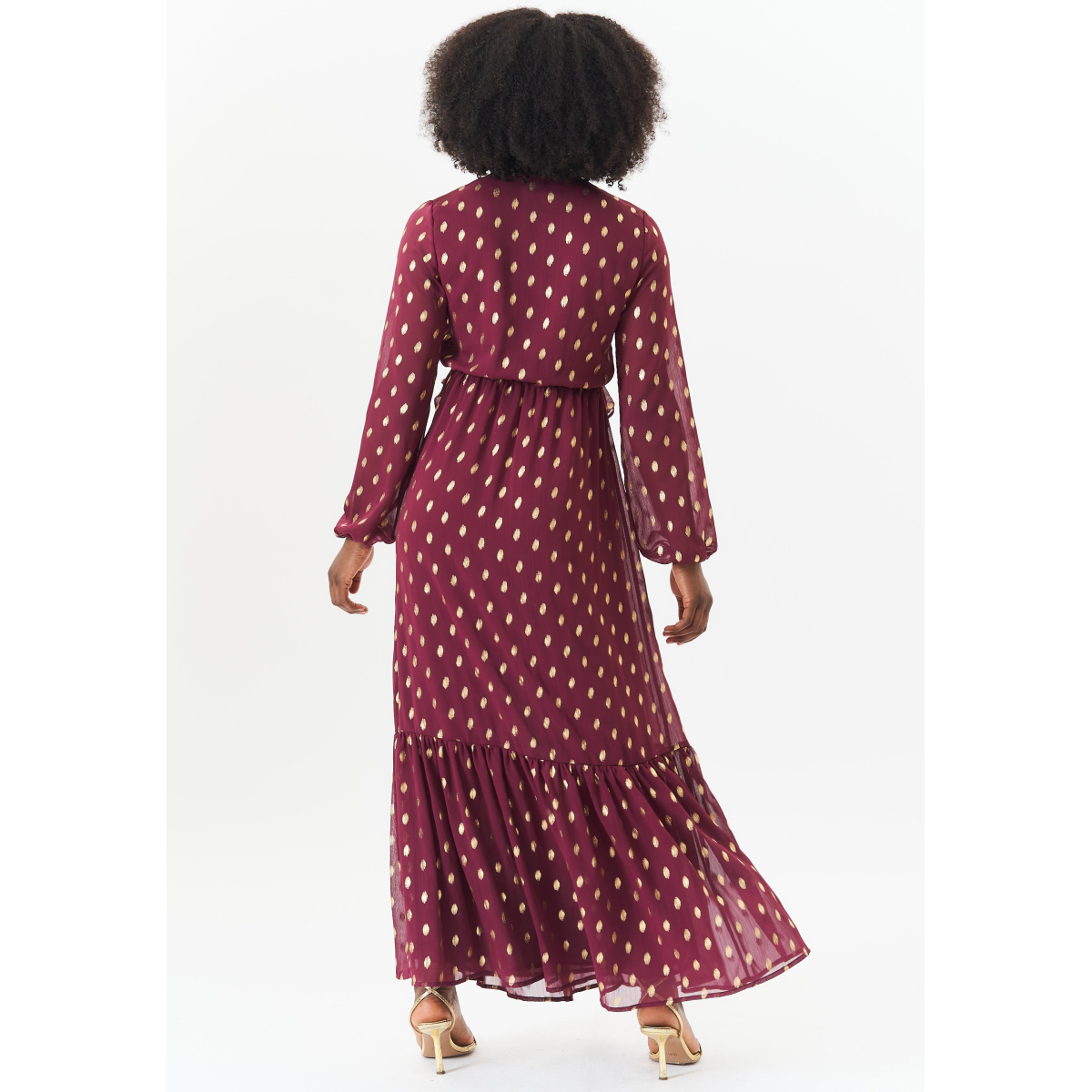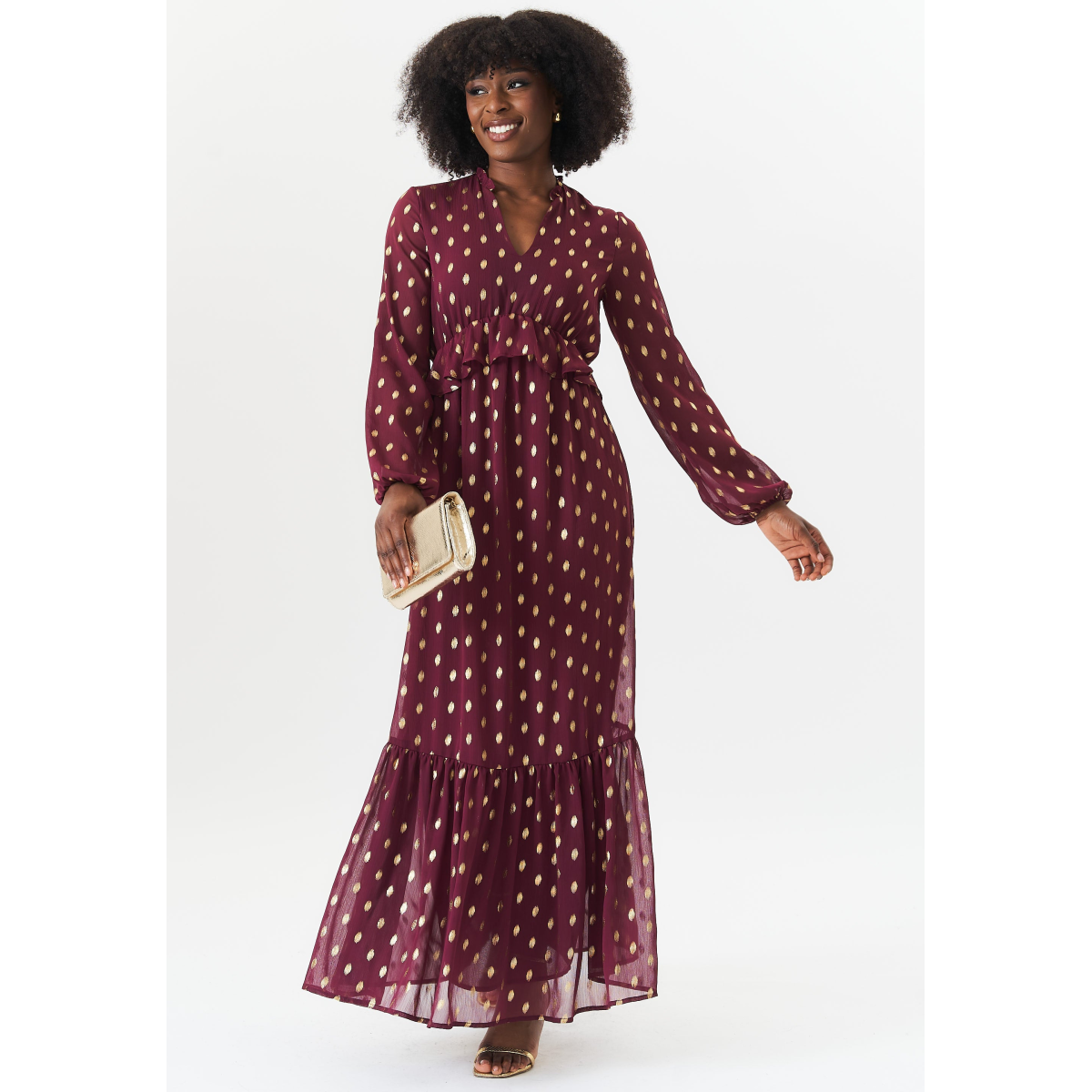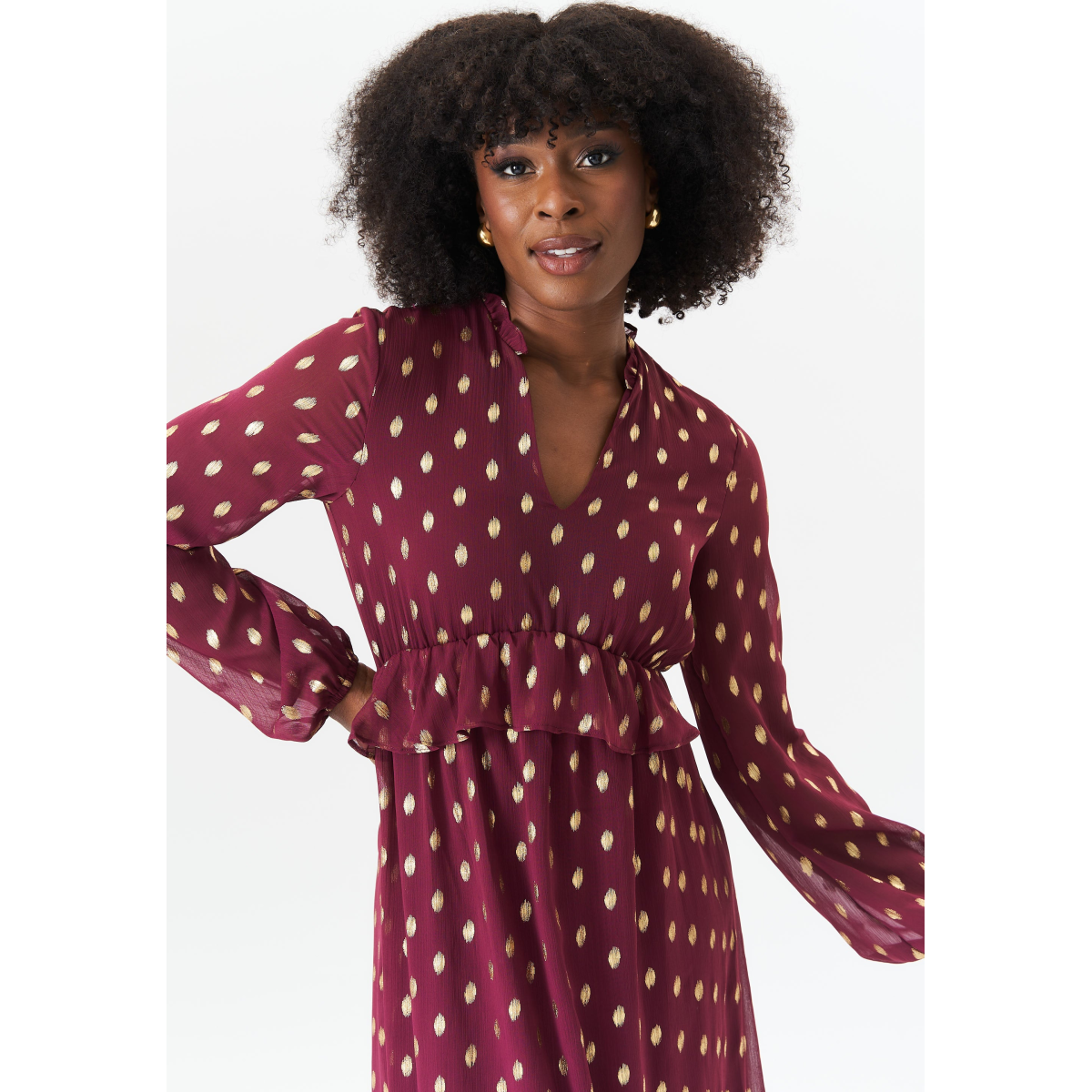 Add a touch of glamour to your wardrobe with our Burgundy Foil Print Ruffle Midi Dress. The rich burgundy colour and elegant ruffle detailing make this dress perfect for any special occasion. The foil print adds a subtle shine, making you stand out in style.