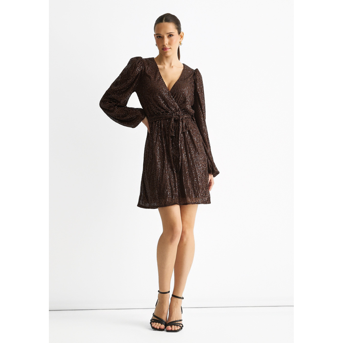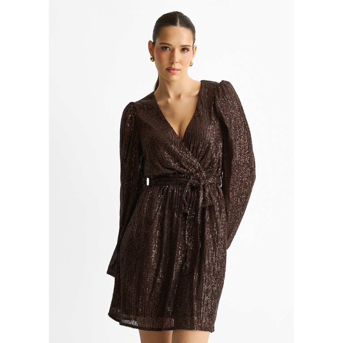 This Chocolate Sequin V Neck Belted Mini Dress combines bold sparkle with casual comfort. Its flattering V-neck and adjustable belt create a confident silhouette, while the mini length adds a playful touch.