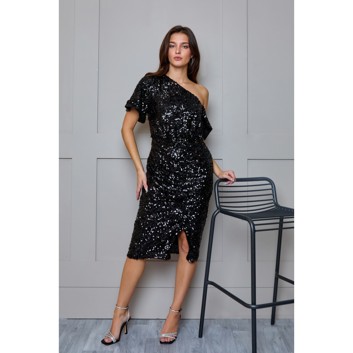 Plus Size One Shoulder Ruched Sequin Midi Dress in Black