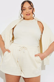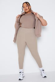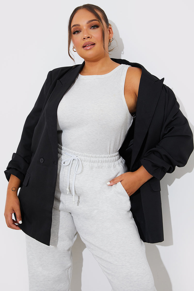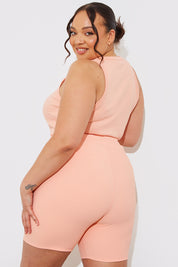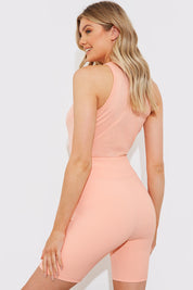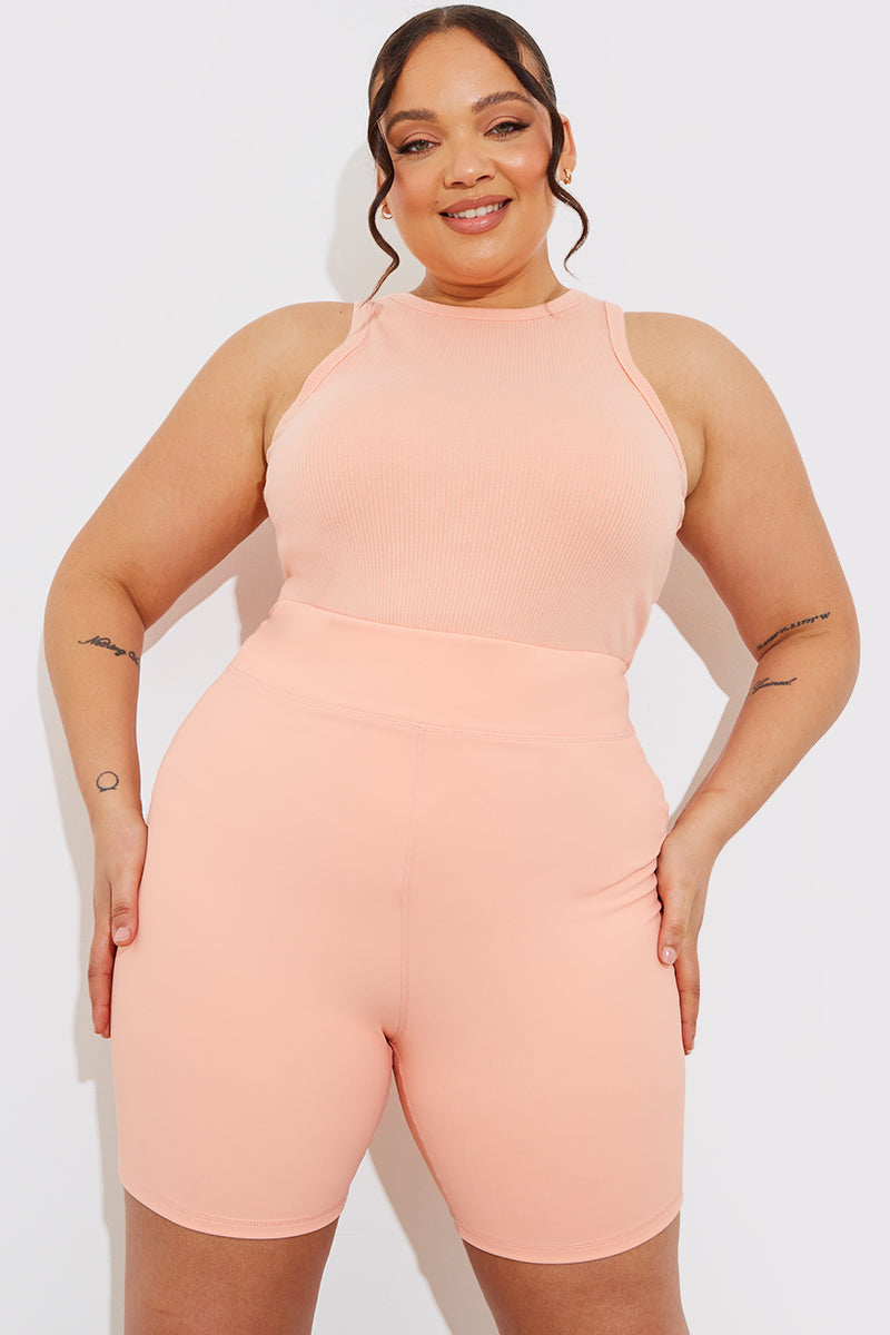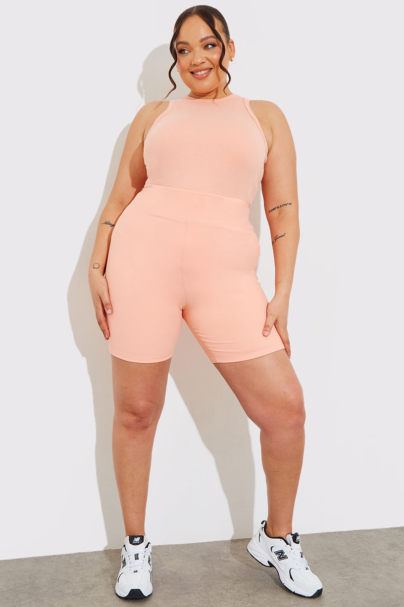 We are loving this top in peach with a ribbed material and racer style for the perfect layering piece this season!