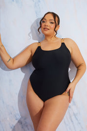 Make a statement in this season in this gorgeous swimsuit featuring a gorgeous black material and ring detail design we are loving. Style with a sarong and wedges for a chic look.
