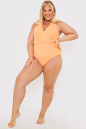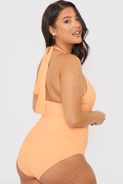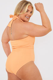 Steal the show this season in this gorgeous swimsuit. Featuring a gorgeous textured orange fabric with a v halter neck and tie waist, style with sandals and your favourite accessories for the ultimate summer vibe.