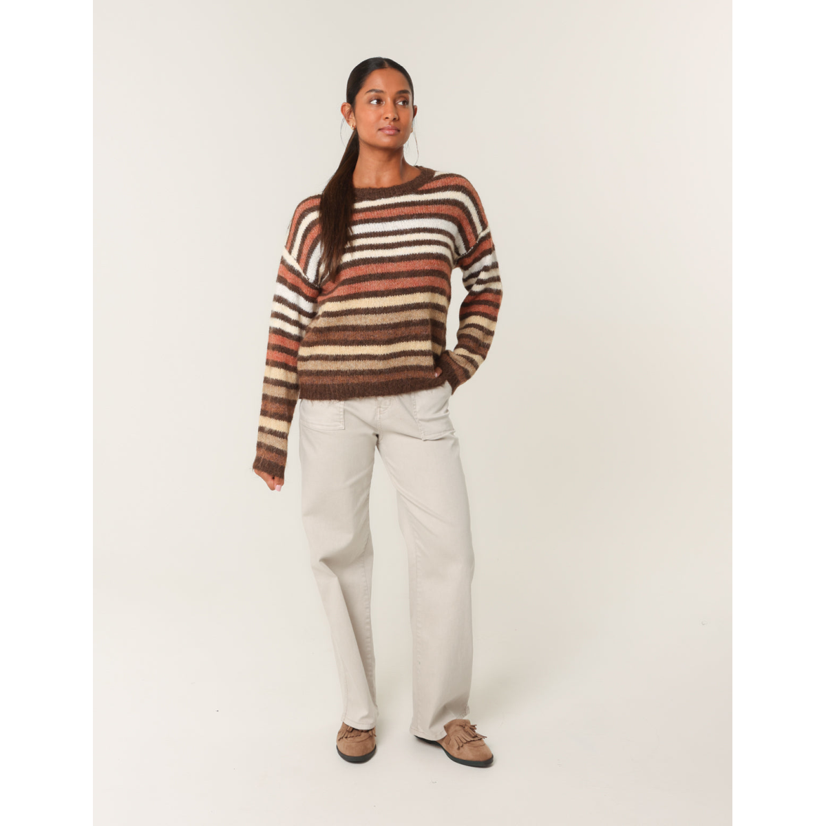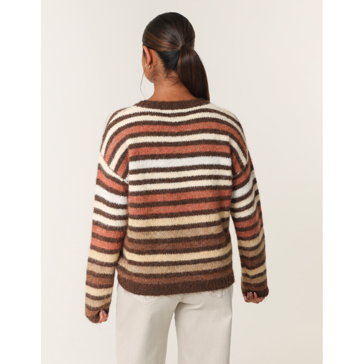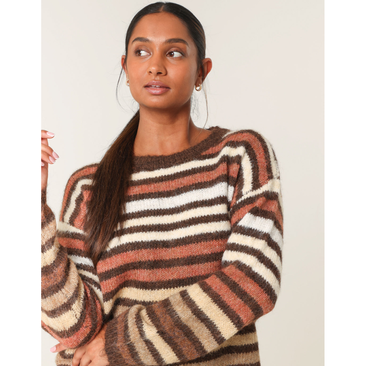 And a retro feel to our every day look. Team this block colour stripped jumper with flared jeans and chunky boots.