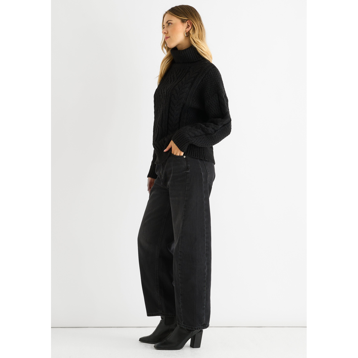 This Black Cable Knit High Neck Jumper combines cozy comfort with a bold, casual look. The intricate cable knit design adds texture and style, while the high neck ensures warmth on cooler days. Perfect for relaxed outings, it’s a versatile piece that keeps you comfortable and confidently dressed.