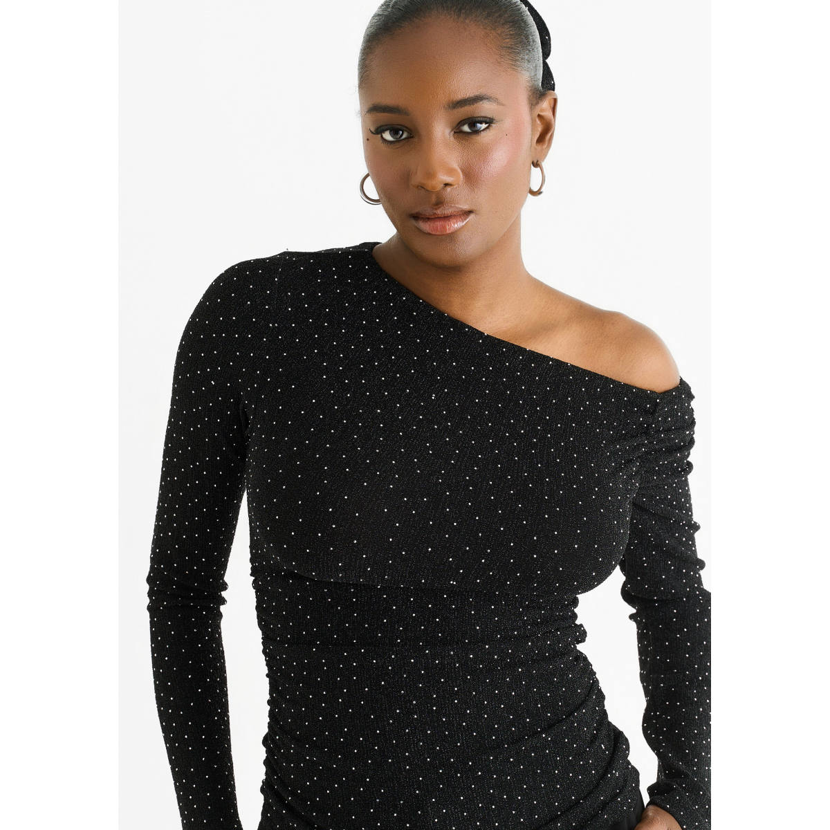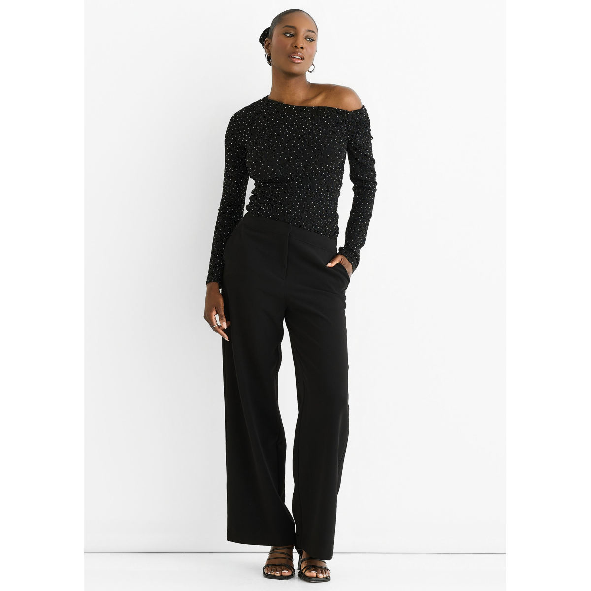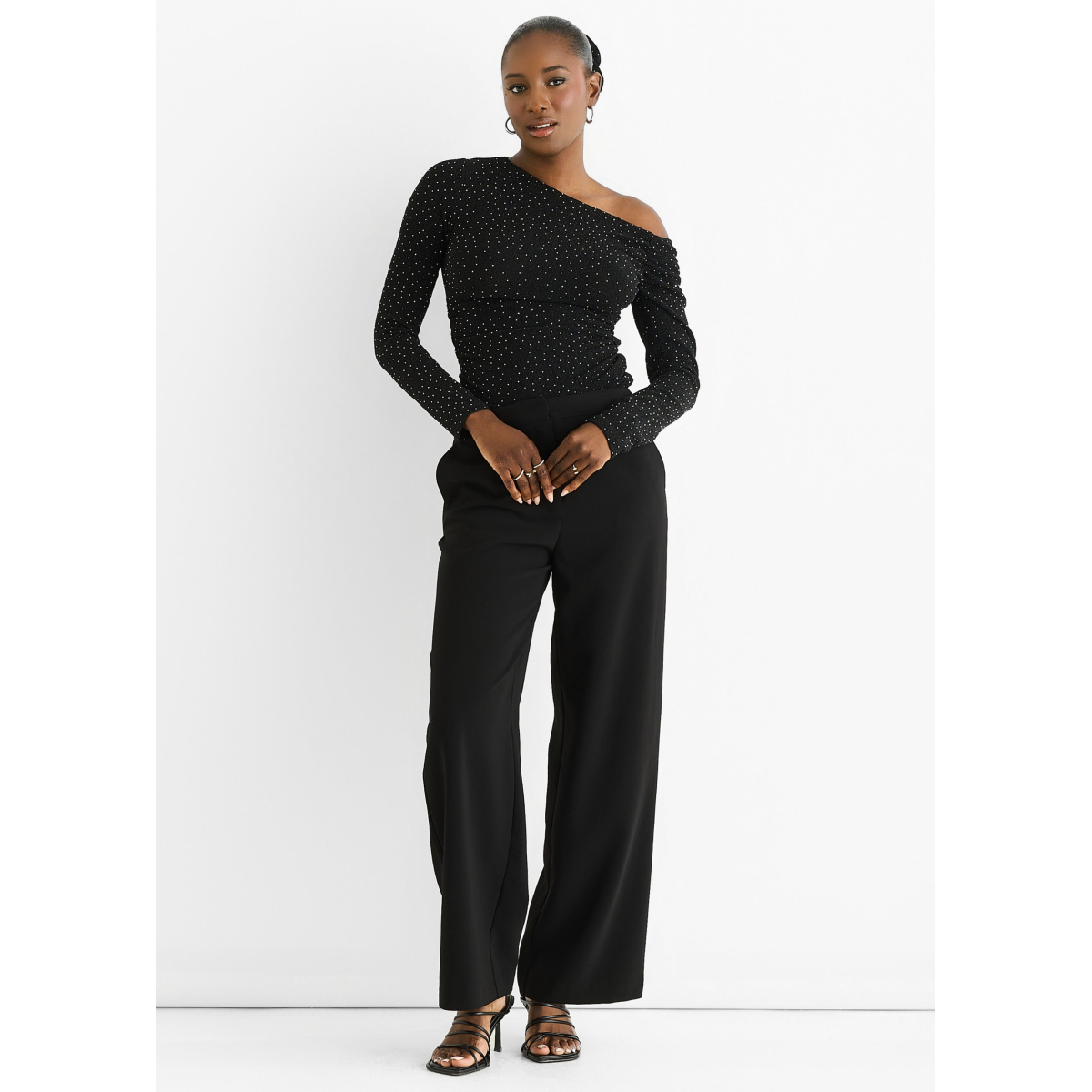 The Black Diamante Slash Neck Top offers a perfect blend of casual comfort and bold style. Its unique slash neckline is highlighted with sparkling diamante details, adding a touch of glamour to your everyday outfit. Crafted for a relaxed fit, this top ensures all-day ease while helping you stand out with confidence.