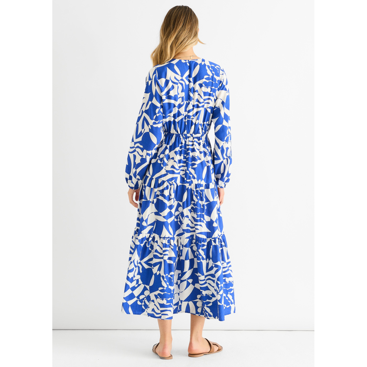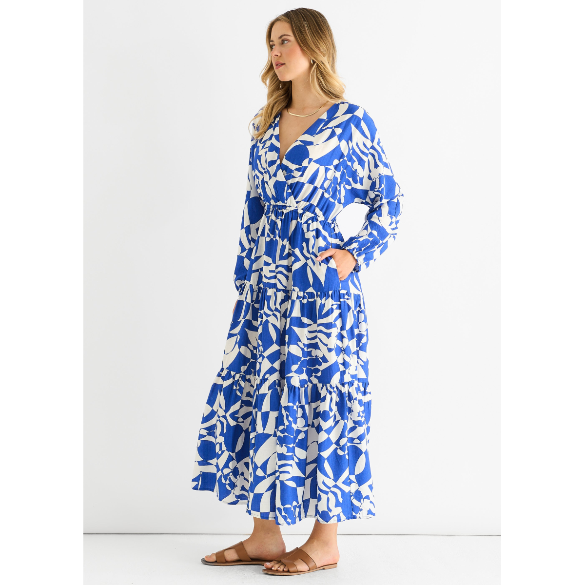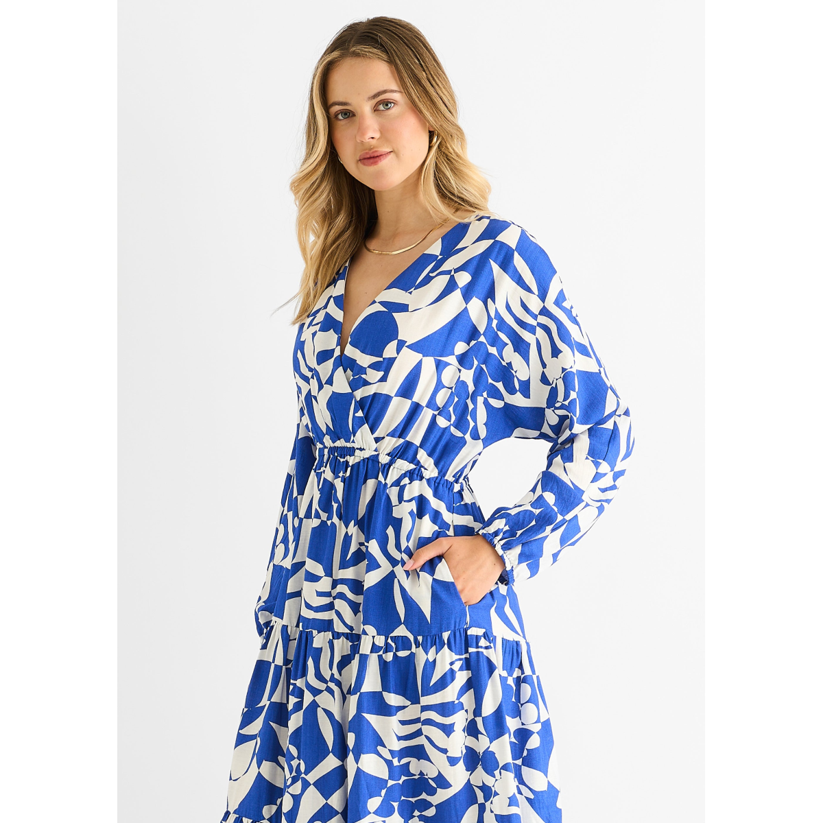 Blue Abstract Wrap Elasticated Waist Midaxi Dress