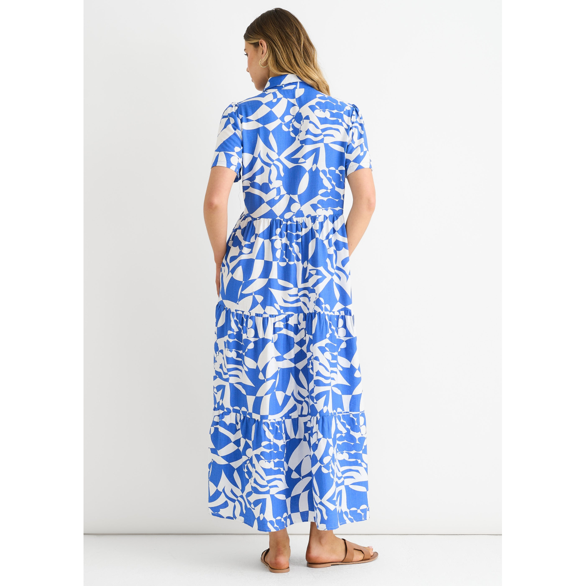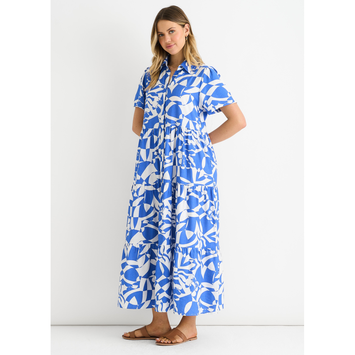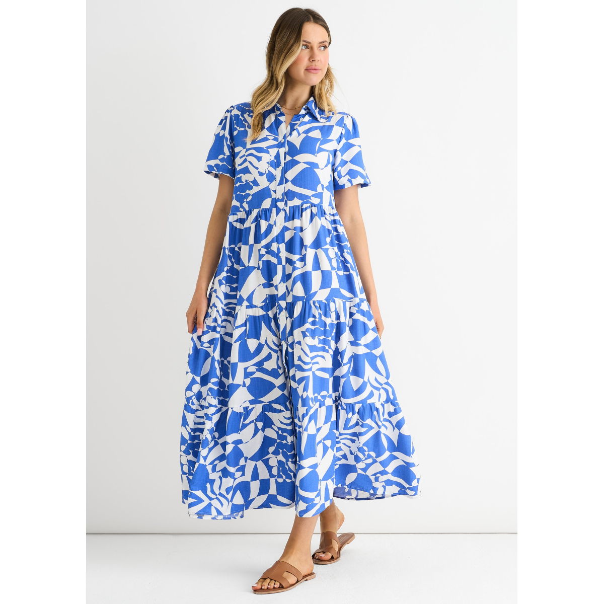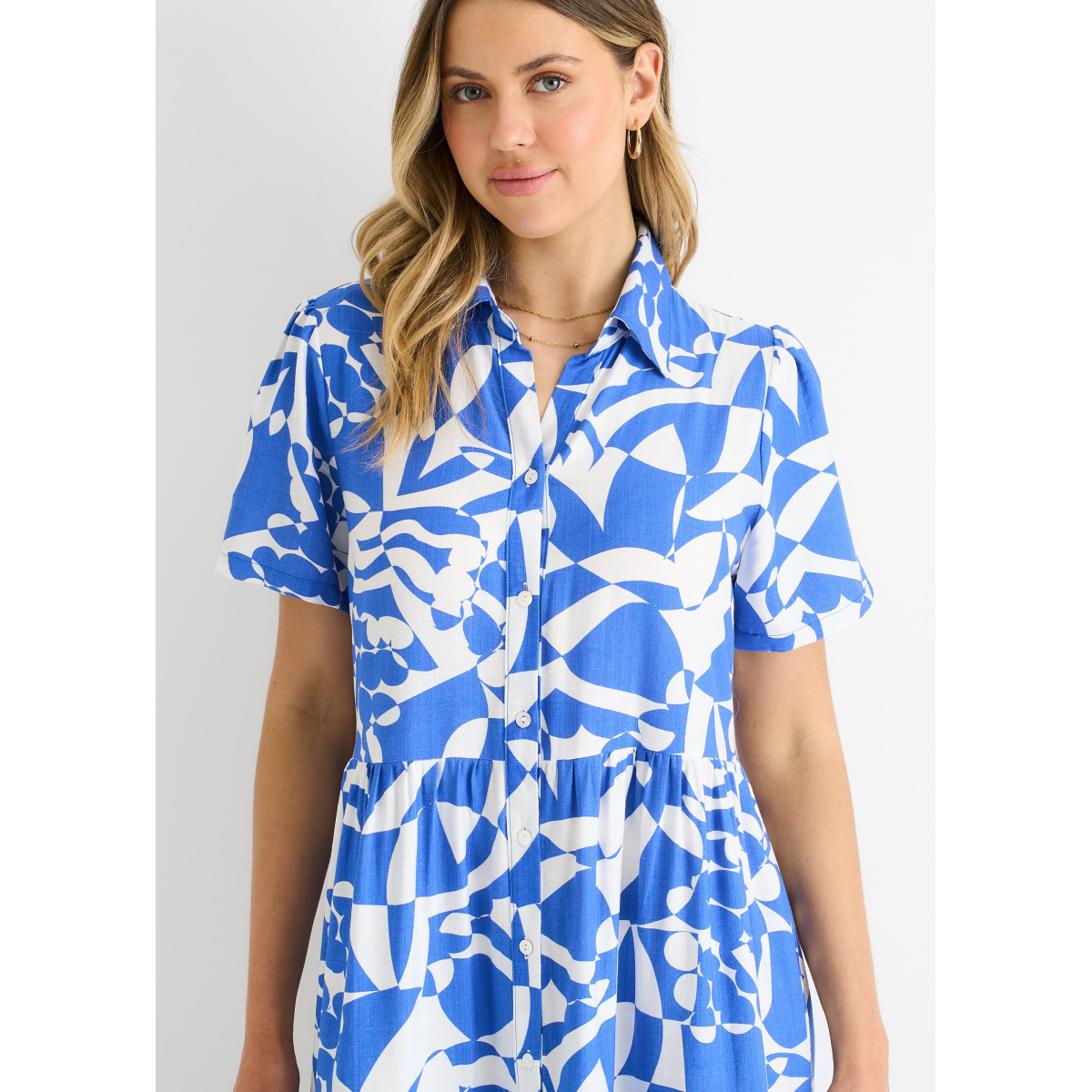 This blue Aztec print oversized smock midi dress is perfect for any occasion. The striking print adds a unique touch to this flowy, comfortable dress. This effortlessly stylish blue and white aztec print oversized smock midi dress is perfect for any occasion. The striking print adds a unique touch to this flowy, comfortable dress. The collared neckline and button-down front compliment the flowing skirt to make you saunter through the summer. Add your favourite sandals and you're ready to go.