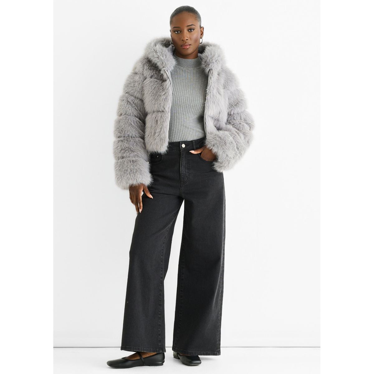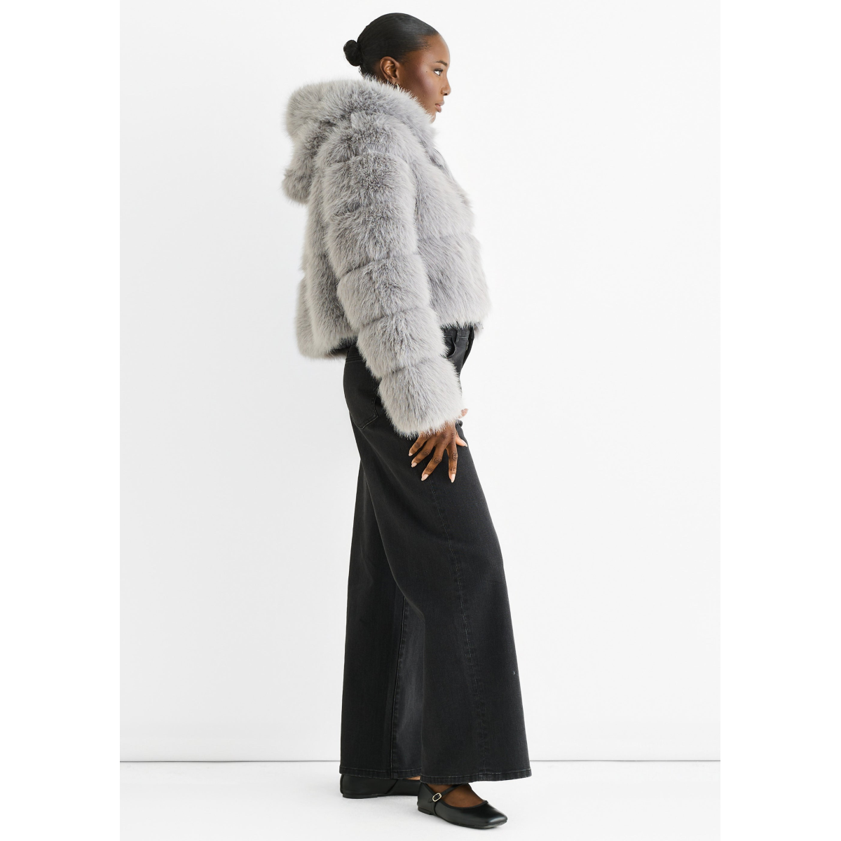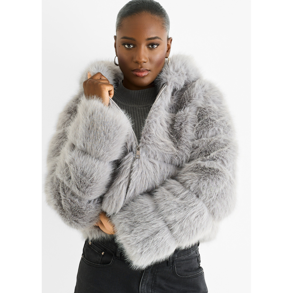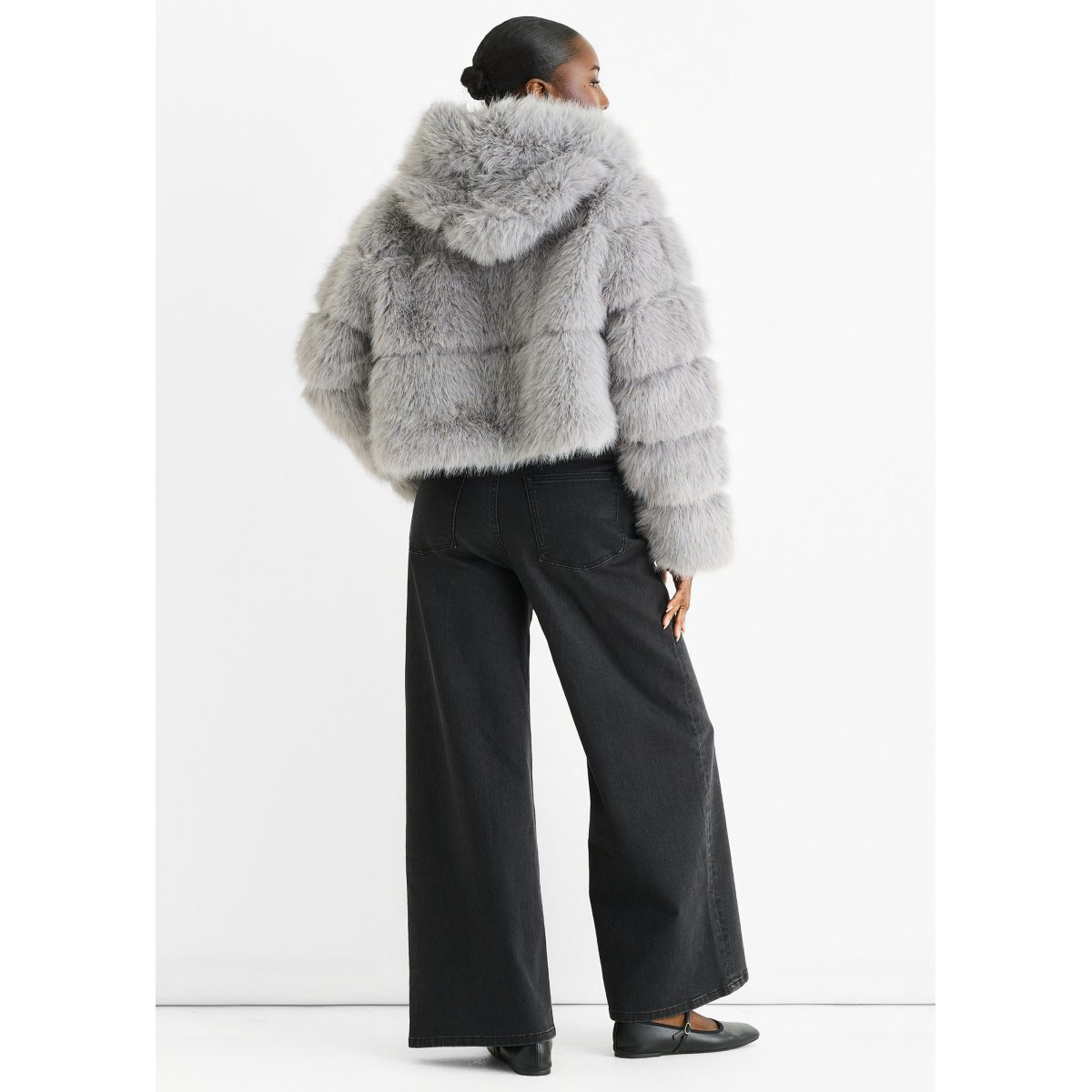 Light Grey Panel Faux Fur Zip Front Hooded Jacket