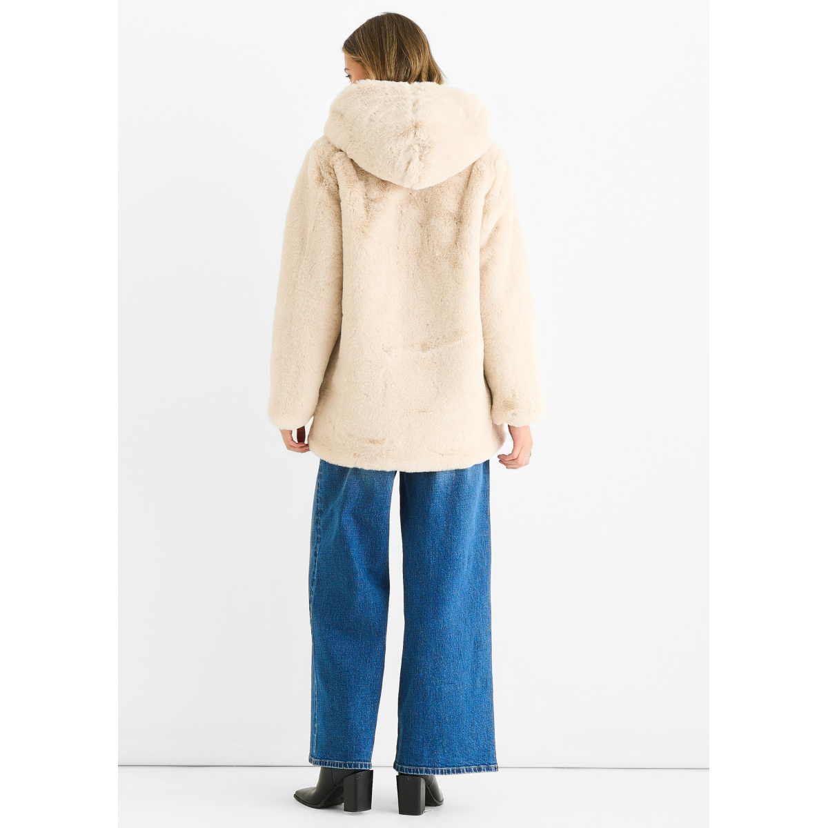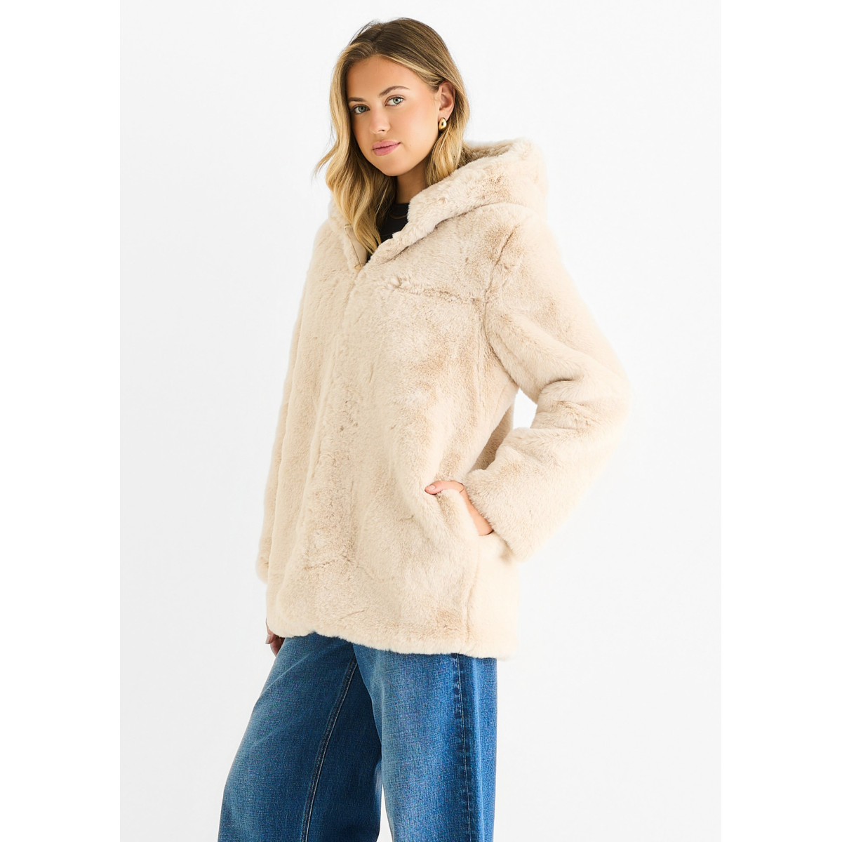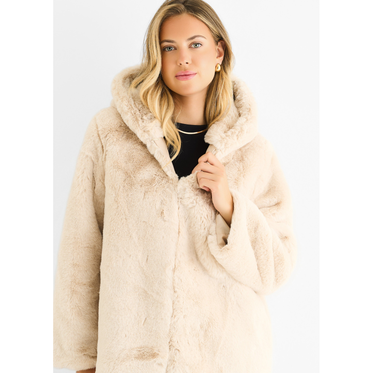 Stone Hooded Long Sleeve Faux Fur Jacket